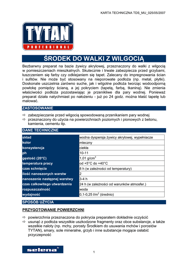 KARTA TECHNICZNA TDS_MU_025/05/2007 ŚRODEK DO WALKI Z WILGOCIĄ Bezbarwny preparat na bazie żywicy akrylowej, przeznaczony do walki z wilgocią w pomieszczeniach mieszkalnych. Skutecznie i trwale zabezpiecza przed grzybami, łuszczeniem się farby czy odklejaniem się tapet. Zalecany do impregnowania ścian i sufitów. Nie może być stosowany na nieporowate podłoża (np. metal, płytki). Doskonale uszczelnia zarówno suche, jak i wilgotne podłoża tworząc wodoodporną powłokę pomiędzy ścianą, a jej pokryciem (tapetą, farbą, tkaniną). Nie zmienia właściwości podłoża pozostawiając je przenikliwe dla pary wodnej. Ponieważ preparat działa natychmiast po nałożeniu - już po 24 godz. można kłaść tapetę lub malować. ZASTOSOWANIE zabezpieczanie przed wilgocią spowodowaną przenikaniem pary wodnej przeznaczony do użycia na powierzchniach poziomych i pionowych z betonu, kamienia, cementu itp. DANE TECHNICZNE skład kolor konsystencja ph gęstość (20°C) temperatura pracy czas schnięcia ilość nanoszonych warstw nanoszenie następnej warstwy czas całkowitego utwardzenia rozpuszczalność wydajność wodna dyspersja żywicy akrylowej, wypełniacze mleczny ciekła 10-11 1,01 g/cm3 od +5°C do +40°C 8 h (w zależności od temperatury) 2 3-4 h 24 h (w zależności od warunków atmosfer.) woda 0,1-0,25 l/m2 (średnio) SPOSÓB UŻYCIA PRZYGOTOWANIE POWIERZCHNI powierzchnia przeznaczona do pokrycia preparatem dokładnie oczyścić usunąć z podłoża wszystkie uszkodzone fragmenty oraz obce substancje, a także wszelkie naloty (np. mchy, porosty Środkiem do usuwania mchów i porostów TYTAN), smary, sole mineralne, grzyb i inne substancje mogące osłabić przyczepność 1 KARTA TECHNICZNA TDS_MU_025/05/2007 należy uszczelnić rysy i pęknięcia, a większe ubytki wypełnić zaprawą lub zaszpachlować powierzchnie zabrudzone sadzą lub pyłem zmyć strumieniem wody pod ciśnieniem NAKŁADANIE przed użyciem preparat dokładnie wymieszać na powierzchnię nakładać za pomocą pędzla lub wałka minimalna temperatura podczas pracy wynosi +5oC (dotyczy zarówno temperatury podłoża, jak i otoczenia) właściwe pokrycie powierzchni otrzymamy po nałożeniu co najmniej dwóch warstw preparatu (do całkowitego nasycenia powierzchni). W przypadku zbyt chłonnego podłoża wskazane jest nałożenie trzeciej warstwy kolejna warstwa musi być nałożona w kierunku prostopadłym do kierunku nakładania poprzedniej warstwy - w celu zapewnienia właściwego krycia po upływie 24 h można powierzchnię tapetować lub malować, farbami wodnymi i na bazie rozpuszczalników narzędzia czyścić benzyną lakierniczą lub acetonem po zakończeniu pracy OPAKOWANIA I PRZECHOWYWANIE Produkt pakowany jest w pojemniki o poj. 0,75 litra i 2,5 litra. Przechowywać 2 lata, w szczelnie zamkniętych opakowaniach w suchych, chłodnych pomieszczeniach w temp. od +5C do + 20C. Z dala od źródeł ognia i grzejników, środków spożywczych w miejscach niedostępnych dla dzieci. UWAGI preparat nie zawiera szkodliwych rozpuszczalników środek tworzy wyjątkowo trwałą i wodoszczelną powłokę, wnikając głęboko w podłoże i nie zmieniając struktury i właściwości podłoża paroprzepuszczalność powłoki pozwala na oddychanie podłoża skutecznie i trwale zabezpiecza przed grzybami, łuszczeniem się farby czy odklejaniem się tapet ułatwia położenie tapety, gdyż dzięki jego zastosowaniu podłoże nie wchłania zbyt dużo kleju OSTRZEŻENIA I ZALECENIA BHP podczas wykonywania prac należy przestrzegać ogólnych zasad BHP stosować sprzęt ochrony osobistej opróżnionych opakowań po preparacie nie używać do innych celów chronić przed dziećmi nie stosować w zasięgu środków żywności i wody pitnej Aktualizacja 03.05.2007 Wszelkie pisemne lub ustne informacje, zalecenia i wskazówki zostały udzielone na podstawie najlepszej naszej wiedzy, badań i doświadczeń, w dobrej wierze zgodnie z zasadami obowiązującymi u producenta i w naszej Spółce. Każdy z użytkowników tego materiału upewni się na wszelkie możliwe sposoby, włącznie ze sprawdzeniem produktu końcowego w odpowiednich warunkach, o przydatności dostarczanych materiałów dla osiągnięcia celów zamierzonych przez niego. Spółka, jej oddziały ani upoważnieni przedstawiciele nie mogą ponosić odpowiedzialności za jakiekolwiek straty poniesione na skutek nieprawidłowego, bądź błędnego użycia jej materiałów. 2