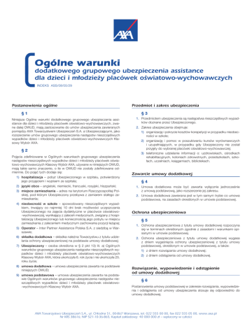 Ogólne warunki dodatkowego grupowego ubezpieczenia assistance dla dzieci i m∏odzie˝y placówek oÊwiatowo-wychowawczych INDEKS ASS/08/05/29 Postanowienia ogólne §1 Przedmiot i zakres ubezpieczenia §3 Niniejsze Ogólne warunki dodatkowego grupowego ubezpieczenia assistance dla dzieci i m∏odzie˝y placówek oÊwiatowo-wychowawczych, zwane dalej OWUD, majà zastosowanie do umów ubezpieczenia zawieranych pomi´dzy AXA Towarzystwem Ubezpieczeƒ S.A. a Ubezpieczajàcymi, jako rozszerzenie umów grupowego ubezpieczenia nast´pstw nieszcz´Êliwych wypadków dzieci i m∏odzie˝y placówek oÊwiatowo-wychowawczych Klasowy Wybór AXA. §2 Poj´cia zdefiniowane w Ogólnych warunkach grupowego ubezpieczenia nast´pstw nieszcz´Êliwych wypadków dzieci i m∏odzie˝y placówek oÊwiatowo-wychowawczych Klasowy Wybór AXA, u˝ywane w niniejszych OWUD, majà takie samo znaczenie, o ile w OWUD nie zosta∏y zdefiniowane odmiennie. Do poj´ç tych dodaje si´: 1) hospitalizacja – pobyt Ubezpieczonego w szpitalu, potwierdzony jego przyj´ciem i wypisem ze szpitala; 2) j´zyki obce – angielski, niemiecki, francuski, rosyjski, hiszpaƒski; 3) miejsce zamieszkania – adres na terytorium Rzeczypospolitej Polskiej, pod którym Ubezpieczony przebywa z zamiarem sta∏ego zamieszkania; 4) nieobecnoÊç w szkole – spowodowany nieszcz´Êliwym wypadkiem, trwajàcy co najmniej 10 dni brak mo˝liwoÊci ucz´szczania Ubezpieczonego na zaj´cia dydaktyczne w placówce oÊwiatowo-wychowawczej, wynikajàcy z zaleceƒ medycznych, zwiàzany z hospitalizacjà Ubezpieczonego lub koniecznoÊcià jego pobytu w miejscu zamieszkania z zaleceniem medycznym zachowania pozycji le˝àcej; 5) Operator – Inter Partner Assistance Polska S.A. z siedzibà w Warszawie; 6) sk∏adka dodatkowa – sk∏adka nale˝na Towarzystwu z tytu∏u udzielania ochrony ubezpieczeniowej na podstawie umowy dodatkowej; 7) Ubezpieczony – osoba okreÊlona w § 2 pkt 13) lit. a) Ogólnych warunków grupowego ubezpieczenia nast´pstw nieszcz´Êliwych wypadków dzieci i m∏odzie˝y placówek oÊwiatowo-wychowawczych Klasowy Wybór AXA, która ukoƒczy∏a 6. rok ˝ycia i nie ukoƒczy∏a 25. roku ˝ycia; 8) umowa dodatkowa – umowa ubezpieczenia zawarta na podstawie niniejszych OWUD; 9) umowa podstawowa – umowa ubezpieczenia zawarta na podstawie Ogólnych warunków grupowego ubezpieczenia nast´pstw nieszcz´Êliwych wypadków dzieci i m∏odzie˝y placówek oÊwiatowo-wychowawczych Klasowy Wybór AXA. 1. Przedmiotem ubezpieczenia sà nast´pstwa nieszcz´Êliwych wypadków doznane przez Ubezpieczonego. 2. Zakres ubezpieczenia obejmuje: 1) organizacj´ i pokrycie kosztów korepetycji w przypadku nieobecnoÊci w szkole; 2) organizacj´ i pomoc w poszukiwaniu kursów wyrównawczych i uzupe∏niajàcych, w przypadku gdy Ubezpieczony nie zosta∏ przyj´ty do wybranej placówki oÊwiatowo-wychowawczej; 3) telefoniczne udzielanie informacji o: uzdrowiskach, oÊrodkach rehabilitacyjnych, koloniach zdrowotnych, przedszkolach, szko∏ach, uczelniach, ksi´garniach, bibliotekach. Zawarcie umowy dodatkowej §4 1. Umowa dodatkowa mo˝e byç zawarta wy∏àcznie jednoczeÊnie z umowà podstawowà, jako rozszerzenie jej zakresu. 2. Umowa dodatkowa zawierana jest w tym samym trybie co umowa podstawowa, na zasadach okreÊlonych w umowie podstawowej. Ochrona ubezpieczeniowa §5 1. Ochrona ubezpieczeniowa z tytu∏u umowy dodatkowej rozpoczyna si´ w terminach okreÊlonych zgodnie z zasadami i warunkami opisanymi w umowie podstawowej. 2. Ochrona ubezpieczeniowa z tytu∏u umowy dodatkowej wygasa z dniem wygaÊni´cia ochrony ubezpieczeniowej z tytu∏u umowy podstawowej, okreÊlonym w umowie podstawowej, a tak˝e: 1) z dniem rozwiàzania umowy dodatkowej; 2) z dniem odstàpienia od umowy dodatkowej. Rozwiàzanie, wypowiedzenie i odstàpienie od umowy dodatkowej §6 Postanowienia umowy podstawowej w zakresie rozwiàzania, wypowiedzenia i odstàpienia od umowy ubezpieczenia stosuje si´ odpowiednio do umowy dodatkowej. AXA Towarzystwo Ubezpieczeƒ S.A., ul. Ch∏odna 51, 00-867 Warszawa, tel. 022 555 00 00, fax 022 555 05 00, www.axa.pl Nr KRS 38616; NIP 521-10-36-865; Kapita∏ zak∏adowy: 40 000 000 z∏ – wp∏acony w ca∏oÊci Ogólne warunki dodatkowego grupowego ubezpieczenia assistance dla dzieci i m∏odzie˝y placówek oÊwiatowo-wychowawczych Sk∏adka dodatkowa §7 1. Do ustalenia wysokoÊci sk∏adki dodatkowej stosuje si´ postanowienia umowy podstawowej w zakresie dotyczàcym ustalania sk∏adki. 2. Sk∏adka dodatkowa stanowi cz´Êç sk∏adki i p∏atna jest przez Ubezpieczajàcego w tych samych terminach co sk∏adka z tytu∏u umowy podstawowej. Âwiadczenie ubezpieczeniowe §8 1. W okresie udzielania ochrony ubezpieczeniowej z tytu∏u umowy dodatkowej Ubezpieczonemu przys∏uguje prawo do korzystania z nast´pujàcych Êwiadczeƒ na terytorium Rzeczypospolitej Polskiej: 1) organizacji i pokrycia kosztów korepetycji w przypadku nieobecnoÊci w szkole; 2) organizacji i pomocy w poszukiwaniu kursów wyrównawczych i uzupe∏niajàcych, w przypadku gdy Ubezpieczony nie zosta∏ przyj´ty do wybranej placówki oÊwiatowo-wychowawczej; 3) telefonicznie udzielanej informacji. 2. Âwiadczenie, o którym mowa w ust. 1 pkt 1) obejmuje: 1) sprawdzenie przez Operatora zakresu bie˝àcego programu nauczania w placówce oÊwiatowo-wychowawczej Ubezpieczonego w okresie nieobecnoÊci w szkole; 2) organizacj´ i pokrycie kosztów korepetycji, obejmujàce dojazd korepetytora do miejsca zamieszkania Ubezpieczonego lub miejsca jego hospitalizacji oraz przeprowadzenie korepetycji z wybranych przedmiotów. Zakresem ubezpieczenia obj´te jest przeprowadzenie maksymalnie: a) dla uczniów szkó∏ podstawowych, gimnazjów i szkó∏ ponadgimnazjalnych (w rozumieniu ustawy o systemie oÊwiaty) – 6 godzin korepetycji z 2 przedmiotów wybranych spoÊród: j´zyka polskiego, matematyki, fizyki, chemii, biologii, j´zyków obcych, b) dla studentów uczel