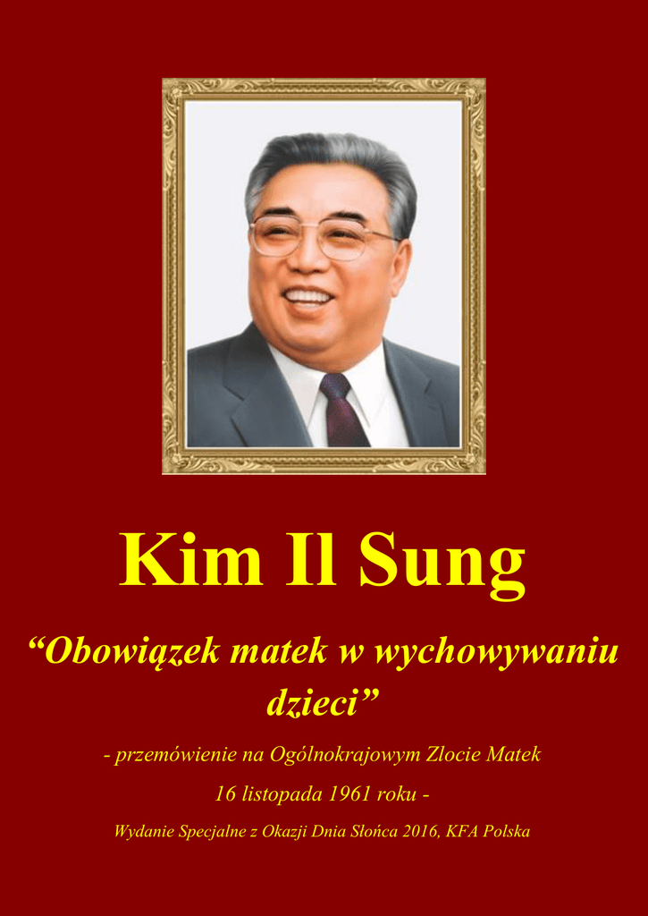 Kim Il Sung “Obowiązek matek w wychowywaniu dzieci” - przemówienie na Ogólnokrajowym Zlocie Matek 16 listopada 1961 roku Wydanie Specjalne z Okazji Dnia Słońca 2016, KFA Polska [...] Dzisiaj wielki zaszczyt wyrządziła naszemu zebraniu swoją obecnością matka towarzysza Ma Don Hi. Wychowała ona swoje dzieci w duchu patriotyzmu. Wskutek tego jej syn, córka i nawet synowa stali się rewolucjonistami. Towarzysz Ma Don Hi zawsze z poświęceniem wykonywał zadania rewolucyjne. Został on ujęty przez policję japońskiego imperializmu, kiedy przybył do rejonu chesańskiego w celu odbudowania organizacji podziemnej. Wrogowie poddali go wszelkim torturom żądając wydania miejsca pobytu dowództwa partyzanckiego. Dowództwo znajdowało się wówczas niedaleko. Towarzysz Ma Don Hi wiedział dobrze, że jeśli miejsce to stanie się znane wrogowi, to rewolucji zostanie wyrządzona ogromna szkoda. Obawiając się, że w stanie utraty świadomości po torturach – w malignie może wyrwać mu się coś o miejscu pobytu naszego dowództwa, towarzysz Ma Don Hi odgryzł sobie język. Taki człowiek jest zaiste bohaterem. Japońscy imperialiści nie uznali za potrzebne oddawanie takiego zawziętego komunisty pod sąd i bestialsko zamordowali go na policji. Jednkaże matka towarzysza Ma Don Hi nie poddała się rozpaczy i pochowawszy syna, pozostawała nadal wierna ojczyźnie. Tylko dlatego, że istnieją takie matki koreańskie, mogli pojawić się również tacy bohaterscy synowie. Komunista powinien poświęcać dla społeczeństwa i narodu nawet własne życie. Matka towarzysza Ma Don Hi kochała swego syna, ale kochała bynajmniej nie egoistycznie. Uważała ona za powinność, że syn umarł nie ulegając przed wrogiem i chociaż umarł jej własny syn postanowiła, że stało się dobrze, ponieważ rewolucja i naród odniosły pożytek. Ta matka ceniła wyżej ojczyznę i naród i rewolucję niż życie własnego syna. Jeżeli wszystkia matki, podobnie jak matka towarzysza Ma Don Hi, będą wychowywać swoje dzieci w sposób rewolucyjny, to wszystkie dzieci wyrosną na wspaniałych komunistów. Obecnie wszystkie nasze dzieci mają doskonałe warunki aby stać się świetnymi ludźmi. W ogóle nie istnieje odrębny gatunek złych ludzi. To klasy wyzyskujące minionych dni wymyśliły bajdę o dobrych i złych z urodzenia. Każdy człowiek od samego urodzenia ma wszelkie zadatki, aby stać się dobrym człowiekiem. Chodzi o to, że ludzie stają się dobrymi lub złymi w zależności od tego, czy otrzymali dobre wychowanie lub wywarto na nich zły wpływ. Szczególnie zależy to w dużym stopniu od tego, jaki wpływ wywarli na nich rodzice. Patrzymy na pochodzenie człowieka nie po to, aby jak w dawnych czasach określać ród człowieka, lecz po to, aby wiedzieć jaki otrzymał on wpływ. Dlatego właśnie syn obszarnika jest zły, że może naśladować ojca, który wyzyskiwał ludzi, bił i znieważał dzierżawców, postępował bezczelnie. Dzisiaj nie ma ani obszarników, ani kapitalistów. Nie ma ani wyzysku, ani ucisku. Wszyscy ludzie mogą się uczyć w szkole, mogą otrzymywać dobre wychowanie, bez względu na to gdzie by pracowali. A zatem, dzieci każdej rodziny mogą stać się dobrymi ludźmi. Dzisiaj na naszych matkach spoczywa wielka odpowiedzialność – wychować swoje dzieci na doskonałych budowniczych komunizmu. Wszystkie matki powinny głębiej odczuć ogromną odpowiedzialność i zaszczyt z powodu tego, że wychowują gospodarzy przyszłego, komunistycznego społeczeństwa. Istnieją obecnie wszystkie sprzyjające warunki, dlatego matkom pozostaje tylko poświęcić siły na wychowanie swoich dzieci. Wychowanie dzieci nie wymaga jakichś specjalnych metod. Wystarczy wychowywać dzieci na pozytywnych przykładach, których obecnie powstaje wiele w naszym kraju. Dzisiaj wszędzie pojawiają się ludzie nowego typu i my wszyscy bez wyjątku znamy wiele wzruszających faktów. Z pewnością wśród zgromadzonych tutaj towarzyszek nie ma nikogo kto by nie wiedział o żonie z Oranu, o czerwonych pracownikach służby zdrowia, którzy uratowali chłopca Pan Ha Su, o towarzyszkach Kir Chwaj Sir i Li Sin Dża. Jeśli będziemy wychowywać dzieci na takich wspaniałych przykładach, to nasze dzieci staną się niezawodnie dobrymi ludźmi. Po to, aby dobrze wychować dzieci, same matki powinny stać się doskonałymi komunistkami. Nie wypada samej nie chcieć pracować, nie chcieć uczyć się, postępować egoistycznie, a tylko od dzieci domagać się, aby stały się one dobrymi ludźmi. W wychowaniu człowieka przykład jest ważniejszy od słów. Aby wychować dzieci na budowniczych komunizmu, przede wszystkim rodzice powinni stać się komunistycznymi matkami, komunistycznymi ojcami. Dziadek Om mieszkający we wsi Czegenri, jest obecnie szeroko znany jako komunistyczny starzec. Nie jest to opowiadanie o komunistycznej matce, ale może ono posłużyć jako przykład. Dziadek Om, jak powiadają pochodzi z Radżinu, przed wyzwoleniem kraju pracował jako parobek i żył bardzo biednie. Dopiero po wyzwoleniu otrzymał on przydział ziemi i zaczął żyć dobrze. Gdy tylko rozpoczęła się wojna, odprowadzając na front swoich synów, udzielił im na drogę rady, że powinni oni do końca walczyć z wrogiem w obronie ojczyzny. Po zakończeniu wojny synowie powrócili i zaczęłi się uczyć, przy czym jeden z nich ukończył już uniwersytet i obecnie pracuje jako wykładowca na Politechnice imienia Kim Czeka. I oto, jak się zdaje syn wykładający na Politechnice napisał do ojca list z propozycją przyjechania do Phenianu i mieszkania u niego, ponieważ ojciec ma już wiele lat i trudno mu jest pracować. W ten sposób dziadek Om przyjechał do Phenianu do syna. Pewnego razu spoglądając z otwartego okna wielomieszkaniowego domu na ulicę zobaczył poruszające się tu i tam ramiona dźwigów, zobaczył wznoszone nieustannie nowe domy, zobaczył jak młodzierz i