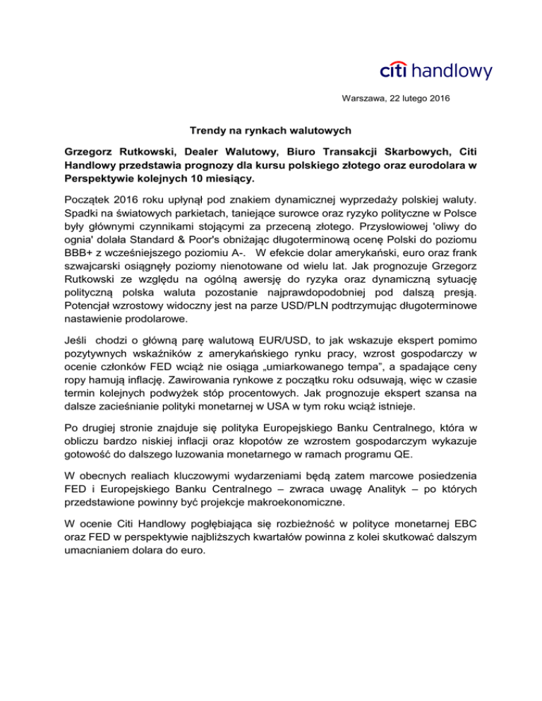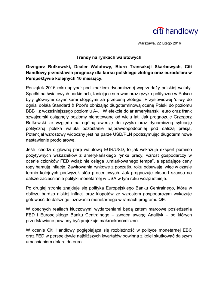 Warszawa, 22 lutego 2016 Trendy na rynkach walutowych Grzegorz Rutkowski, Dealer Walutowy, Biuro Transakcji Skarbowych, Citi Handlowy przedstawia prognozy dla kursu polskiego złotego oraz eurodolara w Perspektywie kolejnych 10 miesiący. Początek 2016 roku upłynął pod znakiem dynamicznej wyprzedaży polskiej waluty. Spadki na światowych parkietach, taniejące surowce oraz ryzyko polityczne w Polsce były głównymi czynnikami stojącymi za przeceną złotego. Przysłowiowej 'oliwy do ognia' dolała Standard & Poor's obniżając długoterminową ocenę Polski do poziomu BBB+ z wcześniejszego poziomiu A-. W efekcie dolar amerykański, euro oraz frank szwajcarski osiągnęły poziomy nienotowane od wielu lat. Jak prognozuje Grzegorz Rutkowski ze względu na ogólną awersję do ryzyka oraz dynamiczną sytuację polityczną polska waluta pozostanie najprawdopodobniej pod dalszą presją. Potencjał wzrostowy widoczny jest na parze USD/PLN podtrzymując długoterminowe nastawienie prodolarowe. Jeśli chodzi o główną parę walutową EUR/USD, to jak wskazuje ekspert pomimo pozytywnych wskaźników z amerykańskiego rynku pracy, wzrost gospodarczy w ocenie członków FED wciąż nie osiąga „umiarkowanego tempa”, a spadające ceny ropy hamują inflację. Zawirowania rynkowe z początku roku odsuwają, więc w czasie termin kolejnych podwyżek stóp procentowych. Jak prognozuje ekspert szansa na dalsze zacieśnianie polityki monetarnej w USA w tym roku wciąż istnieje. Po drugiej stronie znajduje się polityka Europejskiego Banku Centralnego, która w obliczu bardzo niskiej inflacji oraz kłopotów ze wzrostem gospodarczym wykazuje gotowość do dalszego luzowania monetarnego w ramach programu QE. W obecnych realiach kluczowymi wydarzeniami będą zatem marcowe posiedzenia FED i Europejskiego Banku Centralnego – zwraca uwagę Analityk – po których przedstawione powinny być projekcje makroekonomiczne. W ocenie Citi Handlowy pogłębiająca się rozbieżność w polityce monetarnej EBC oraz FED w perspektywie najbliższych kwartałów powinna z kolei skutkować dalszym umacnianiem dolara do euro. Więcej na: LINK DO YOUTUBE Dodatkowych informacji udziela: Dorota Szostek-Rustecka, Dyrektor Biura Prasowego, tel. (0-22) 692 10 49 E-mail: [email protected] Agata Charuba-Chadryś, Kierownik ds. Kontaktów z Mediami, tel. (0-22) 692 94 16 E-mail: [email protected] Marta Wiszniewska, Specjalista ds.kontaktów z mediami, tel. (0-22) 692 90 52 E-mail: [email protected] Bank Handlowy w Warszawie SA to jedna z największych instytucji finansowych w Polsce, oferująca pod marką Citi Handlowy bogaty i nowoczesny asortyment produktów i usług bankowości korporacyjnej, inwestycyjnej i detalicznej. Bank Handlowy obsługuje 6,8 tys. klientów korporacyjnych i ok. 709 tys. klientów indywidualnych poprzez nowoczesne kanały dystrybucji oraz sieć 46 oddziałów. W skład grupy kapitałowej Banku wchodzą takie podmioty jak: Dom Maklerski Banku Handlowego i Handlowy Leasing. Przynależność do Citigroup, największej na świecie instytucji finansowej, zapewnia klientom Banku Handlowego dostęp do usług finansowych w ponad 100 krajach. Citi (NYSE:C) to wiodąca globalna instytucja finansowa, mająca około 200 milionów klientów w ponad 140 krajach. Poprzez swoje dwie odrębne jednostki operacyjne: Citicorp i Citi Holdings, Citi obsługuje klientów indywidualnych, korporacyjnych, rządowych i instytucjonalnych zapewniając im bogaty wachlarz produktów i usług finansowych w zakresie bankowości detalicznej, bankowości korporacyjnej i inwestycyjnej, usług maklerskich i zarządzania aktywami. Dodatkowe informacje można uzyskać na stronie internetowej www.citigroup.com lub www.citi.com.