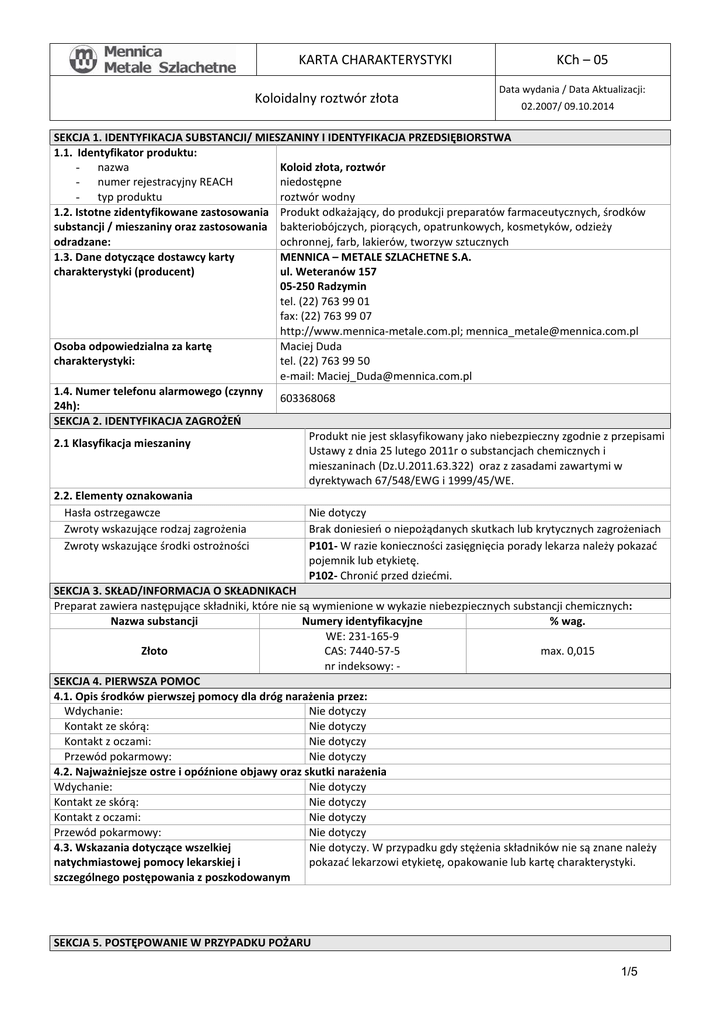KARTA CHARAKTERYSTYKI Koloidalny roztwór złota KCh – 05 Data wydania / Data Aktualizacji: 02.2007/ 09.10.2014 SEKCJA 1. IDENTYFIKACJA SUBSTANCJI/ MIESZANINY I IDENTYFIKACJA PRZEDSIĘBIORSTWA 1.1. Identyfikator produktu: - nazwa Koloid złota, roztwór - numer rejestracyjny REACH niedostępne - typ produktu roztwór wodny 1.2. Istotne zidentyfikowane zastosowania Produkt odkażający, do produkcji preparatów farmaceutycznych, środków substancji / mieszaniny oraz zastosowania bakteriobójczych, piorących, opatrunkowych, kosmetyków, odzieży odradzane: ochronnej, farb, lakierów, tworzyw sztucznych 1.3. Dane dotyczące dostawcy karty MENNICA – METALE SZLACHETNE S.A. charakterystyki (producent) ul. Weteranów 157 05-250 Radzymin tel. (22) 763 99 01 fax: (22) 763 99 07 http://www.mennica-metale.com.pl; [email protected] Osoba odpowiedzialna za kartę Maciej Duda charakterystyki: tel. (22) 763 99 50 e-mail: [email protected] 1.4. Numer telefonu alarmowego (czynny 603368068 24h): SEKCJA 2. IDENTYFIKACJA ZAGROŻEŃ Produkt nie jest sklasyfikowany jako niebezpieczny zgodnie z przepisami 2.1 Klasyfikacja mieszaniny Ustawy z dnia 25 lutego 2011r o substancjach chemicznych i mieszaninach (Dz.U.2011.63.322) oraz z zasadami zawartymi w dyrektywach 67/548/EWG i 1999/45/WE. 2.2. Elementy oznakowania Hasła ostrzegawcze Nie dotyczy Zwroty wskazujące rodzaj zagrożenia Brak doniesień o niepożądanych skutkach lub krytycznych zagrożeniach Zwroty wskazujące środki ostrożności P101- W razie konieczności zasięgnięcia porady lekarza należy pokazać pojemnik lub etykietę. P102- Chronić przed dziećmi. SEKCJA 3. SKŁAD/INFORMACJA O SKŁADNIKACH Preparat zawiera następujące składniki, które nie są wymienione w wykazie niebezpiecznych substancji chemicznych: Nazwa substancji Numery identyfikacyjne % wag. WE: 231-165-9 Złoto CAS: 7440-57-5 max. 0,015 nr indeksowy: SEKCJA 4. PIERWSZA POMOC 4.1. Opis środków pierwszej pomocy dla dróg narażenia przez: Wdychanie: Nie dotyczy Kontakt ze skórą: Nie dotyczy Kontakt z oczami: Nie dotyczy Przewód pokarmowy: Nie dotyczy 4.2. Najważniejsze ostre i opóźnione objawy oraz skutki narażenia Wdychanie: Nie dotyczy Kontakt ze skórą: Nie dotyczy Kontakt z oczami: Nie dotyczy Przewód pokarmowy: Nie dotyczy 4.3. Wskazania dotyczące wszelkiej Nie dotyczy. W przypadku gdy stężenia składników nie są znane należy natychmiastowej pomocy lekarskiej i pokazać lekarzowi etykietę, opakowanie lub kartę charakterystyki. szczególnego postępowania z poszkodowanym SEKCJA 5. POSTĘPOWANIE W PRZYPADKU POŻARU 1/5 KARTA CHARAKTERYSTYKI Koloidalny roztwór złota KCh – 05 Data wydania / Data Aktualizacji: 02.2007/ 09.10.2014 5.1. Środki gaśnicze Zalecane środki gaśnicze: Produkt niepalny Niewłaściwe środki gaśnicze: Nie dotyczy 5.2. Szczególne zagrożenia związane z substancją lub mieszaniną Zagrożenia ze strony substancji lub mieszaniny: Nie dotyczy Niebezpieczne produkty rozkładu termicznego: Nie dotyczy 5.3. Informacje dla straży pożarnej: Specjalistyczny sprzęt ochronny dla strażaków: Nie dotyczy- produkt niepalny i nie niebezpieczny SEKCJA 6. POSTĘPOWANIE W PRZYPADKU NIEZAMIERZONEGO UWOLNIENIA DO ŚRODOWISKA 6.1. Indywidualne środki ostrożności, 6.1.1. Dla osób nie należących do personelu likwidującego skutki awarii: wyposażenie ochronne i procedury w sytuacjach Zawiadomić otoczenie o awarii. Usunąć z obszaru zagrożenia wszystkie awaryjnych: osoby, nie biorące udziału w likwidowaniu awarii. Zapewnić wystarczającą ochronę dróg oddechowych (maska ochronna). Zapewnić właściwą wentylację. Unikać bezpośredniego kontaktu z uwalniającym się preparatem, nie wdychać par, mgły. Powiadomić Straż Pożarną, a w konieczności najbliższą Jednostkę Ratownictwa Chemicznego 6.1.2. Dla osób likwidujących skutki awarii: Osoby prowadzące działania oczyszczające powinny być wyposażone w rękawice ochronne gumowe lub z tworzyw sztucznych, gogle ochronne szczelnie przylegające do twarzy oraz sprzęt izolujący drogi oddechowe. 6.2 Środki ostrożności w zakresie ochrony Należy unikać kontaktu materiału z glebą, ciekami wodnymi, drenami i środowiska: kanalizacją. Jeśli to możliwe, zlikwidować wyciek preparatu (np. uszczelnić uszkodzone opakowanie). 6.3. Metody i materiały zapobiegające Zebrać rozlany preparat za pomocą materiału absorbującego ciecze i rozprzestrzenianiu się skażenia i służące do umieścić w szczelnym pojemniku. Zużyte materiały absorpcyjne oraz usuwania skażenia: pozostałość preparatu po wycieku, można kierować do producenta celem odzysku metali szlachetnych. Miejsce wycieku zmyć starannie wodą. SEKCJA 7. POSTĘPOWANIE Z SUBSTANCJĄ/MIESZANINĄ I JEJ MAGAZYNOWANIE 7.2. Warunki bezpiecznego magazynowania, Przy stosowaniu i magazynowaniu tego produktu należy przestrzegać łącznie z informacjami dotyczącymi wszelkich przepisów w sprawie ochrony przeciwpożarowej budynków, innych wzajemnych niezgodności obiektów budowlanych i terenów. Magazynować z dala od materiałów o własnościach utleniających, źródeł ciepła, otwartego ognia i urządzeń iskrzących. Przechowywać w suchych i dobrze wentylowanych miejscach (wentylacja grawitacyjna) w pojemnikach szczelnie zamkniętych opatrzonych w stosowne etykiety (właściwie oznakowane). Chronić pojemniki przed przegrzewaniem oraz bezpośrednim działaniem promieni słonecznych. Produkt przechowywać w oryginalnych opakowaniach producenta. Nie przechowywać w pobliżu środków spożywczych. SEKCJA 8. KONTROLA NARAŻENIA I ŚRODKI OCHRONY INDYWIDUALNEJ 8.1. Parametry dotyczące kontroli Wartości graniczne narażenia: wartości NDS, NDSCh, NDSP – nieustalone Podstawa prawna: Rozporządzenie Ministra Pracy i Polityki Społecznej z dnia 29 listopada 2002 r. w sprawie najwyższych dopuszczalnych stężeń i natężeń czynników szkodliwych dla zdrowia w środowisku pracy (Dz. U. 02.217.1833 ze zmia