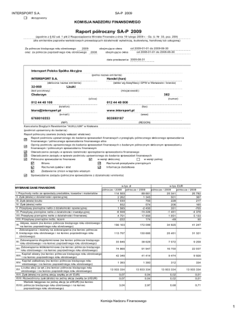 INTERSPORT S.A. SA-P 2009 skorygowany KOMISJA NADZORU FINANSOWEGO Raport półroczny SA-P 2009 (zgodnie z § 82 ust. 1 pkt 2 Rozporządzenia Ministra Finansów z dnia 19 lutego 2009 r. - Dz. U. Nr 33, poz. 259) (dla emitentów papierów wartośc iowyc h prowadząc yc h działalność wytwórc zą, budowlaną, handlową lub usługową) Za półroc ze bieżąc ego roku obrotowego 2009 obejmując e okres oraz za półroc ze poprzedniego roku obrotowego 2008 od 2009-01-01 do 2009-06-30 obejmując e okres od 2008-01-01 do 2008-06-30 data przekazania: 2009-08-31 Intersport Polska Spółka Akcyjna (pełna nazwa emitenta) INTERSPORT S.A. Handel (han) (skróc ona nazwa emitenta) 32-060 (sektor wg klasyfikac ji GPW w Warszawie / branża) Liszki (kod poc ztowy) (miejsc owość ) Cholerzyn 382 (ulic a) (numer) 012 44 48 100 012 44 48 000 (telefon) (fax) [email protected] www.intersport.pl (e-mail) (www) 6760016553 003900187 (NIP) (REGON) Kanc elaria Biegłyc h Rewidentów "AUXLLIUM" w Krakowie (podmiot uprawniony do badania) Raport półroc zny zawiera (należy wskazać właśc iwe): Raport podmiotu uprawnionego do badania sprawozdań finansowyc h z przeglądu półroc znego skróc onego sprawozdania finansowego / półroc znego sprawozdania finansowego albo Opinię podmiotu uprawnionego do badania sprawozdań finansowyc h o badanym półroc znym skróc onym sprawozdaniu finansowym / półroc znym sprawozdaniu finansowym Oświadc zenie zarządu w sprawie rzetelnośc i sporządzenia sprawozdania finansowego Oświadc zenie zarządu w sprawie podmiotu uprawnionego do badania sprawozdań finansowyc h Półroc zne sprawozdanie finansowe w wersji skróc onej w wersji pełnej Bilans Rac hunek przepływów pieniężnyc h Rac hunek zysków i strat Informac ja dodatkowa Zestawienie zmian w kapitale własnym Sprawozdanie zarządu (półroc zne sprawozdanie z działalnośc i emitenta) w tys. zł półroc ze / 2009 półroc ze / 2008 WYBRANE DANE FINANSOWE I. Przyc hody netto ze sprzedaży produktów, towarów i materiałów II. Zysk (strata) z działalnośc i operac yjnej III. Zysk (strata) brutto IV. Zysk (strata) netto V. Przepływy pieniężne netto z działalnośc i operac yjnej VI. Przepływy pieniężne netto z działalnośc i inwestyc yjnej VII. Przepływy pieniężne netto z działalnośc i finansowej VIII. Przepływy pieniężne netto, razem Aktywa, razem (na koniec półroc za bieżąc ego roku obrotowego i na koniec poprzedniego roku obrotowego) Zobowiązania i rezerwy na zobowiązania (na koniec półroc za X. bieżąc ego roku obrotowego i na koniec poprzedniego roku obrotowego) IX. XI. Zobowiązania długoterminowe (na koniec półroc za bieżąc ego roku obrotowego i na koniec poprzedniego roku obrotowego) Zobowiązania krótkoterminowe (na koniec półroc za bieżąc ego roku obrotowego i na koniec poprzedniego roku obrotowego) Kapitał własny (na koniec półroc za bieżąc ego roku obrotowego XIII. i na koniec poprzedniego roku obrotowego) XII. XIV. Kapitał zakładowy (na koniec półroc za bieżąc ego roku obrotowego i na koniec poprzedniego roku obrotowego) Lic zba akc ji (w szt.) (na koniec półroc za bieżąc ego roku XV. obrotowego i na koniec poprzedniego roku obrotowego) XVI. Zysk (strata) na jedną akc ję zwykłą (w zł/ EUR) XVII. Rozwodniony zysk (strata) na jedną akc ję zwykłą (w zł/EUR) Wartość księgowa na jedną akc ję (w zł/EUR) (na koniec XVIII. półroc za bieżąc ego roku obrotowego i na koniec poprzedniego roku obrotowego) w tys. EUR półroc ze / 2009 półroc ze / 2008 114 500 89 661 25 341 25 782 2 262 1 030 1 345 755 501 228 387 217 932 1 585 574 -2 450 206 351 165 -705 -6 558 4 751 -15 226 17 850 -1 451 1 051 -4 378 5 133 -222 174 -49 50 156 103 172 099 34 925 41 247 113 757 130 685 25 451 31 321 33 846 38 629 7 572 9 258 74 866 91 947 16 750 22 037 42 346 41 414 9 474 9 926 1 393 1 393 312 334 13 933 334 13 933 334 13 933 334 13 933 334 0,07 0,04 0,02 0,01 0,07 0,04 0,02 0,01 3,04 2,97 0,68 0,71 Komisja Nadzoru Finansowego 1 INTERSPORT S.A. SA-P 2009 w tys. zł półroc ze / 2009 półroc ze / 2008 WYBRANE DANE FINANSOWE Rozwodniona wartość księgowa na jedną akc ję (w zł/EUR) (na XIX. koniec półroc za bieżąc ego roku obrotowego i na koniec poprzedniego roku obrotowego) 3,04 w tys. EUR półroc ze / 2009 półroc ze / 2008 2,97 0,68 0,71 Zadeklarowana lub wypłac ona dywidenda na jedną akc ję (w zł/EUR) Raport powinien zostać przekazany Komisji Nadzoru Finansowego, spółc e prowadząc ej rynek regulowany oraz do public znej wiadomośc i za pośrednic twem agenc ji informac yjnej zgodnie z przepisami prawa RAPORT PODMIOTU UPRAWNIONEGO DO BADANIA SPRAWOZDAŃ FINANSOWYCH Z PRZEGLĄDU PÓŁROCZNEGO SKRÓCONEGO SPRAWOZDANIA FINANSOWEGO / PÓŁROCZNEGO SPRAWOZDANIA FINANSOWEGO ALBO OPINIA PODMIOTU UPRAWNIONEGO DO BADANIA SPRAWOZDAŃ FINANSOWYCH O BADANYM PÓŁROCZNYM SKRÓCONYM SPRAWOZDANIU FINANSOWYM / PÓŁROCZNYM SPRAWOZDANIU FINANSOWYM Plik Opis Raport z przegladu bieglego rewidenta_I polroc ze 2009.pdf OŚWIADCZENIE ZARZĄDU W SPRAWIE RZETELNOŚCI SPORZĄDZENIA SPRAWOZDANIA FINANSOWEGO Plik Opis oswiadc zenie_rzetelnosc sporzadzenia rap za I pol 2009.pdf OŚWIADCZENIE ZARZĄDU W SPRAWIE PODMIOTU UPRAWNIONEGO DO BADANIA SPRAWOZDAŃ FINANSOWYCH Plik Opis oswiadc zenie_wybor audytora I pol 2009.pdf BILANS w tys. zł Noty półroc ze / 2009 2008 półroc ze / 2008 AKTYWA I. Aktywa trwałe 90 435 84 298 556 648 604 88 605 82 678 51 282 1. Wartośc i niematerialne i prawne, w tym: 2. Rzec zowe aktywa trwałe 3. Inwestyc je długoterminowe 52 513 611 611 345 3.1. Długoterminowe aktywa finansowe 611 611 345 a) w pozostałyc h jednostkac h 611 611 345 663 361 282 663 361 282 II. Aktywa obrotowe 65 668 87 801 62 549 1. Zapasy 61 892 76 496 58 402 2 576 9 811 3 201 2 576 9 811 3 201 1 025 1 247 752 4. Długoterminowe rozlic zenia międzyokresowe 4.1. Aktywa z tytułu odroc zonego podatku doc hodowego 2. Należnośc i krótkoterminowe 2.1. Od pozosta