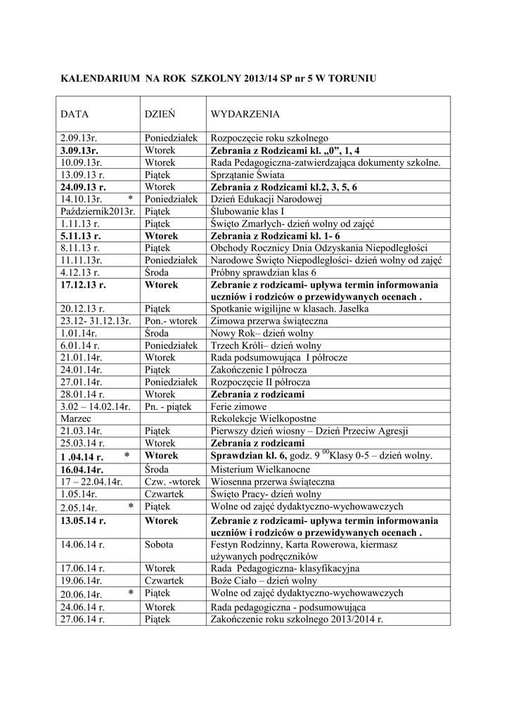 KALENDARIUM NA ROK SZKOLNY 2013/14 SP nr 5 W TORUNIU