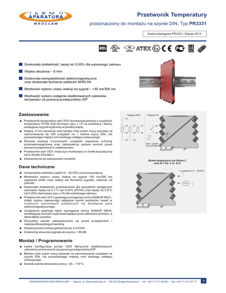 Przetwonik Temperatury przeznaczony do montażu na szynie DIN, Typ PR3331 Karta katalogowa PR3331, Edycja 2014 Doskonała dokładność, lepiej niż 0,05% dla wybranego zakresu Wąska obudowa – 6 mm Doskonała kompatybilność elektromagnetyczna oraz doskonałe tłumienie zakłóceń 50/60 Hz Możliwość wyboru czasu reakcji na sygnał – <30 ms/300 ms Możliwość wyboru wstępnie skalibrowanych zakresów temperatur za pomocą przełączników DIP Zastosowanie Wejście RTD Wejście TC < Przetwornik temperatury serii 3331 konwertuje pomiary z czujników temperatury Pt100 i/lub termopar typu J i K na izolowany i bierny analogowy sygnał wyjściowy w postaci prądu. < Wąska, 6 mm obudowa oraz bardzo niski pobór mocy pozwala na zamontowanie do 165 urządzeń na 1 metrze szyny DIN, nie pozostawiając między nimi żadnego odstępu izolacyjnego. < Wysoka izolacja 2-portowych urządzeń zapewnia ochronę przeciwprzepięciową oraz zabezpiecza system kontroli przed stanami przejściowymi i zakłóceniami. < Przetwornik serii 3331 może być montowany w strefie bezpiecznej lub w Strefie 2/Dziale 2. < Zatwierdzone do zastosowań morskich. Zew. czujnik CJC (Pt100) Strefa bezpieczna lub Strefa 2 oraz kl.1 Dz. 2 ar. A-D Dane techniczne < Uniwersalne zasilanie z pętli 5.5...35 VDC za pomocą złączy. V zasilanie 5.5 .. 35VDC < Możliwość wyboru czasu reakcji na sygnał <30 ms/300 ms zapewnia krótki czas reakcji lub tłumienie sygnału, zależnie od potrzeb. < Doskonała dokładność przetwarzania dla wszystkich dostępnych zakresów, lepiej niż 0,1°C lub 0,05% (Pt100) oraz lepiej niż 0,5°C lub 0,05% (termopary typu J i K) dla wybranego zakresu. < Przetworniki serii 3331 spełniają wymagania normy NAMUR NE21, dzięki czemu zapewniają najlepsze wyniki pomiarów nawet w trudnych warunkach podatnych na działanie pola elektromagnetycznego. < Urządzenia spełniają także wymagania normy NAMUR NE43, określającej wartości wyjściowe będące poza zakresem pomiaru, a także błędy czujnika. < Wszystkie zaciski zabezpieczone są przed przepięciami i nieprawidłową biegunowością. < Wysoki poziom izolacji galwanicznej: 2,5 kVAC. < Znakomity stosunek sygnału do szumu: > 60 dB. Montaż / Programowanie < Łatwa konfiguracja ponad 1000 fabrycznie skalibrowanych zakresów pomiarowych za pomocą przełączników DIP. < Bardzo niski pobór mocy pozwala na zamontowanie urządzeń na szynie DIN, nie pozostawiając między nimi żadnego odstępu izolacyjnego. < Szeroki zakres temperatur pracy: -25...+70°C. TERMOAPARATURA WROCŁAW • Zębice, ul. Rzemieślnicza 4 • 55-010 Święta Katarzyna • tel. +48 71 311-58-60 • fax +48 71 311-37-17 1 Typ PR3331 Dane techniczne Warunki środowiskowe Zakres temperatur pracy Temperatura przechowywania Temperatura kalibracji Wilgotność względna Stopień ochrony Montaż Dane mechaniczne Wymiary (WxSxG) Ciężar, ok. Typ szyny DIN Rozmiar przewodu Moment dokręcania śruby zaciskowej -25°C do +70°C -40°C do +85°C 20... 28° C < 95% RH (bez skrapl.) IP20 Stopień zanieczyszczenia 2 i kategoria przepięciowa II 113x6,1x115 mm 70 g DIN EN 60715 – 35 mm 0.13x2.5 mm2/AWG 26...12; przewód linkowy 0,5 Nm Ogólne parametry elektryczne Napięcie zasilania 5.5...35 VDC Spadek napięcia 5,5 VDC Maks. pobór mocy 1W Wew. pobór mocy maks. 0,65 W Napięcie izolacji, test 2,5 kVAC (wzmocnione) Napięcie izolacji, praca 300 VAC/250 VAC (samoist. bezp.) Stosunek sygnału do szumu > 60 dB Czas reakcji (0...90%, 100...10%) < 30 ms/300 ms (możliwość wyboru) Dokładność lepiej niż 0,05% dla wybranego zakresu Odporność na działanie pola elektromagnetycznego <± 0,5% zakresu Zwiększona odporność na działanie pola elektromagnetycznego: NAMUR NE 21, kryterium A, impuls <± 1% zakresu zakresu z wybranego zakresu Parametry wyjściowe Programowalne zakresy sygnału Prąd wyjściowy: Granice zakresu, wartości będące poza zakresem wg NAMUR NE43 Wykrywanie błędów czujnika, wyjście prądowe Stabilność obciążenia, wyjście prądowe Rezystancja obciążenia, wyjście prądowe Dopuszczenia EMC LVD ATEX IECEx FM Dopuszczenie morskie DNV GL GOST R UL 4...20 and 20...4 mA 3,8 .. 20,5 mA 3,5 mA/23 mA/brak ≤ 0,01% zakresu/100 Ω ≤ (Vzasilania – 5,5)/0,023 [Ω] EN 61326-1 EN 61010-1 KEMA 10ATEX0147 X KEM 10.0068X 3041043-C Wym. podl. certyf. Nr 2.4 V1-7-2 Tak UL 61010-1 Parametry wejściowe Zakres temperatur Prąd czujnika, RTD Dokładność, RTD -200...+850°C <0,15 mA Lepsza niż 0.05% dla danego zakresu lub 0.1°C parametry przewodu czujnika 50 Ω na przewód Wpływ na rezystancję przewodu czujnika (3-/4-przewodowe), RTD <0,002 Ω/Ω Wykrywanie błędów czujnika, RTD Tak – do wyboru za pomocą przełączników DIP Wykrywanie uszkodzonego czujnika > 800 Ω Wykrywanie zwarć czujnika < 18 Ω Zakres temperatur, termopara typu J termopara typu J -100...+1200°C termopara typu K termopara typu K -180...+1372°C Dokładność, TC Lepsza niż 0.05% dla danego zakresu lub 0.5°C Parametry przewodu i czujnika, termopara typu J i K 5 kΩ na przewód Dokładność kompensacji zimnego złącza (CJC) z wykorzystaniem zew. czujnika CJC (Pt100) < ±0,15°C z wykorzystaniem wew. czujnika CJC Wykrywanie otwartego obwodu termopary Wykrywanie błędu wewnętrznej kompensacji CJC Wykrywanie błędu zewnętrznej kompensacji CJC 2 < ±2,5°C Tak – do wyboru za pomocą przełączników DIP Tak Tak – do wyboru za pomocą przełączników DIP TERMOAPARATURA WROCŁAW • Zębice, ul. Rzemieślnicza 4 • 55-010 Święta Katarzyna • tel. +48 71 311-58-60 • fax +48 71 311-37-17