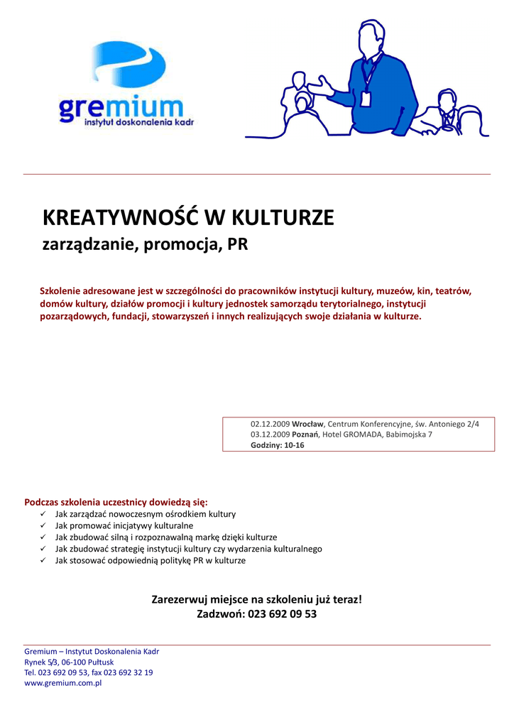 KREATYWNOŚĆ W KULTURZE zarządzanie, promocja, PR Szkolenie adresowane jest w szczególności do pracowników instytucji kultury, muzeów, kin, teatrów, domów kultury, działów promocji i kultury jednostek samorządu terytorialnego, instytucji pozarządowych, fundacji, stowarzyszeń i innych realizujących swoje działania w kulturze. 02.12.2009 Wrocław, Centrum Konferencyjne, św. Antoniego 2/4 03.12.2009 Poznań, Hotel GROMADA, Babimojska 7 Godziny: 10-16 Podczas szkolenia uczestnicy dowiedzą się: Jak zarządzać nowoczesnym ośrodkiem kultury Jak promować inicjatywy kulturalne Jak zbudować silną i rozpoznawalną markę dzięki kulturze Jak zbudować strategię instytucji kultury czy wydarzenia kulturalnego Jak stosować odpowiednią politykę PR w kulturze Zarezerwuj miejsce na szkoleniu już teraz! Zadzwoń: 023 692 09 53 Gremium – Instytut Doskonalenia Kadr Rynek 5/3, 06-100 Pułtusk Tel. 023 692 09 53, fax 023 692 32 19 www.gremium.com.pl Ramowy program szkolenia Część wykładowa: 1. Budowanie marki poprzez kulturę A) Rola sektora kultury w budowaniu marki miast i regionów – teoria i rzeczywistość, B) Wykorzystanie kultury w budowaniu silnej i rozpoznawalnej marki. Studium przypadku miast, których komunikacja marketingowa opiera sie głównie na kulturze; Amsterdam, Berlin, Bilbao, Barcelona, Liverpool, Lille, C) Polityka kulturalna Unii Europejskiej oraz wprowadzenie do inicjatywy „Europejska Stolica Kultury”, D) ESK w Polsce - sytuacje kryzysowe, E) Dobre praktyki, czyli promocja poprzez wydarzenia i projekty kulturalne (przykłady z projektu Łódź – Europejska Stolica Kultury 2016). 2. A) B) C) Nowoczesne zarządzanie instytucją kultury Management w nowoczesnych ośrodkach kultury, Promocja inicjatyw kulturalnych. PR w kulturze, czy to w ogóle istnieje? Fundrising – czyli czy działalność w kulturze moŜe być dochodowa. Część warsztatowa: A) Budowanie strategii instytucji kultury/wydarzenia kulturalnego, B) Kreatywność w kulturze. Zajęcia poprowadzi: KRZYSZTOF CANDROWICZ Pomysłodawca i koordynator licznych projektów z zakresu kultury, sztuki, Public Relations i marketingu terytorialnego. Dyrektor Łódź Art Center (Międzynarodowe Centrum Sztuki w Łodzi), twórca projektu Łódź - Europejska Stolica Kultury 2016, dyrektor FOTOFESTIWALU - Międzynarodowego Festiwalu Fotografii w Łodzi, dyrektor ŁODŹ DESIGN - Międzynarodowego Festiwalu Designu, załoŜyciel PHOTO FESTIVAL UNION (Unia Europejskich Festiwali Fotografii) - stowarzyszenia 30 festiwali z Europy. Socjolog kultury. Odbył stypendium naukowe na wydziale ekonomiczno-socjologicznym Uniwersytetu Macedońskiego w Salonikach. Ukończył takŜe studia podyplomowe Zarządzanie Kulturą w perspektywie integracji z Unią Europejską w Polskiej Akademii Nauk w Warszawie. Współtworzone przez niego projekty nagradzane były w licznych plebiscytach i konkursach m.in. HELIKON 2005 (Forum Komunikacji Marketingowej), Produkt Turystyczny Roku 2006 (Polska Organizacja Turystyczna), wyróŜnienie za zasługi dla rozwoju Łodzi (Gala Biznesu BCC) oraz Art & Business Awards. W roku 2007 został uhonorowany nagrodą Łodzianina Roku. Koszt udziału w szkoleniu: 490 zł, kaŜda następna osoba uzyskuje rabat w wysokości 10 % KARTA ZGŁOSZENIA UCZESTNICTWA W SZKOLENIU Temat szkolenia: Wybór terminu i lokalizacji: Cena: Cena zawiera: Kreatywność w kulturze – zarządzanie, promocja, PR Prosimy zaznaczyć krzyżykiem wybraną lokalizację i termin szkolenia: □ 2 grudnia 2009, g. 10-16, Wrocław, Centrum Konferencyjne, św. Antoniego 2/4 □ 3 grudnia 2009, g. 10-16, Poznań, Hotel GROMADA, ul. Babimojska 7 490 zł za osobę - Koszt uczestnictwa, - autorskie materiały szkoleniowe, - konsultacje w trakcie szkolenia, - imienne zaświadczenie o uczestnictwie, - dwie przerwy kawowe i obiad Rabaty: Maks. liczba uczestników: druga i każda następna osoba z jednej firmy lub instytucji uzyskuje rabat w wysokości 10 % Lista zgłaszanych osób: Lp. Imię: 1. 20 osób Nazwisko: Stanowisko: Koszt: zł 2. zł 3. zł 4. Łączny koszt: Płatnik / Zgłaszający: Dane do rachunku: Pełna nazwa: Ulica i nr: Miejscowość i kod pocztowy: NIP: Dane kontaktowe: Osoba: Telefon: Faks: e-mail: Forma płatności: (prosimy zaznaczyć wybraną opcję) □ płatność do 3 dni przed szkoleniem na podstawie przesłanego rachunku pro-forma □ płatność w terminie 7 dni po szkoleniu na podstawie wystawionego rachunku przekazanego uczestnikowi/uczestnikom w dniu szkolenia (oferta tylko dla jednostek administracji państwowej i samorządowej oraz jednostek finansów publicznych) zł zł Zasady rejestracji i warunki uczestnictwa: 1. Podstawowym warunkiem uczestnictwa jest przesłanie faksem lub drogą pocztową wypełnionej karty zgłoszenia 2. 3. 4. 5. uczestnictwa w szkoleniu do 7 dni przed terminem szkolenia. Po otrzymaniu Karty GREMIUM IDK prześle drogą e-mail potwierdzenie wpisu na listę uczestników. Do 6 dni przed terminem szkolenia GREMIUM IDK prześle uczestnikom szkolenia faksem oraz drogą e-mail imienne potwierdzenie uczestnictwa wraz z podaniem wszystkich szczegółów organizacyjnych. W przypadku płatności przed szkoleniem do potwierdzenia zostanie dołączona kopia oryginału Rachunku pro-forma. Oryginał Rachunku zostanie przekazany uczestnikom na początku szkolenia. Na podstawie przesłanego Rachunku płatnik zobowiązany jest do dokonania wpłaty należności na konto GREMIUM IDK w terminie do 3 dni przed terminem szkolenia. Prosimy o nie dokonywanie wpłat przed otrzymaniem potwierdzenia uczestnictwa. Przelew powinien wpłynąć na konto: Gremium – Instytut Doskonalenia Kadr, ul. Rynek 5/3, 06-100 Pułtusk Nordea Bank 36 1440 1185 0000 0000 0519 3664 Płatnikom, którzy do 2 dni przed terminem szkolenia nie odwołają pisemnie faksem lub drogą e-mail zgłoszenia swoich uczestników na szkolenie, a nie wezmą w nim udziału, nie przysługuje prawo roszczenia zwrotu wpłaty lub nie uiszc