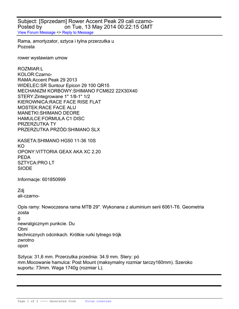 Subject: [Sprzedam] Rower Accent Peak 29 cali czarnoPosted by on Tue, 13 May 2014 00:22:15 GMT View Forum Message <> Reply to Message Rama, amortyzator, sztyca i tylna przerzutka u Pozosta rower wystawiam umow ROZMIAR:L KOLOR:CzarnoRAMA:Accent Peak 29 2013 WIDELEC:SR Suntour Epicon 29 100 QR15 MECHANIZM KORBOWY:SHIMANO FCM622 22X30X40 STERY:Zintegrowane 1" 1/8-1" 1/2 KIEROWNICA:RACE FACE RISE FLAT MOSTEK:RACE FACE ALU MANETKI:SHIMANO DEORE HAMULCE:FORMULA C1 DISC PRZERZUTKA TY PRZERZUTKA PRZÓD:SHIMANO SLX KASETA:SHIMANO HG50 11-36 10S KO OPONY:VITTORIA GEAX AKA XC 2.20 PEDA SZTYCA:PRO LT SIODE Informacje: 601850999 Zdj ali-czarnoOpis ramy: Nowoczesna rama MTB 29". Wykonana z aluminium serii 6061-T6. Geometria zosta g newralgicznym punkcie. Du Obni technicznych odcinkach. Krótkie rurki tylnego trójk zwrotno opon Sztyca: 31,6 mm. Przerzutka przednia: 34.9 mm. Stery: pó mm.Mocowanie hamulca: Post Mount (maksymalny rozmiar tarczy160mm). Szeroko suportu: 73mm. Waga 1740g (rozmiar L). Page 1 of 2 ---- Generated from Forum rowerowe Subject: Odp: [Sprzedam] Rower Accent Peak 29 cali czarnoPosted by on Tue, 24 Jun 2014 21:38:49 GMT View Forum Message <> Reply to Message 2900 pln Page 2 of 2 ---- Generated from Forum rowerowe
