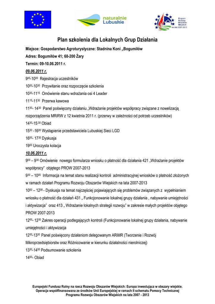 Plan szkolenia dla Lokalnych Grup Działania Miejsce: Gospodarstwo Agroturystyczne: Stadnina Koni „Bogumiłów Adres: Bogumiłów 41; 68-200 śary Termin: 09-10.06.2011 r. 09.06.2011 r. 945-1000 Rejestracja uczestników 1000-1030 Przywitanie oraz rozpoczęcie szkolenia 1030-1115 Omówienie stanu wdraŜania osi 4 Leader 1115-1130 Przerwa kawowa 1130- 1430 Panel poświęcony działaniu „WdraŜanie projektów współpracy związane z nowelizacją rozporządzenia MRiRW z 12 kwietnia 2011 r. (przerwy w zaleŜności od potrzeb uczestników) 1430-15:30 Obiad 1530 -1600 Wystąpienie przedstawiciela Lubuskiej Sieci LGD 1600- 1730 Dyskusja 1900 Uroczysta kolacja 10.06.2011 r. 900 – 930 Omówienie nowego formularza wniosku o płatność dla działania 421 „WdraŜanie projektów współpracy” objętego PROW 2007-2013 930 – 1000 Informacja na temat stanu realizacji kontroli administracyjnej wniosków o płatność złoŜonych w ramach działań Programu Rozwoju Obszarów Wiejskich na lata 2007-2013 1000 – 1200 - Dyskusja na temat najczęściej pojawiających się problemów związanych z wypełnianiem wniosku o płatność dla działań 431 „ Funkcjonowanie lokalnej grupy działania , nabywanie umiejętności i aktywizacja” oraz 413 „ WdraŜanie lokalnych strategii rozwoju” w zakresie małych projektów objętego PROW 2007-2013 1200- 1230 Zakres operacji podlegających kontroli (Funkcjonowanie lokalnej grupy działania, nabywanie umiejętności i aktywizacja 1230-1330 Panel poświęcony działaniom delegowanym ARiMR (Tworzenie i Rozwój Mikroprzedsiębiorstw oraz RóŜnicowanie w kierunku działalności nierolniczej) 1330-1400 Podsumowanie szkolenia 1400- Obiad Europejski Fundusz Rolny na rzecz Rozwoju Obszarów Wiejskich: Europa inwestująca w obszary wiejskie. Operacja współfinansowana ze środków Unii Europejskiej w ramach II schematu Pomocy Technicznej Programu Rozwoju Obszarów Wiejskich na lata 2007 - 2013