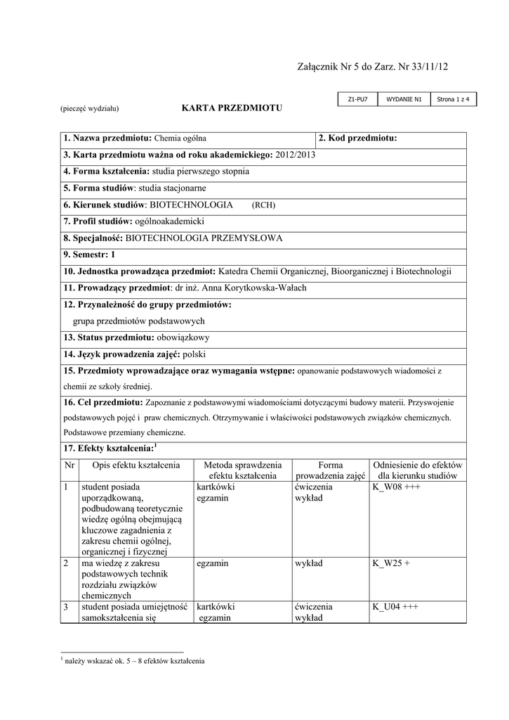 Załącznik Nr 5 do Zarz. Nr 33/11/12 Z1-PU7 (pieczęć wydziału) WYDANIE N1 Strona 1 z 4 KARTA PRZEDMIOTU 1. Nazwa przedmiotu: Chemia ogólna 2. Kod przedmiotu: 3. Karta przedmiotu ważna od roku akademickiego: 2012/2013 4. Forma kształcenia: studia pierwszego stopnia 5. Forma studiów: studia stacjonarne 6. Kierunek studiów: BIOTECHNOLOGIA (RCH) 7. Profil studiów: ogólnoakademicki 8. Specjalność: BIOTECHNOLOGIA PRZEMYSŁOWA 9. Semestr: 1 10. Jednostka prowadząca przedmiot: Katedra Chemii Organicznej, Bioorganicznej i Biotechnologii 11. Prowadzący przedmiot: dr inż. Anna Korytkowska-Wałach 12. Przynależność do grupy przedmiotów: grupa przedmiotów podstawowych 13. Status przedmiotu: obowiązkowy 14. Język prowadzenia zajęć: polski 15. Przedmioty wprowadzające oraz wymagania wstępne: opanowanie podstawowych wiadomości z chemii ze szkoły średniej. 16. Cel przedmiotu: Zapoznanie z podstawowymi wiadomościami dotyczącymi budowy materii. Przyswojenie podstawowych pojęć i praw chemicznych. Otrzymywanie i właściwości podstawowych związków chemicznych. Podstawowe przemiany chemiczne. 17. Efekty kształcenia:1 Nr 1 2 3 1 Opis efektu kształcenia Metoda sprawdzenia efektu kształcenia kartkówki egzamin student posiada uporządkowaną, podbudowaną teoretycznie wiedzę ogólną obejmującą kluczowe zagadnienia z zakresu chemii ogólnej, organicznej i fizycznej ma wiedzę z zakresu egzamin podstawowych technik rozdziału związków chemicznych student posiada umiejętność kartkówki samokształcenia się egzamin należy wskazać ok. 5 – 8 efektów kształcenia Forma Odniesienie do efektów prowadzenia zajęć dla kierunku studiów ćwiczenia K_W08 +++ wykład wykład K_W25 + ćwiczenia wykład K_U04 +++ 4 5 Student zna nomenklaturę podstawowych związków organicznych i nieorganicznych rozumie potrzebę dokształcania się i podnoszenia swoich kompetencji zawodowych i osobistych kartkówki egzamin ćwiczenia wykład K_U28 ++ kartkówki egzamin ćwiczenia wykład K_K01 ++ 18. Formy zajęć dydaktycznych i ich wymiar (liczba godzin) 30 W., 15 ćw. Treści kształcenia: Wykład: 1. Podstawowe pojęcia chemiczne i prawa chemiczne: Substancja chemiczna, mieszanina jednorodna i niejednorodna, pierwiastek, związek chemiczny. Atom i cząsteczka. Masa i rozmiary atomu. Prawo zachowania masy, prawo stosunków stałych i wielokrotnych. Budowa atomu, promieniotwórczość pierwiastków. Liczba atomowa, liczba masowa. Izotopy. Względna i bezwzględna masa atomowa. Liczba Avogadra. Mol. Prawo stosunków objętościowych Gay-Lussaca. 2. Współczesne poglądy na budowę atomu. Kwantowalność energii. Dualizm korpuskularno-falowy. Fala de Broglie’a. Zasada nieoznaczoności Heisenberga. Równanie Schrödingera. Liczby kwantowe. Orbitale atomowe Zasady rozbudowy powłok. 3. Układ okresowy pierwiastków. Metale. Niemetale. Podział na bloki s, p, d, f. Okresowość własności chemicznych (wartościowość względem atomu tlenu, wartościowość względem atomu wodoru, kwasowozasadowe tlenków) i własności fizycznych (rozmiar atomów, energia jonizacji, powinowactwo elektronowe). Konfiguracje elektronowe atomów. 4. Wiązanie chemiczne (teoria wiązań walencyjnych VB). Odległość międzyjądrowa. Energia wiązania cząsteczki. Teoria wiązania jonowego i kowalencyjnego w ujęciu teorii Lewisa i Kossela. Wiązania jonowe. Elektroujemność w skali Paulinga. Energia sieci krystalicznej. Właściwości związków jonowych. Wzory strukturalne Lewisa. Reguła oktetu i wyjątki od reguły oktetu. Ładunek formalny. Struktury rezonansowe. Metoda VSEPR (reguły i przykłady wykorzystania tej metody do przewidywania kształtu cząsteczki). 5. Wiązanie chemiczne w ujęciu chemii kwantowej (teoria orbitali molekularnych MO). Konfiguracje elektronowe oraz konstruowanie i obsadzanie orbitali w prostych cząsteczkach. Rząd wiązania. Przewidywania teorii dotyczące istnienia cząsteczek dwuatomowych. Hybrydyzacja orbitali atomu węgla, azotu, tlenu, boru. Wiązanie σ i π .Określanie typu hybrydyzacji w poszczególnych atomach i struktury cząsteczki. 6. Wiązanie kowalencyjne spolaryzowane. Polaryzowalność. Moment dipolowy. Polarność cząsteczek. Wiązania słabsze niż wiązania kowalencyjne. Oddziaływania dyspersyjne (Londona), dipol-dipol, wiązanie wodorowe. Wpływ powyższych oddziaływań na temperaturę topnienia i wrzenia oraz rozpuszczalność związków chemicznych. Porównanie temperatur wrzenia alkanów liniowych i rozgałęzionych. 7. Stany skupienia materii. Gazy. Pojęcie gazu doskonałego. Podstawowe prawa gazowe: równanie gazu doskonałego, objętość molowa gazu, prawo Daltona, prawo Henry’ego. Ciecze. Napięcie powierzchniowe. Siły kapilarne. menisk wklęsły i wypukły. Pojęcie fazy. Mieszanie cieczy. Układy z ograniczoną mieszalnością. LCST i UCST. Lepkość. Ciała stałe. Substancje bezpostaciowe a krystaliczne. Temperatura topnienia. Kryształy o wiązaniu metalicznym. Kowalność i przewodnictwo elektryczne metali. Ciekłe kryształy. Faza nematyczna, smektyczna, cholesterolowa. Rozpuszczalność związków. Wykresy fazowe. Sublimacja, topnienie, parowanie, punkt potrójny, punkt krytyczny. Przewidywanie zachowania się materii w różnych zestawieniach ciśnienia i temperatury. Wykres fazowy wody. Ciecz w stanie nadkrytycznym. 8. Rozdział mieszanin i roztworów. Parowanie. Wrzenie. Dyfuzja (pierwsze prawo Ficka). Osmoza. Destylacja prosta. Rektyfikacja. Destylacja z parą wodną. Sublimacja. Ekstrakcja (prawo podziału Nernsta). Dobór odpowiednich metod dla wybranych substancji. 9. Prawo działania mas. Równowagi jonowe w wodnych roztworach elektrolitów. Stopień dysocjacji. Moc elektrolitów. Równowaga chemiczna. Prawo równowagi chemicznej. Stężeniowa stała równowagi. Efektywne stężenie jonów (aktywność jonów). Stała równowagi dysocjacji. Prawo rozcieńczeń Ostwalda. Dysocjacja wody. pH, pOH. metody wyznaczania pH. Bu