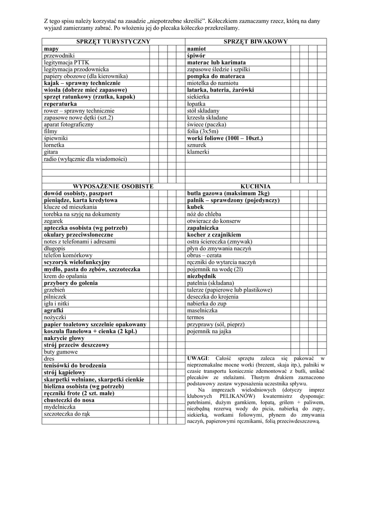 Z tego spisu należy korzystać na zasadzie „niepotrzebne skreślić”. Kółeczkiem zaznaczamy rzecz, którą na dany wyjazd zamierzamy zabrać. Po włożeniu jej do plecaka kółeczko przekreślamy. SPRZĘT TURYSTYCZNY mapy przewodniki legitymacja PTTK legitymacja przodownicka papiery obozowe (dla kierownika) kajak – sprawny technicznie wiosła (dobrze mieć zapasowe) sprzęt ratunkowy (rzutka, kapok) reperaturka rower – sprawny technicznie zapasowe nowe dętki (szt.2) aparat fotograficzny filmy śpiewniki lornetka gitara radio (wyłącznie dla wiadomości) SPRZĘT BIWAKOWY namiot śpiwór materac lub karimata zapasowe śledzie i szpilki pompka do materaca miotełka do namiotu latarka, bateria, żarówki siekierka łopatka stół składany krzesła składane świece (paczka) folia (3x5m) worki foliowe (100l – 10szt.) sznurek klamerki WYPOSAŻENIE OSOBISTE dowód osobisty, paszport pieniądze, karta kredytowa klucze od mieszkania torebka na szyję na dokumenty zegarek apteczka osobista (wg potrzeb) okulary przeciwsłoneczne notes z telefonami i adresami długopis telefon komórkowy scyzoryk wielofunkcyjny mydło, pasta do zębów, szczoteczka krem do opalania przybory do golenia grzebień pilniczek igła i nitki agrafki nożyczki papier toaletowy szczelnie opakowany koszula flanelowa + cienka (2 kpl.) nakrycie głowy strój przeciw deszczowy buty gumowe dres tenisówki do brodzenia strój kąpielowy skarpetki wełniane, skarpetki cienkie bielizna osobista (wg potrzeb) ręczniki frote (2 szt. małe) chusteczki do nosa mydelniczka szczoteczka do rąk KUCHNIA butla gazowa (maksimum 2kg) palnik – sprawdzony (pojedynczy) kubek nóż do chleba otwieracz do konserw zapalniczka kocher z czajnikiem ostra ściereczka (zmywak) płyn do zmywania naczyń obrus – cerata ręczniki do wytarcia naczyń pojemnik na wodę (2l) niezbędnik patelnia (składana) talerze (papierowe lub plastikowe) deseczka do krojenia nabierka do zup maselniczka termos przyprawy (sól, pieprz) pojemnik na jajka UWAGI: Całość sprzętu zaleca się pakować w nieprzemakalne mocne worki (brezent, skaja itp.), palniki w czasie transportu koniecznie zdemontować z butli, unikać plecaków ze stelażami. Tłustym drukiem zaznaczono podstawowy zestaw wyposażenia uczestnika spływu. Na imprezach wielodniowych (dotyczy imprez klubowych PELIKANÓW) kwatermistrz dysponuje: patelniami, dużym garnkiem, łopatą, grilem + paliwem, niezbędną rezerwą wody do picia, nabierką do zupy, siekierką, workami foliowymi, płynem do zmywania naczyń, papierowymi ręcznikami, folią przeciwdeszczową.