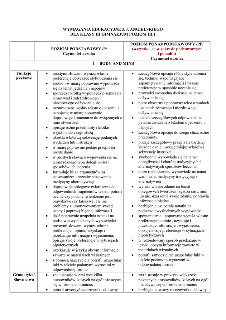 WYMAGANIA EDUKACYJNE Z J. ANGIELSKIEGO DLA KLASY III GIMNAZJUM POZIOM III.1 POZIOM PONADPODSTAWOWY /PP/ POZIOM PODSTAWOWY /P/ (wszystko, co w zakresie podstawowym Czynności ucznia: i ponadto) Czynności ucznia: 1 BODY AND MIND Funkcje językowe Gramatyka/ Słownictwo prostymi słowami wyraża własne preferencje dotyczące stylu uczenia się krótko i w miarę poprawnie wypowiada się na temat jedzenia i napojów sporządza krótką wypowiedź pisemną na temat wad i zalet zdrowego i niezdrowego odżywiania się rozumie sens ogólny tekstu o jedzeniu i napojach; w miarę poprawnie dopasowuje komentarze do związanych z nimi stwierdzeń opisuje różne przedmioty i krótko wyjaśnia do czego służą określa właściwą sekwencję podanych wydarzeń lub instrukcji w miarę poprawnie podaje przepis na proste danie w prostych słowach wypowiada się na temat różnego typu dolegliwości i sposobów ich leczenia formułuje kilka argumentów za stosowaniem i przeciw stosowaniu medycyny alternatywnej dopasowuje obiegowe twierdzenia do odpowiednich fragmentów tekstu; potrafi ocenić czy podane twierdzenie jest prawdziwe czy fałszywe, ale ma problemy z umotywowaniem swojej oceny i poprawą błędnej informacji dość poprawnie uzupełnia notatki na podstawie wysłuchanych wypowiedzi prostymi słowami wyraża własne preferencje i opinie, uzyskuje i przekazuje informacje i wyjaśnienia, opisuje swoje preferencje w sytuacjach hipotetycznych przekazuje w języku obcym informacje zawarte w materiałach wizualnych z pomocą nauczyciela potrafi uzupełniać luki w tekście podanymi wyrazami w odpowiedniej formie zna i stosuje w praktyce kilka czasowników, których na ogół nie używa się w formie continuous potrafi utworzyć rzeczownik odsłowny szczegółowo opisuje różne style uczenia się, techniki wspomagające zapamiętywanie informacji i własne preferencje w sposobie uczenia się prowadzi swobodną dyskusje na temat odżywiania się pisze obszerny i poprawny tekst o wadach i zaletach zdrowego i niezdrowego odżywiania się udziela szczegółowych odpowiedzi na pytania związane z tekstem o jedzeniu i napojach szczegółowo opisuje do czego służą różne przedmioty podaje szczegółowy przepis na bardziej złożone danie, uwzględniając właściwą sekwencję instrukcji swobodnie wypowiada się na temat dolegliwości i chorób; tradycyjnych i alternatywnych sposobów leczenia pisze rozbudowaną wypowiedź na temat wad i zalet medycyny tradycyjnej i alternatywnej wyraża własne zdanie na temat obiegowych twierdzeń: zgadza się z nimi lub nie, uzasadnia swoje zdanie, poprawia informacje błędne bezbłędnie uzupełnia notatki na podstawie wysłuchanych wypowiedzi spontanicznie i poprawnie wyraża własne preferencje i opinie , uzyskuje i przekazuje informacje i wyjaśnienia, opisuje swoje preferencje w sytuacjach hipotetycznych w rozbudowany sposób przekazuje w języku obcym informacje zawarte w materiałach wizualnych potrafi samodzielnie uzupełniać luki w tekście podanymi wyrazami w odpowiedniej formie zna i stosuje w praktyce większość poznanych czasowników, których na ogół nie używa się w formie continuous bezbłędnie tworzy rzeczownik odsłowny Funkcje językowe (gerund) od podanych czasowników, choć zdarzają mu się błędy przy dopisywaniu końcówki –ing rozumie zdania czasowe z imiesłowem czynnym po spójnikach after/before lub when, while, since, ale ma problemy z praktycznym ich zastosowaniem we własnych wypowiedziach ustnych i pisemnych właściwie stosuje rzeczownik odsłowny lub bezokolicznik po najczęściej używanych czasownikach, ale ma problemy z wybraniem właściwej formy po czasownikach mniej znanych opanował podstawowe słownictwo związane z jedzeniem i napojami, przedmiotami gospodarstwa domowego, sprzętem kuchennym, zdrowiem, dolegliwościami i ich leczeniem zna i stosuje w praktyce niektóre podane w rozdziale zwroty z języka potocznego 2 CREATIVITY w miarę poprawnie wyraża czynności niedawno wykonane i czynności trwające do chwili obecnej krótko opisuje zdarzenia przeszłe z uwzględnieniem chronologii wydarzeń rozumie sens ogólny przeczytanego tekstu o sztuce – dopasowuje informacje do obrazków dokonuje prostych porównań ambitnych planów i zamiarów z dokonaniami potrafi wyłonić większość informacji szczegółowych z wysłuchanej biografii autora w prostych słowach opisuje życie wybranego autora rozumie treść przeczytanej przypowieści ludowej, w miarę poprawnie uzupełnia luki w tekście wyrażeniami wybranymi z podanego zestawu w prostych słowach ale z pewnymi błędami opisuje treść wybranej przypowieści ludowej prostymi słowami rozpoczyna, prowadzi i kończy rozmowę, uzyskuje i przekazuje informacje, wyraża swoje emocje, opinie i uczucia przekazuje w języku obcym informacje zawarte w materiałach wizualnych z pomocą nauczyciela potrafi układać fragmenty zdań z podanych elementów leksykalnych (gerund) od podanych czasowników rozumie i samodzielnie tworzy zdania czasowe z imiesłowem czynnym po spójnikach after/before lub when, while, since wie, po których czasownikach stosować bezokolicznik, a po których rzeczownik odsłowny korzysta z bogatego zasobu słownictwa w zakresie omawianej tematyki: jedzenie i picie, przedmioty gospodarstwa domowego, akcesoria kuchenne, zdrowie, dolegliwości i ich leczenie zna i stosuje poznane wyrażenia z języka potocznego bezbłędnie wyraża czynności niedawno wykonane i czynności trwające do chwili obecnej szczegółowo i poprawnie opisuje zdarzenia przeszłe, uwzględniając chronologię wydarzeń potrafi wyłonić szczegółowe informacje z tekstu o sztuce, wyczerpująco odpowiada na pytania z nim związane swobodnie porównuje ambitne plany i zamiary z dokonaniami bez trudu wyłania brakujące informacje szczegółowe z wysłuchanej biografii znanego autora pisze poprawny 2-3 akapitowy opis wybranego autora bezbłędnie uzupełnia luki w przypow