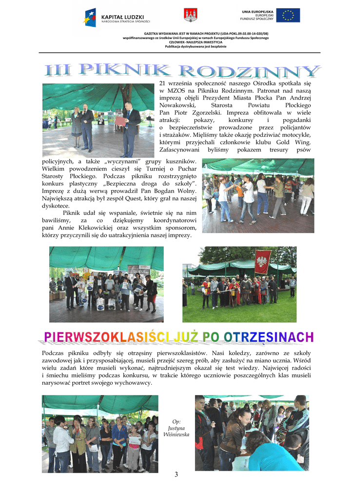 GAZETKA WYDAWANA JEST W RAMACH PROJEKTU (UDA-POKL.09.02.00-14-020/08) współfinansowanego ze środków Unii Europejskiej w ramach Europejskiego Funduszu Społecznego CZŁOWIEK- NAJLEPSZA INWESTYCJA Publikacja dystrybuowana jest bezpłatnie 21 września społeczność naszego Ośrodka spotkała się w MZOS na Pikniku Rodzinnym. Patronat nad naszą imprezą objęli Prezydent Miasta Płocka Pan Andrzej Nowakowski, Starosta Powiatu Płockiego Pan Piotr Zgorzelski. Impreza obfitowała w wiele atrakcji: pokazy, konkursy i pogadanki o bezpieczeństwie prowadzone przez policjantów i straŜaków. Mięliśmy takŜe okazję podziwiać motocykle, którymi przyjechali członkowie klubu Gold Wing. Zafascynowani byliśmy pokazem tresury psów policyjnych, a takŜe „wyczynami” grupy kuszników. Wielkim powodzeniem cieszył się Turniej o Puchar Starosty Płockiego. Podczas pikniku rozstrzygnięto konkurs plastyczny „Bezpieczna droga do szkoły”. Imprezę z duŜą werwą prowadził Pan Bogdan Wolny. Największą atrakcją był zespół Quest, który grał na naszej dyskotece. Piknik udał się wspaniale, świetnie się na nim bawiliśmy, za co dziękujemy koordynatorowi pani Annie Klekowickiej oraz wszystkim sponsorom, którzy przyczynili się do uatrakcyjnienia naszej imprezy. Podczas pikniku odbyły się otrzęsiny pierwszoklasistów. Nasi koledzy, zarówno ze szkoły zawodowej jak i przysposabiającej, musieli przejść szereg prób, aby zasłuŜyć na miano ucznia. Wśród wielu zadań które musieli wykonać, najtrudniejszym okazał się test wiedzy. Najwięcej radości i śmiechu mieliśmy podczas konkursu, w trakcie którego uczniowie poszczególnych klas musieli narysować portret swojego wychowawcy. Op: Justyna Wiśniewska 3