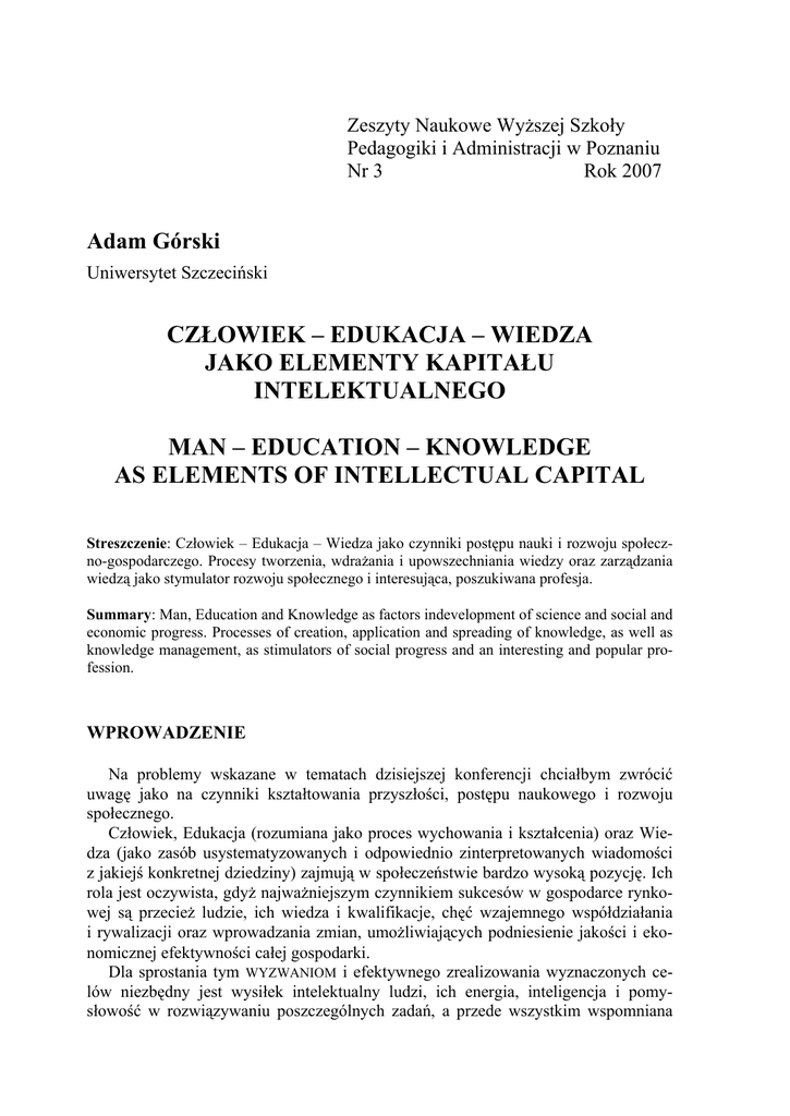Zeszyty Naukowe Wyższej Szkoły Pedagogiki i Administracji w Poznaniu Nr 3 Rok 2007 Adam Górski Uniwersytet Szczeciński CZŁOWIEK – EDUKACJA – WIEDZA JAKO ELEMENTY KAPITAŁU INTELEKTUALNEGO MAN – EDUCATION – KNOWLEDGE AS ELEMENTS OF INTELLECTUAL CAPITAL Streszczenie: Człowiek – Edukacja – Wiedza jako czynniki postępu nauki i rozwoju społeczno-gospodarczego. Procesy tworzenia, wdrażania i upowszechniania wiedzy oraz zarządzania wiedzą jako stymulator rozwoju społecznego i interesująca, poszukiwana profesja. Summary: Man, Education and Knowledge as factors indevelopment of science and social and economic progress. Processes of creation, application and spreading of knowledge, as well as knowledge management, as stimulators of social progress and an interesting and popular profession. WPROWADZENIE Na problemy wskazane w tematach dzisiejszej konferencji chciałbym zwrócić uwagę jako na czynniki kształtowania przyszłości, postępu naukowego i rozwoju społecznego. Człowiek, Edukacja (rozumiana jako proces wychowania i kształcenia) oraz Wiedza (jako zasób usystematyzowanych i odpowiednio zinterpretowanych wiadomości z jakiejś konkretnej dziedziny) zajmują w społeczeństwie bardzo wysoką pozycję. Ich rola jest oczywista, gdyż najważniejszym czynnikiem sukcesów w gospodarce rynkowej są przecież ludzie, ich wiedza i kwalifikacje, chęć wzajemnego współdziałania i rywalizacji oraz wprowadzania zmian, umożliwiających podniesienie jakości i ekonomicznej efektywności całej gospodarki. Dla sprostania tym WYZWANIOM i efektywnego zrealizowania wyznaczonych celów niezbędny jest wysiłek intelektualny ludzi, ich energia, inteligencja i pomysłowość w rozwiązywaniu poszczególnych zadań, a przede wszystkim wspomniana 8 Człowiek – Edukacja już wiedza, i to wiedza w szerokim tego słowa znaczeniu. Chodzi bowiem nie tylko o ten jej zasób określany jako główny stymulator wszelkich procesów twórczych i podstawa podejmowania właściwych decyzji, lecz także o wiedzę z zakresu zachowywania się ludzi w różnych okolicznościach i warunkach oraz o umiejętność postępowania z nimi. Wiedza o zachowaniach i postępowaniu to znajomość działań i postaw ludzi, wynikających z pełnionych przez nich funkcji, a umiejętność to względnie trwała zdolność do rozwiązywania spraw ludzkich w sposób sprawny i skuteczny. Natomiast występujący w tych procesach problem uczenia się, edukacji, polega nie tylko na odkrywaniu tego, co wiedzą inni, choć to w gospodarce rynkowej ma pierwszorzędne znaczenie, lecz także na rozwiązywaniu własnych problemów poprzez ocenę i testowanie wyników myślenia, wnioskowania i działalności oraz opracowaniu strategii i planów bezkonfliktowego wykorzystywania czynników, które decydują o postępie i rozwoju. WYKORZYSTANIE WIEDZY W praktyce okazuje się, że nie tylko większość społeczeństwa, lecz także znaczna część kadry zarządzającej, menedżerów, a nawet decydentów – z uwagi na nieustanny i przyspieszony wzrost masy informacji i niemożność racjonalnego jej wykorzystania – nie dysponuje pełnym zakresem wiedzy ani umiejętnościami w zakresie swej specjalności i pola działania. Do wiadomości decydentów dociera przecież zaledwie 28% informacji, a w tym 25% informacji „strategicznej”, niezbędnej do podejmowania prawidłowych decyzji. Nie dociera do nich aż 72% informacji znajdujących się w obiegu społecznym, co niezbicie przekonuje o konieczności istnienia odpowiednich instytucji powołanych do gromadzenia, udostępniania i upowszechniania wiedzy. Szacuje się bowiem, że około 90% zasobów należy do tzw. wiedzy ukrytej, „zawłaszczonej”, znajdującej się w wynikach badań, raportach, ekspertyzach i w postaci chronionych wynalazków, a tylko ok. 20% utrwalono na nośnikach nadających się do bezpośredniego udostępniania. W świetle powyższych faktów można nawet założyć, że słabe notowania produkcji naukowej naszego kraju w różnych światowych rankingach w dużej części z tego powodu wynikają. Otóż według badań Institute of Scientific w Filadelfii dotyczących stanu nauki w świecie w ostatnich latach ubiegłego wieku Polska spadła do trzeciej dziesiątki w rankingu państw ocenianych pod względem liczby publikacji naukowych, rejestrowanych w „Science Citation Index”, przy czym tylko 25% prac miało walory prac oryginalnych, 10% z pogranicza oryginalności, a opracowania odtwórcze stanowiły aż 65%. Najwyższe – 12. – miejsce w polskich naukach zajmuje chemia (w tym inżynieria chemiczna – bardzo wysokie 6.), dalej matematyka – 13., fizyka – 14., a astronomia – 18. Natomiast nauki techniczne spadły z miejsca 12. na 23., a informatyka z 14. na 28. Źle przedstawia się także sytuacja polskich nauk humanistycznych i społecznych, w których ustępujemy nie tylko naukowym potentatom, lecz także małej Słowacji, Chorwacji i Czechom. Dużym spadkiem w rankingach charakteryzują się polskie nauki medyczne i biologiczne, przy czym niepokojące jest 31. miejsce naszej medycyny. Adam Górski – Człowiek – edukacja – wiedza jako element kapitału intelektualnego 9 Oczywiście z powyższymi wskaźnikami można dyskutować. Zwrócić jednak musimy uwagę i na to, że znajdują one potwierdzenie w różnych światowych źródłach, a przede wszystkim w naszej praktyce dnia codziennego. Mając na uwadze dyscypliny wiążące się ze specjalnościami naszej Uczelni, a przede wszystkim dotyczące tematów dzisiejszej konferencji, większą uwagę powinniśmy skierować na ochronę zdrowia, w szerokim tego słowa znaczeniu, tym bardziej że we wszystkich nowoczesnych państwach problemy polepszenia opieki zdrowotnej stawiane są na pierwszym miejscu nie tylko w ogólnej polityce socjalnej, lecz także naukowej i gospodarczej. Problematyka powyższa winna być rozszerzona również o zagadnienia zdrowej, twórczej organizacji, kt