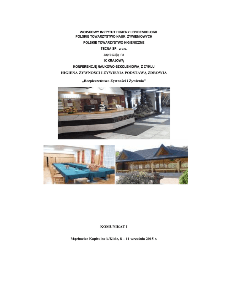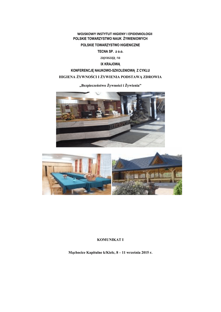 WOJSKOWY INSTYTUT HIGIENY I EPIDEMIOLOGII POLSKIE TOWARZYSTWO NAUK śYWIENIOWYCH POLSKIE TOWARZYSTWO HIGIENICZNE TECNA SP. z o.o. zapraszają na IX KRAJOWĄ KONFERENCJĘ NAUKOWO-SZKOLENIOWĄ Z CYKLU HIGIENA ŻYWNOŚCI I ŻYWIENIA PODSTAWĄ ZDROWIA „Bezpieczeństwo Żywności i Żywienia” KOMUNIKAT I Mąchocice Kapitulne k/Kielc, 8 – 11 września 2015 r. Szanowni Państwo! Zakład Higieny i Fizjologii Wojskowego Instytutu Higieny i Epidemiologii w Warszawie wraz z Polskim Towarzystwem Nauk Żywieniowych oraz Polskim Towarzystwem Higienicznym i firmą TECNA Sp. z o.o. organizują IX Krajową Konferencję Naukowo-Szkoleniową z cyklu „Higiena Żywności i Żywienia Podstawą Zdrowia – Bezpieczeństwo żywności i żywienia” W Konferencji wezmą udział także przedstawiciele zagranicznych instytutów naukowo-badawczych, które zajmują się problemami żywienia, stanu odżywienia oraz higieną żywności i żywienia. Konferencja odbędzie się w dniach 8–11 września 2015 roku, w Hotelu Przedwiośnie, w Mąchocicach Kapitulnych k/Kielc. Proponowana tematyka Konferencji: - bezpieczeństwo żywności i żywienia, - aktywność fizyczna i racjonalne żywienie gwarancją zdrowia, - dietozależne choroby cywilizacyjne zagrożeniem zdrowia, - używki i dopalacze istotny problem zdrowia publicznego, - varia. W trakcie Konferencji chcielibyśmy kontynuować promocję młodych naukowców (do 30 roku życia), którzy zaprezentują wyniki swoich prac badawczych podczas specjalnej sesji młodych naukowców. Najwyżej ocenione prace zostaną nagrodzone. Zwracamy się do młodych naukowców o wzięcie udziału w tej sesji i przysyłanie prac na których prosimy zaznaczyć „Sesja młodych”. Całkowity koszt uczestnictwa w Konferencji wynosi – 950 PLN. Opłata konferencyjna obejmuje: udział w sesjach naukowych, materiały konferencyjne, udział w imprezach towarzyszących (ognisko, wycieczka, udział w bankiecie), noclegi i wyżywienie w dniach 8/9, 9/10 i 10/11 września 2015 r. Istnieje możliwość udziału w Konferencji osób towarzyszących. Opłata za udział osób towarzyszących wynosi 650 PLN i obejmuje udział we wszystkich imprezach towarzyszących. • • • • Organizatorzy zapewniają wydanie zgłoszonych i zakwalifikowanych do prezentacji prac w czasopismach Problemy Higieny i Epidemiologii oraz Hygeia Public Health, które w punktacji MNiSW mają 7 pkt. Warunkiem prezentacji i publikacji jest zgłoszenie pracy o charakterze doświadczalnym oraz uiszczenie opłaty konferencyjnej. Każdy z uczestników konferencji może zgłosić tylko jedną pracę, której objętość nie może przekroczyć 5 stron, rozmiar czcionki 12 i odstęp miedzy wierszami 1,5 pkt. (Prace o większej objętości nie będą rozpatrywane). Wszystkie prace będą recenzowane. Pozytywnie zrecenzowane prace kwlifikowane będą do druku w jednym z w/w czasopism. Prace zakwalifikowane do druku muszą być przygotowane zgodnie z regulaminami w/w czasopism. Doniesienia prezentowane na Konferencji nie mogą przekraczać 10 min. Sesje plakatowe odbędą się w formie 3-minutowych prezentacji multimedialnych. TERMINARZ 1. Zgłoszenie udziału w Konferencji na oddzielnym, załączonym do komunikatu blankiecie: do dnia 10.03.2015 r. 2. Pełny tekst pracy według załączonych wytycznych wraz z płytą CD: do dnia 31.03.2015 r. 3. Opłatę konferencyjną należy uiścić: do dnia 31.03.2015 r. 4. Rezerwację noclegów oraz wniesienie opłaty przynajmniej za 1 dobę pobytu (150 PLN) należy dokonać do dnia 10.04.2015 r. Wpłat należy dokonywać na konto: TECNA Sp. z o.o., ul. Kasprowicza 103A/9, 01-823 Warszawa NIP 524 259 46 78 Rachunek bankowy: Raiffeisen Bank Polska S.A. - 66 1750 0009 0000 0000 1072 6816 z dopiskiem „KONFERENCJA ŻYWIENIOWA”: Uwaga! W przypadku rezygnacji z udziału w Konferencji organizatorzy zwracają w całości koszt opłaty konferencyjnej do dnia 30.06.2015 r. Po tym terminie opłaty nie będą zwracane. Organizatorzy uprzedzają, że nie będzie możliwości zakwaterowania i zapewnienia wyżywienia w dniach przed rozpoczęciem konferencji. W związku z tym organizatorzy proszą o przybycie uczestników w dniu konferencji. Prosimy o przekazanie komunikatu innym osobom zainteresowanym konferencją. Ramowy Program Konferencji: 08.09.2015 r. 09.09.2015 r. wtorek środa 15:00 Rejestracja uczestników 20:00 Spotkanie integracyjne przy ognisku 9:00-9:30 Uroczyste Rozpoczęcie Konferencji 9:30-10:30 Koncert w wykonaniu Reprezentacyjnego Zespołu Artystycznego WP 10:30-13:00 Referaty Plenarne 13:00-14:00 Obiad 14:30-19:00 Wycieczka: 19:00 Kolacja 10.09.2015 r. 11.09.2015 r. czwartek piątek 8:00-8:30 Śniadanie 9:00-14:00 Obrady w sekcjach, w tym sesja młodych 14:00-15:00 Obiad 15:00-18:00 Obrady w sekcjach 20:00 Uroczysta kolacja 9:00-9:30 Śniadanie 9:30-12:00 Obrady w sekcjach 12:00-12:30 Zakończenie konferencji 12:30-14:00 Obiad 14:00 Wyjazd uczestników Konferencji Adresy do korespondencji: dr hab. Jerzy BERTRANDT dr Anna KŁOS Wojskowy Instytut Higieny i Epidemiologii Wojskowy Instytut Higieny i Epidemiologii ul. Kozielska 4 ul. Kozielska 4 01-163 Warszawa 01-163 Warszawa (+48 22) 685 31 71 kom. 500 249 430 tel. (+48 22) 685 31 34 kom. 601 853 117 e-mail: [email protected] e-mail: [email protected] Komunikat o Konferencji dostępny będzie na stronie internetowej www.wihe.waw.pl -zakładka aktualności oraz na stronie PTNŻ. KARTA ZGŁOSZENIA NA KONFERENCJĘ IX Konferencja Naukowo-Szkoleniowa „HIGIENA ŻYWNOŚCI I ŻYWIENIA PODSTAWĄ ZDROWIA” 8–11 września 2015 r., Mąchocice Kapitulne k/Kielc Karta zgłoszenia Tytuł lub stopień naukowy Imię i nazwisko Instytucja Adres Tel./fax E-mail Dane do wystawienia rachunku: NIP, dokładna nazwa i adres Uczelni (Instytucji), na którą należy wystawić rachunek Imiona i nazwiska autorów zgłoszonego wystąpienia Tytuł pracy Forma wystąpienia Doniesienie Plakat Proszę wypełnić i wysłać drogą e-mailową lub na adres konta