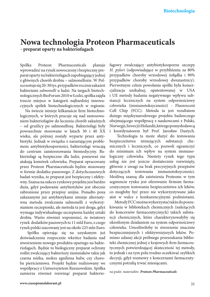 Biotechnologia Nowa technologia Proteon Pharmaceuticals - preparat oparty na bakteriofagach Spółka Proteon Pharmaceuticals planuje wprowadzić na rynek nowoczesny i bezpieczny preparat oparty na bakteriofagach zapobiegający jednej z głównych chorób drobiu – salmonellozie. W Polsce notuje się 20-30 tys. przypadków rocznie zakażeń bakteriami salmonelli u ludzi. Na targach biotechnologicznych BioForum 2010 w Łodzi, spółka zajęła trzecie miejsce w kategorii najbardziej innowacyjnych spółek biotechnologicznych w regionie. Na świecie istnieje kilkanaście firm biotechnologicznych, w których pracuje się nad zastosowaniem bakteriofagów do leczenia chorób zakaźnych – od gruźlicy po salmonellozę. Bakteriofagi były powszechnie stosowane w latach 30 i 40 XX wieku, ale później zostały wyparte przez antybiotyki. Jednak w związku z narastającym problemem antybiotykooporności, bakteriofagi wracają do centrum zainteresowania biomedycyny. Bakteriofagi są bezpieczne dla ludzi, ponieważ nie atakują komórek człowieka. Preparat opracowany przez Proteon Pharmaceuticals będzie stosowany w formie dodatku paszowego. Z dotychczasowych badań wynika, że preparat jest bezpieczny i efektywny. Szansa na sukces rynkowy projektu jest bardzo duża, gdyż podawanie antybiotyków jest obecnie zabronione przez przepisy unijne. Ponadto poza zakazanymi już antybiotykami istnieje alternatywna metoda zwalczania salmonelli z wykorzystaniem szczepionki, ale metoda ta jest droga, gdyż wymaga indywidualnego szczepienia każdej sztuki drobiu. Warto również wspomnieć, że światowy rynek dodatków paszowych to 11 mld Euro, z czego rynek polski szacowany jest na około 225 mln Euro. Spółka opierając się na uzyskanym już doświadczeniu rozpocznie wkrótce badania nad stworzeniem nowego produktu opartego na bakteriofagach. Będzie to biologiczny preparat ochrony roślin zwalczający bakteriozy ziemniaków takie jak czarna nóżka, mokra zgnilizna bulw, czy choroba pierścieniowa. Projekt będzie realizowany we współpracy z Uniwersytetem Rzeszowskim. Spółka zamierza również rozwinąć preparat bakteriowww.czasopismolaborant.pl fagowy zwalczający antybiotykooporne szczepy H. pylori (odpowiadające w przybliżeniu za 80% przypadków choroby wrzodowej żołądka i 90% przypadków choroby wrzodowej dwunastnicy). Pierwotnym celem powołania spółki była komercjalizacja unikalnej, opatentowanej w USA i UE metody badania negatywnego wpływu substancji leczniczych na system odpornościowy człowieka (immunotoksyczności) - Fluorescent Cell Chip (FCC). Metoda ta jest rezultatem dużego międzynarodowego projektu badawczego obejmującego współpracę z naukowcami z Polski, Norwegii, Szwecji i Holandii, którego pomysłodawcą i koordynatorem był Prof. Jarosław Dastych. Technologia ta może służyć do testowania bezpieczeństwa istniejących substancji chemicznych i leczniczych, co pozwoli ograniczyć do minimum ich wpływ na system immunologiczny człowieka. Niestety rynek tego typu usług nie jest jeszcze dostatecznie rozwinięty, głównie z uwagi na brak precyzyjnych przepisów dotyczących testowania immunotoksyczności. Możliwą szansą dla zaistnienia Proteonu w tym segmencie rynku jest oferowanie firmom farmaceutycznym testowania bezpieczeństwa ich leków, co mogłoby być przez nie wykorzystywane jako atut w walce z konkurencyjnymi podmiotami. Metody FCC można wykorzystać także do poszukiwania w bibliotekach chemicznych (należących do koncernów farmaceutycznych) takich substancji chemicznych, które charakteryzowałyby się określonym działaniem na system odpornościowy człowieka. Umożliwiłoby to stworzenie znacznie bezpieczniejszych i efektywniejszych leków. Pomimo udanej akcji próbnego przeszukania biblioteki chemicznej jednej z krajowych firm farmaceutycznych potwierdzającej skuteczność tej metody, to jednak i na tym polu trudno oczekiwać szybkich decyzji, gdyż rozmowy z koncernami farmaceutycznymi potrafią trwać miesiącami. na podst. materiałów Proteon Pharmaceuticals 31