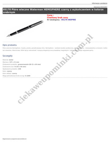 Informacje o produkcie Utworzono 04-03-2017 05170 Pióro wieczne Waterman HEMISPHERE czarny z wykończeniem w kolorze srebrnym Cena : Chwilowy brak ceny .p l Nr katalogowy : 05170 INSPIRE om Opis produktu Pióro wieczne Hemisphere. Czysta, prosta, ponadczasowa linia. Hemisphere - zarówno bardzo praktyczna, jak i dyskretna - niezauważalna w kieszeni, torbie Szczegóły Materiał: metal Wymiary: 137 x 11 mm Znakowanie produktu: grawerowanie GD (5 x 40 mm) Opakowanie produktu: 248 Kolor: czarny Kolor wkładu: czarny ci ek a w Waga jednostkowa brutto (w kg): 0.1690 eu po m Znakowanie etui: N (20 x 60 mm) Wygenerowano w programie www.oscGold.com in ki .c lub notatniku. Wzornictwo, które łączy naturalność, kuszącą elegancję oraz prawdziwy magnetyzm. Lakierowany. Logo wygrawerujemy