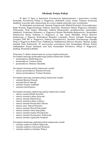 Obchody Święta Policji W dniu 27 lipca w Starostwie Powiatowym funkcjonariusze i pracownicy cywilni Komendy Powiatowej Policji w Wągrowcu obchodzili swoje święto. Podczas uroczystej akademii wręczono akty mianowania na wyższe stopnie policyjne oraz wyróżnienia. W obchodach uczestniczyli: Starosta Wągrowiecki Michał Piechocki, Przewodniczący Rady Powiatu Wągrowieckiego Tadeusz Synoracki, Burmistrz Miasta Wągrowca Stanisław Wilczyński, Wójt Gminy Mieścisko Andrzej Banaszyński, przedstawiciele samorządów lokalnych, Prokurator Rejonowy w Wągrowcu Renata Bocheńska-Bejnarowicz, Komendant Państwowej Straży Pożarnej w Wągrowcu st. kpt. Jacek Michalak, Prezes Bractwa Kurkowego w Popowie Kościelnym Bolesław Lemański, Prezes Zarządu Powiatowego Związku OSP RP w Wągrowcu Andrzej Kuraszkiewicz, Dyrektor Powiatowego Zarządu Dróg w Wągrowcu Robert Torz, Nadleśniczy Nadleśnictwa Durowo Zbysław Thomas, ksiądz kanonik Piotr Kalinowski. W uroczystości uczestniczył były Komendant Główny Policji nadinspektor Zenon Smolarek oraz były Komendant Powiatowy Policji w Wągrowcu. podinsp. Romuald Łubiński. Wręczono 31 aktów mianowania na wyższe stopnie policyjne. Na stopień starszego posterunkowego policji mianowani zostali: • posterunkowy Rafał Rajewicz • posterunkowy Tomasz Zelek • posterunkowy Mateusz Ślesiński Na stopień sierżanta policji mianowani zostali: • starszy posterunkowy Damian Dworek • starszy posterunkowy Tomasz Komasa Na stopień starszego sierżanta policji mianowani zostali: • sierżant Bartosz Huszek • sierżant Paweł Jańczak • sierżant Tomasz Jedliński • sierżant Emil Kujawa Na stopień sierżanta sztabowego policji mianowani zostali: • starszy sierżant Rafał Jaworski • starszy sierżant Łukasz Kruczek • starszy sierżant Marek Kusz • starszy sierżant Łukasz Lubawy • starszy sierżant Przemysław Mycka • starszy sierż. Dawid Pawlicki • starszy sierżant Dawid Połczyński • starszy sierżant Anna Starzyńska • starszy sierżant Joanna Wesołowska • starszy sierżant Przemysław Witkowski • starszy sierżant Agnieszka Wójtych Na stopień młodszego aspiranta policji mianowani zostali: • sierżant sztabowy Hubert Majewski • sierżant sztabowy Krzysztof Kostecki • sierżant sztabowy Jarosław Polcyn Na stopień aspiranta policji mianowani zostali: • młodszy aspirant Robert Goncarzewicz • młodszy aspirant Sławomir Jezierski • młodszy aspirant Dariusz Łosiński • młodszy aspirant Sebastian Puweł • młodszy aspirant Piotr Rojtek • młodszy aspirant Dariusz Szymczak Na stopień starszego aspiranta policji mianowany został aspirant Jacek Gurda Na stopień młodszego inspektora policji rozkazem KGP mianowany został I Zastępca Komendanta Powiatowego Policji w Wągrowcu podinspektor Maciej Kusz. Okolicznościowymi medalami za wieloletnie wzorowe wykonywanie zadań wyróżniono pracownice zespołu finansów i zaopatrzenia i ochrony informacji niejawnych: Agatę Król i Iwonę Dolata. Grawertonem uhonorowany został Robert Stein, szef firmy ochrony ADSUM z Wągrowca za wzorową współpracę z Komendą. W imieniu Zarządu Powiatu Wągrowieckiego, Starosta M. Piechocki wręczył Nagrodę Herbu Powiatu Wągrowieckiego podinspektorowi Zbigniewowi Wojciechowskiemu – ekspertowi zespołu kontroli.