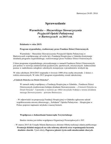 Bartoszyce 24.05. 2016 Sprawozdanie Warmińsko – Mazurskiego Stowarzyszenia Przyjaciół Opieki Paliatywnej w Bartoszycach za 2015 rok Działania w roku 2015: Program stypendialny, realizowany przez Fundusz Dzieci Osieroconych. Warmińsko - Mazurskie Stowarzyszenie Przyjaciół Opieki Paliatywnej w Bartoszycach współpracując od wielu lat z Fundacją Hospicyjną w Gdańsku kontynuuje działania programu stypendialnego, realizowanego przez Fundusz Dzieci Osieroconych. Celem programu stypendialnego, prowadzonego w ramach Funduszu Dzieci Osieroconych jest pomoc w rozwoju zainteresowań językowych, sportowych, artystycznych. Jednocześnie pomoc w nadrobieniu zaległości szkolnych, korepetycje z przedmiotów ścisłych itp. W roku szkolnym 2014/2015 stypendia w kwocie 1000 zł/na osobę otrzymało 2 dzieci z rodzin osieroconych. W roku 2015 program stypendialny został zakończony. „Uśmiech Dziecka na Dzień Dziecka”. W ramach stałej współpracy z Fundacją Hospicyjną w Gdańsku , Funduszu Dzieci Osieroconych zrealizowano kolejne działanie Stowarzyszenia - „Uśmiech Dziecka na Dzień Dziecka”. Upominki o wartości po 100zł otrzymało 4 dzieci z terenu działania naszego Stowarzyszenia – powiatu Bartoszyce. - W odpowiedzi na propozycję Fundacji Hospicyjnej w Gdańsku zgłoszono udział współtworzenia utworu zbiorowego ,, Solidarni” Opieka Paliatywno – Hospicyjna w Polsce poprzez napisanie artykułu o naszej historii. Współpraca z Jednostkami Samorządu Terytorialnego Bardzo istotna jest dobra współpraca Organizacji Pozarządowych z JST. - W marcu 2015 do Urzędu Miasta Bartoszyce złożono Ofertę realizacji zdania publicznego Promocja działań mających na celu ochronę zdrowia oraz wspomagania leczenia skutków chorób. Tytuł oferty Poprawa jakości życia osób nieuleczalnie chorych. Oferta została rozpatrzona z wynikiem pozytywnym, co skutkowało dofinansowaniem zakupu koncentratora tlenu i ssaka elektrycznego. Realizacja całego zadania była w okresie od maja 2015r do grudnia 2015r - Konferencja dotycząca problematyki chorób nowotworowych skóry Na czerniaka może zachorować każdy i w każdym wieku. Liczba zachorowań na raka skóry wzrasta po 20 roku życia. Jednak ryzyko zwiększa się bardzo u kobiet po 30. roku życia, a u mężczyzn po 40. Nieleczony czerniak zazwyczaj prowadzi do powstawania przerzutów i śmierci. Warmińsko – Mazurskie Stowarzyszenie Przyjaciół Opieki Paliatywnej 26 listopada br. w Bartoszyckim Domu Kultury zorganizowało konferencję na temat profilaktyki nowotworów skóry. Na spotkanie tłumnie przybyły klasy gimnazjalne oraz licealiści, a także przedstawiciele organizacji pozarządowych z sektora promocji zdrowia jak i instytucji samorządowych. Podczas konferencji wręczono nagrody w konkursie plastycznym pt. „Rakowi – NIE” skierowanym do dzieci z klas szkół podstawowych. Podczas prelekcji zostały omówione zagadnienia związane z wpływem promieniowania słonecznego i ultrafioletu oraz sposobu odżywiania na skórę a także umiejętność stosowania filtrów przeciwsłonecznych oraz tego jak unikać oparzeń słonecznych i spowodowanych przez ultrafiolet stosowany w solariach. Dodatkową atrakcją dla młodzieży była możliwość dokonania pomiaru ciśnienia oraz cukru we krwi przeprowadzonych przez panie pielęgniarki ze Stacji Socjalnej Johannitów. Ze stoiskiem edukacyjnym wystąpił również partner projektu Państwowa Powiatowa Stacja Sanitarno – Epidemiologiczna. Wydarzenie odbyło się w ramach dotacji Urzędu Miasta Bartoszyce. Kampania ,,Hospicjum To Też Życie” i Akcja ,, Znicz Pamiętam” W ramach działań XII kampanii społecznej „Hospicjum to też Życie” trwającej od 11.10 do 31 .12. 2015r nasze Stowarzyszenie zorganizowało kilka akcji na terenie powiatu bartoszyckiego we współpracy z kilkoma jednostkami tj.: Urząd Miasta Bartoszyce Bartoszycki Dom Kultury. Akcja odbyła się w dniach 29.10 – 2.11. 2015 roku. Do współpracy zaangażowali się wolontariusze akcyjni z LO im Stefana Żeromskiego pod opieką koordynatora wolontariatu. Zebrano kwotę 1904,82 zł w tym koszt zniczy wyniósł 613,10 zł W efekcie całej Akcji uzyskano kwotę 1029, 40 zł , za którą zakupiono 3 materace przeciwodleżynowe. Zarząd Stowarzyszenia podjął decyzję o zatrudnieniu osoby do wykonywania bieżących czynności biurowych na okres 8 miesięcy. Na wynagrodzenie przeznaczono kwotę 1850 zł tj. najniższej krajowej. Zatrudnienie nastąpi jeszcze w grudniu 2015 roku. Współpraca z Fundacją Babci Aliny We wrześniu 2009 roku w Wielkiej Brytanii powstała fundacja charytatywna Fundacja Babci Aliny (Alina Foundation) popierająca hospicja w Polsce. Intencją Fundacji jest wspieranie polskich hospicjów np. zakup sprzętu (aparaty medyczne, opatrunki, lekarstwa, materace, itp) a nie przekazanie pieniędzy. Nasze Stowarzyszenie współpracuje z Fundacją Babci Aliny w wyniku czego otrzymało 1 koncentrator tlenu w sierpniu 2015r. Pomoc Żywnościowa 2014 – 2020 Programu Operacyjnego Pomoc Żywnościowa 2014 – 2020 Podprogram 2015 We wrześniu 2015 r nawiązano współpracę z Bankiem Żywności w Olsztynie a także MOPSem Bartoszyce. Zarząd Stowarzyszenia zobligował się do zorganizowania dystrybucji żywności przez okres 8 miesięcy, w czasie których odbędzie się 6 dostaw żywności z przeznaczeniem dla rodzin najuboższych z naszego miasta. Od września 2015 do końca lutego 2016 roku w Warmińsko –Mazurskim Stowarzyszeniu Przyjaciół Opieki Paliatywnej w Bartoszycach, osoby które otrzymają skierowanie z Ośrodka Pomocy Społecznej mogły skorzystać ze wsparcia w postaci żywności, która cyklicznie była dystrybuowana w formie paczek żywnościowych. Podprogram 2015 jest kontynuacją Podprogramu 2014, w ramach którego Warmińsko – Mazurskie Stowarzyszenie Przyjaciół Opieki Paliatywnej w Bartoszycach objęło wsparciem żywnościowym 1168 osób. - Warsztaty w ra