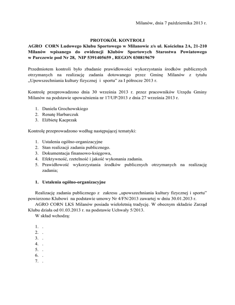 Milanów, dnia 7 października 2013 r. PROTOKÓŁ KONTROLI AGRO CORN Ludowego Klubu Sportowego w Milanowie z/s ul. Kościelna 2A, 21-210 Milanów wpisanego do ewidencji Klubów Sportowych Starostwa Powiatowego w Parczewie pod Nr 28, NIP 5391405659 , REGON 030819679 Przedmiotem kontroli było zbadanie prawidłowości wykorzystania środków publicznych otrzymanych na realizację zadania dotowanego przez Gminę Milanów z tytułu „Upowszechniania kultury fizycznej i sportu” za I półrocze 2013 r. Kontrolę przeprowadzono dnia 30 września 2013 r. przez pracowników Urzędu Gminy Milanów na podstawie upoważnienia nr 17/UP/2013 z dnia 27 września 2013 r. 1. Daniela Grochowskiego 2. Renatę Harbarczuk 3. Elżbietę Kacprzak Kontrolę przeprowadzono według następującej tematyki: 1. 2. 3. 4. 5. Ustalenia ogólno-organizacyjne Stan realizacji zadania publicznego. Dokumentacja finansowo-księgowa, Efektywność, rzetelność i jakość wykonania zadania. Prawidłowość wykorzystania środków publicznych otrzymanych na realizację zadania; 1. Ustalenia ogólno-organizacyjne Realizację zadania publicznego z zakresu „upowszechniania kultury fizycznej i sportu” powierzono Klubowi na podstawie umowy Nr 4/FN/2013 zawartej w dniu 30.01.2013 r. AGRO CORN LKS Milanów posiada wieloletnią tradycję. W obecnym składzie Zarząd Klubu działa od 01.03.2013 r. na podstawie Uchwały 5/2013. W skład wchodzą: 1. 2. 3. 4. 5. 6. 7. . . . . . . . - 2- Skład Komisji Rewizyjnej: 1. . 2. . 3. . Głównym księgowym Klubu jest Pani…. Działalność Klubu reguluje Statut AGRO CORN LKS Milanów, ustawa o działalności pożytku publicznego i o wolontariacie (Dz. U z 2010 r. Nr 234, poz. 1536 z późn. zm.) i Ustawa Prawo o Stowarzyszeniach (Dz. U z 2001 r. Nr 79, poz. 855 z późn. zm.) 2. Stan realizacji zadania publicznego Przedmiotem umowy była realizacja zadań publicznych pod tytułem: 1) organizacja zajęć sportowych dla dzieci, młodzieży i dorosłych; 2) organizacja zawodów i rozgrywek sportowych dla dzieci, młodzieży i dorosłych, imprez sportowo-rekreacyjnych. Na realizację zadania w okresie od 01.01.2013r. do 30.06.2013 r. - przekazano dotację w wysokości 17.050 zł. (słownie: siedemnaście tysięcy pięćdziesiąt złotych) co stanowi 45,5 % całej dotacji na 2013 r. 3. Dokumentacja finansowo-księgowa Zgodnie z § 7 umowy Zleceniobiorca jest zobowiązany do prowadzenia wyodrębnionej dokumentacji finansowo-księgowej i ewidencji księgowej zadania publicznego zgodnie z zasadami wynikającymi z ustawy z dnia 29 września 1994 r. o rachunkowości (Dz. U. z 2013 r. , poz. 330 z późn. zm.). Badaniu kontrolnemu poddano całość kosztów wykazanych przez Klub w ramach realizowanego zadania w okresie od 01.01.2013 r. do 30.06.2013 r. W okresie tym AGRO CORN LKS Milanów wydatkował kwotę w wysokości 16.874,02 zł. na którą składa się kwota pokryta z wkładu osobowego wolontariuszy w wysokości 1.750 zł., środki od sponsora 437,98 zł. i dotacją z Urzędu Gminy 14.686,04 zł. 1. Ocena udziału własnego środków finansowych z innych źródeł. W wyniku kontroli stwierdzono, że AGRO CORN LKS Milanów zgodnie z wcześniej zawartą umową o wkładzie własnym zrealizował zadanie za I półrocze 2013 r. w wysokości 1750 zł. Zadanie zostało zrealizowane na podstawie zawartych umów z wolontariuszami. Dwie umowy zawarte na okres od 3.01.2013 r. do 31.03.2013 r., jedna umowa na okres 03.03.2013 r. do 31.12.2013 r. Pozyskano środki od sponsora 437,98 zł. Udział własny ogółem wynosi 2.187,98 zł. - 3- 2. Koszty za I półrocze 2013 r. poniesione z otrzymanej dotacji. W trakcie kontroli stwierdzono, że zgodnie z zawarta umową 4/FN/2013 z Gminą Milanów na realizacje zadania z zakresu upowszechniania kultury fizycznej i sportu wykorzystano środki w wysokości 14. 686,04 zł. W dokumentach księgowych w/w okresu stwierdzono następujące nieprawidłowości: - Na dokumencie księgowym Nr 2/2013 brak opisu stwierdzającego z jakich środków poniesiono koszty - Na dokumencie księgowym Nr 4/2013 brak daty w opisie merytorycznym zatwierdzającym dokument do realizacji. - Na dokumentach księgowych 14/2013 i 21/2013 brak podpisu w opisie merytorycznym Prezesa lub Wiceprezesa. Wszystkie pozostałe dokumenty księgowe AGRO CORN LKS Milanów poza w/w są opisane przez osoby do tego uprawnione. Każdy dokument jest zatwierdzony pod względem formalnym, rachunkowym i merytorycznym i posiada adnotacje dot. stosowania prawa zamówień publicznych a także adnotacje z jakich środków zostały sfinansowane z dotacji lub od sponsora. 4. Efektywność , rzetelność, jakość wykonania zadania. W wyniku analizy dokumentów źródłowych i sprawozdania AGRO CORN LKS Milanów stwierdzono, że zadanie zostało zrealizowane zgodnie z harmonogramem zamieszczonym w ofercie konkursowej Klubu a także dzięki wykwalifikowanemu zapleczu kadry trenerów. Trenerzy swoją pracę wykonują jako wolontariusze a od 01.04.2013 r. jeden z trenerów zatrudniony został na umowę zlecenie. Celem klubu jest podniesienie jakości wykonywanych zadań: - organizacja zajęć sportowych dla dzieci, młodzieży i dorosłych; - organizacja zawodów i rozgrywek sportowych dla dzieci, młodzieży i dorosłych, imprez sportowo-rekreacyjnych. 5. Prawidłowość wykorzystania środków publicznych otrzymanych na realizację zadania. Sprawozdanie półroczne za okres 01.01.2013 – 30.06.2013 r. z realizacji zadania zostało złożone na prawidłowym druku i zachowaniem terminu. Z dokumentów źródłowych wynika, że nastąpiła pomyłka w Części II. „Sprawozdanie z wykonania wydatków” w tabeli „Rozliczenie ze względu na rodzaj kosztów” nie zamieszczono kwoty 250 zł. i 1500 zł. – udział wolontariuszy w rubryce „koszt za I półrocze 2013 r.” a także brak kwoty 437,98 w rubryce „Pokryte z wkładu osobowego w tym pracy społecznej wolontariuszy i sponsorów” co spowodowało zaniżenie kw