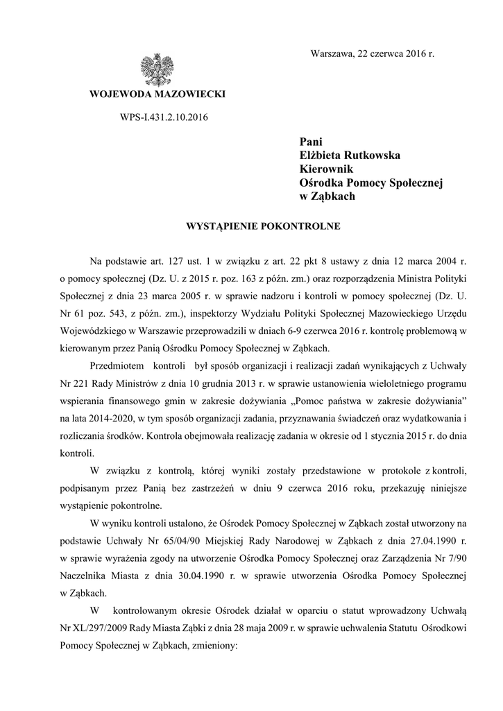 Warszawa, 22 czerwca 2016 r. WOJEWODA MAZOWIECKI WPS-I.431.2.10.2016 Pani Elżbieta Rutkowska Kierownik Ośrodka Pomocy Społecznej w Ząbkach WYSTĄPIENIE POKONTROLNE Na podstawie art. 127 ust. 1 w związku z art. 22 pkt 8 ustawy z dnia 12 marca 2004 r. o pomocy społecznej (Dz. U. z 2015 r. poz. 163 z późn. zm.) oraz rozporządzenia Ministra Polityki Społecznej z dnia 23 marca 2005 r. w sprawie nadzoru i kontroli w pomocy społecznej (Dz. U. Nr 61 poz. 543, z późn. zm.), inspektorzy Wydziału Polityki Społecznej Mazowieckiego Urzędu Wojewódzkiego w Warszawie przeprowadzili w dniach 6-9 czerwca 2016 r. kontrolę problemową w kierowanym przez Panią Ośrodku Pomocy Społecznej w Ząbkach. Przedmiotem kontroli był sposób organizacji i realizacji zadań wynikających z Uchwały Nr 221 Rady Ministrów z dnia 10 grudnia 2013 r. w sprawie ustanowienia wieloletniego programu wspierania finansowego gmin w zakresie dożywiania „Pomoc państwa w zakresie dożywiania” na lata 2014-2020, w tym sposób organizacji zadania, przyznawania świadczeń oraz wydatkowania i rozliczania środków. Kontrola obejmowała realizację zadania w okresie od 1 stycznia 2015 r. do dnia kontroli. W związku z kontrolą, której wyniki zostały przedstawione w protokole z kontroli, podpisanym przez Panią bez zastrzeżeń w dniu 9 czerwca 2016 roku, przekazuję niniejsze wystąpienie pokontrolne. W wyniku kontroli ustalono, że Ośrodek Pomocy Społecznej w Ząbkach został utworzony na podstawie Uchwały Nr 65/04/90 Miejskiej Rady Narodowej w Ząbkach z dnia 27.04.1990 r. w sprawie wyrażenia zgody na utworzenie Ośrodka Pomocy Społecznej oraz Zarządzenia Nr 7/90 Naczelnika Miasta z dnia 30.04.1990 r. w sprawie utworzenia Ośrodka Pomocy Społecznej w Ząbkach. W kontrolowanym okresie Ośrodek działał w oparciu o statut wprowadzony Uchwałą Nr XL/297/2009 Rady Miasta Ząbki z dnia 28 maja 2009 r. w sprawie uchwalenia Statutu Ośrodkowi Pomocy Społecznej w Ząbkach, zmieniony: - Uchwałą Nr X/94/2015 Rady Miasta Ząbki z dnia 24 czerwca 2015 r. w sprawie uchwalenia Statutu Ośrodkowi Pomocy Społecznej w Ząbkach; oraz Regulamin Organizacyjny Ośrodka Pomocy Społecznej w Ząbkach wprowadzony Zarządzeniem Nr 8/2009 r. Kierownika Ośrodka Pomocy Społecznej w Ząbkach z dnia 25 września 2009 r. w sprawie ustalenia Regulaminu Organizacyjnego Ośrodka Pomocy Społecznej w Ząbkach, zmieniony: - Zarządzeniem Nr 0132.3.2016 r. Kierownika Ośrodka Pomocy Społecznej w Ząbkach z dnia 4 kwietnia 2016 r. w sprawie ustalenia Regulaminu Organizacyjnego Ośrodka Pomocy Społecznej w Ząbkach. Kierownik kontrolowanej jednostki działa na podstawie pełnomocnictwa Burmistrza Miasta Ząbki z dnia 10.05.2004 r. do wydawania decyzji administracyjnych w indywidualnych sprawach z zakresu pomocy społecznej należących do właściwości gminy. Ośrodek Pomocy Społecznej w Ząbkach wykonywał czynności kancelaryjne na podstawie instrukcji kancelaryjnej przyjętej Zarządzeniem Nr 0161.4.2013 z dnia 30 grudnia 2013 r. Kierownika Ośrodka Pomocy Społecznej w Ząbkach w sprawie ustalenia Instrukcji kancelaryjnej, jednolitego rzeczowego wykazu akt oraz instrukcji w sprawie organizacji i zakresu działania składnicy akt w Ośrodku Pomocy Społecznej w Ząbkach. Instrukcja została uzgodnionai zatwierdzona przez Archiwum Państwowe w Warszawie pismem IV.401-259/12 z dnia 13.01.2014 r. Gmina Ząbki podjęła następujące akty prawa miejscowego: Uchwałę Nr LIV/498/2014 Rady Miasta Ząbki z dnia 3 kwietnia 2014 r. w sprawie podwyższenia kryterium dochodowego uprawniającego do przyznania nieodpłatnie pomocy w zakresie dożywiania dla osób objętych wieloletnim programem wspierania finansowego gmin w zakresie dożywiania „Pomoc państwa w zakresie dożywiania” na lata 2014-2020. Uchwałę tę zmieniono Uchwałą nr XXII/180/2016 Rady Miasta Ząbki z dnia 8 lutego 2016 r. w sprawie zmiany uchwały Nr LIV/498/2014 Rady Miasta Ząbki z dnia 3 kwietnia 2014 roku w sprawie podwyższenia kryterium dochodowego uprawniającego do przyznania nieodpłatnie pomocy w zakresie dożywiania dla osób objętych wieloletnim programem wspierania finansowego gmin w zakresie dożywiania „Pomoc państwa w zakresie dożywiania” na lata 2014-2020. W ww. uchwale powołując się na art. 8 ust. 2 ustawy z dnia 12 marca 2004 r. o pomocy społecznej podwyższono do 150% kryterium dochodowe dla celów przyznawania pomocy pieniężnej na zakup posiłku. Uchwałę Nr XLV/252/2005 Rady Miasta w Ząbkach z dnia 15 listopada 2005 r. w sprawie zasad zwrotu wydatków za świadczenia z pomocy społecznej będące w zakresie zadań własnych gminy. Uchwała nie jest spójna z zasadami wynikającymi z Programu, który stanowi załącznik do Uchwały Nr 221 Rady Ministrów z dnia 10 grudnia 2013 roku w sprawie ustanowienia wieloletniego programu wspierania finansowego gmin w zakresie dożywiania „Pomoc państwa w zakresie dożywiania” na lata 2014-2020. Gmina Miasta Ząbki nie ma przyjętej uchwały, z której wynikałoby, że nie żąda się zwrotu wydatków za udzielony posiłek albo świadczenie rzeczowe w postaci produktów żywnościowych dla osób których dochód nie przekracza 150% kryterium o którym mowa w art. 8 ust. 1 ustawy o pomocy społecznej. W przypadku wydawania decyzji na pomoc w formie posiłków ww. uchwała odnosi się do posiłków z programu jak i posiłków wydawanych poza programem. Uchwałę Nr LIV/499/2014 Rady Miasta Ząbki z dnia 3 kwietnia 2014 r. w sprawie wieloletniego programu osłonowego w zakresie dożywiania „Pomoc gminy w zakresie dożywiania” na lata 2014-2020. Uchwały Nr XLV/252/2005 i Nr LIV/499/2014 nie zostały przesłane do Wydziału Polityki Społecznej Mazowieckiego Urzędu Wojewódzkiego w Warszawie w celu określenia w umowie odpowiedniego zakresu udzielania pomocy również ze środków budżetu państwa biorąc pod uwagę spójność zapisów uchwalonego aktu prawnego z obowiązujący