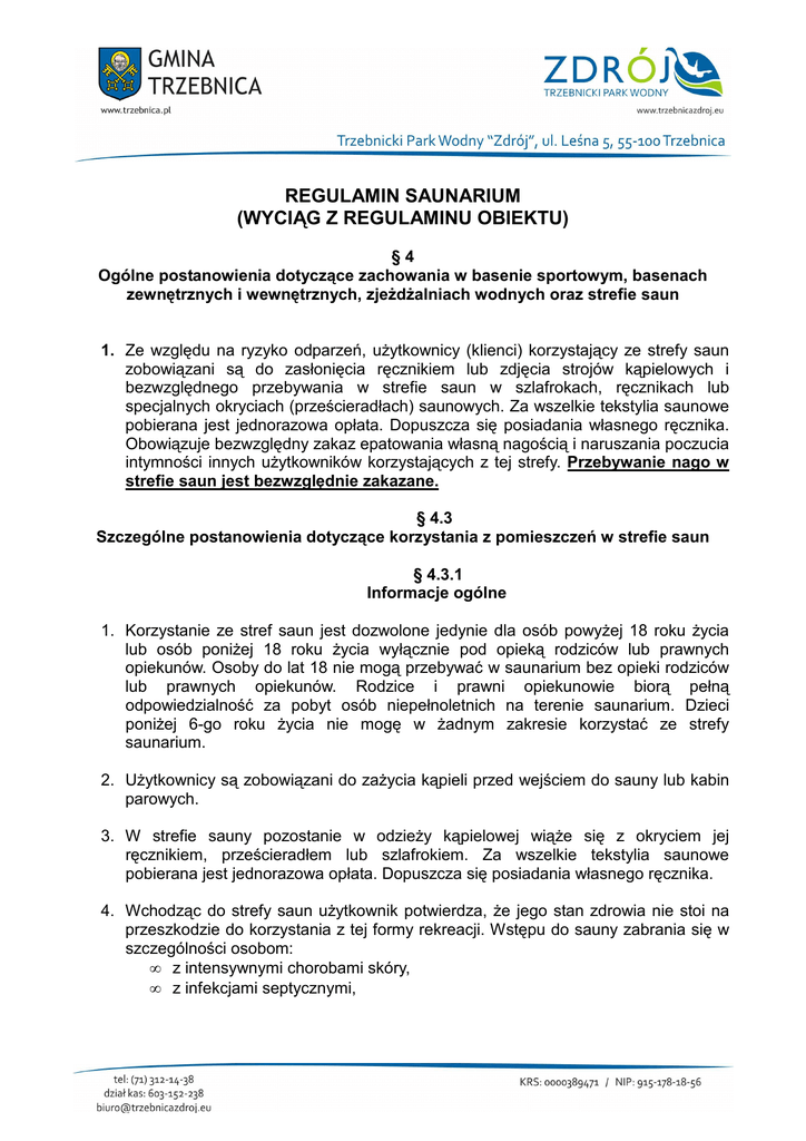 REGULAMIN SAUNARIUM (WYCIĄG Z REGULAMINU OBIEKTU) §4 Ogólne postanowienia dotyczące zachowania w basenie sportowym, basenach zewnętrznych i wewnętrznych, zjeŜdŜalniach wodnych oraz strefie saun 1. Ze względu na ryzyko odparzeń, uŜytkownicy (klienci) korzystający ze strefy saun zobowiązani są do zasłonięcia ręcznikiem lub zdjęcia strojów kąpielowych i bezwzględnego przebywania w strefie saun w szlafrokach, ręcznikach lub specjalnych okryciach (prześcieradłach) saunowych. Za wszelkie tekstylia saunowe pobierana jest jednorazowa opłata. Dopuszcza się posiadania własnego ręcznika. Obowiązuje bezwzględny zakaz epatowania własną nagością i naruszania poczucia intymności innych uŜytkowników korzystających z tej strefy. Przebywanie nago w strefie saun jest bezwzględnie zakazane. § 4.3 Szczególne postanowienia dotyczące korzystania z pomieszczeń w strefie saun § 4.3.1 Informacje ogólne 1. Korzystanie ze stref saun jest dozwolone jedynie dla osób powyŜej 18 roku Ŝycia lub osób poniŜej 18 roku Ŝycia wyłącznie pod opieką rodziców lub prawnych opiekunów. Osoby do lat 18 nie mogą przebywać w saunarium bez opieki rodziców lub prawnych opiekunów. Rodzice i prawni opiekunowie biorą pełną odpowiedzialność za pobyt osób niepełnoletnich na terenie saunarium. Dzieci poniŜej 6-go roku Ŝycia nie mogę w Ŝadnym zakresie korzystać ze strefy saunarium. 2. UŜytkownicy są zobowiązani do zaŜycia kąpieli przed wejściem do sauny lub kabin parowych. 3. W strefie sauny pozostanie w odzieŜy kąpielowej wiąŜe się z okryciem jej ręcznikiem, prześcieradłem lub szlafrokiem. Za wszelkie tekstylia saunowe pobierana jest jednorazowa opłata. Dopuszcza się posiadania własnego ręcznika. 4. Wchodząc do strefy saun uŜytkownik potwierdza, Ŝe jego stan zdrowia nie stoi na przeszkodzie do korzystania z tej formy rekreacji. Wstępu do sauny zabrania się w szczególności osobom: • z intensywnymi chorobami skóry, • z infekcjami septycznymi, • • • • • • • • • • • • • z ostrą infekcją wirusową (np. grypą), z ostrymi stanami zapalnymi organów wewnętrznych, z ostrą lub niewyleczoną gruźlicą, ze stanem zapalnym serca, z ostrymi stanami zawałowymi, z objawami dekompresji, z chorobami przejawiającymi się nagłymi atakami, np. epilepsją, w trzech pierwszych miesiącach po przebytym udarze, z zapaleniem Ŝył, z cięŜkimi wegetatywnymi zaburzeniami centralnego układu nerwowego, z powaŜnymi zaburzeniami układu krąŜenia, z zapalnymi i podleczonymi chorobami skóry oraz egzemami, kobietom w ciąŜy. § 4.3.2. Zachowanie w saunie 1. Do sauny naleŜy wchodzić boso. 2. Z miejsc siedzących w saunie moŜna korzystać jedynie po uprzednim przykryciu ich (np. ręcznikiem kąpielowym). Ręcznik lub inny materiał naleŜy równieŜ podłoŜyć pod stopy. 3. Z leŜaków i miejsc siedzących moŜna korzystać jedynie po uprzednim przykryciu ich np. ręcznikiem, płaszczem czy prześcieradłem kąpielowym. 4. Obsługą saun i znajdujących się w nich urządzeń moŜe zajmować się jedynie personel obiektu . Nie wolno stosować i wnosić Ŝadnych własnych płynów, esencji, olejków czy innych substancji do kąpieli. 5. Przechodząc pomiędzy poszczególnymi pomieszczeniami strefy saun, naleŜy pamiętać o róŜnicy temperatur i być świadomym stanu swojego zdrowia. 6. Nie wolno dotykać elementów instalacji doprowadzającej ciepło, poniewaŜ grozi to oparzeniem. Niedopuszczalne jest umieszczanie jakichkolwiek przedmiotów (np. ręczników, płaszczy i prześcieradeł kąpielowych) w pobliŜu pieca ani na nim, gdyŜ grozi to poŜarem. 7. Poruszanie się po róŜnych poziomach w kabinie sauny, która nie jest wyposaŜona w poręcze wymaga zachowania szczególnej ostroŜności. 8. Wykonywanie masaŜy z uŜyciem szczotek i witek jest ze względów higienicznych zabronione. 9. Zachowanie osób przebywających we wszystkich pomieszczeniach w strefie saun nie moŜe zakłócać wypoczynku innym uŜytkownikom, ani być dla nich uciąŜliwe. Wszyscy korzystający z pomieszczeń przeznaczonych do wypoczynku zobowiązani są do zachowania bezwzględnej ciszy i spokoju. 10. Zabrania się stosowania jakiegokolwiek rodzaju kosmetyków do ciała przed korzystaniem z saun, leŜaków i innych miejsc do siedzenia lub leŜenia, a takŜe przed korzystaniem z basenów i jacuzzi. 11. Zabrania się korzystania z saun kobietom w czasie menstruacji. 12. Zabrania się wnoszenie na teren saun napojów, kosmetyków, jedzenia oraz wszelkich przedmiotów. Wszelkie płyny naleŜy pozostawić w przystosowanych do tego szafkach (przegródkach) przy recepcji. 13. Nie zachowanie bezwzględnej ciszy, odpowiedniego ubioru lub innych niezgodnych z Regulaminem zachowań skutkować będzie wyproszeniem z terenu saunarium bez prawa do zwrotu poniesionych kosztów.