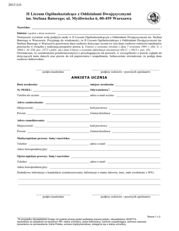 2015 LO II Liceum Ogólnokształcące z Oddziałami Dwujęzycznymi im. Stefana Batorego; ul. Myśliwiecka 6, 00-459 Warszawa Nazwisko: _____________________________________________________________________________________ Imiona: (zgodnie z aktem urodzenia) ____________________________________________________________________ Niniejszym wyrażam wolę podjęcia nauki w II Liceum Ogólnokształcącym z Oddziałami Dwujęzycznymi im. Stefana Batorego w Warszawie. Przyjmuję do wiadomości, że II Liceum Ogólnokształcące z Oddziałami Dwujęzycznymi im. Stefana Batorego w Warszawie przetwarza dane osobowe dotyczące ucznia (w tym dane osobowe rodziców/opiekunów prawnych) w związku z realizacją przepisów prawa, tj. Ustawy o systemie oświaty z dnia 7 września 1991 r. (Dz. U. z 2004 r. Nr 256, poz. 2572 z późn. zm.) oraz Ustawy o systemie informacji oświatowej (Dz.U. z 2015 r. poz. 45). Oświadczam, że zostałem(am) poinformowany(a) o przysługującym mi prawach, w szczególności o prawie wglądu do dotyczących mnie danych oraz prawie do ich poprawiania i uzupełniania. Jednocześnie oświadczam, że podaję dane osobowe dobrowolnie. _______________________ podpis kandydata ____________________ ____________________ podpisy rodziców / prawnych opiekunów ANKIETA UCZNIA Data urodzenia: _________________________________ miejsce urodzenia: ______________________________ Nr PESEL: _____________________________________ Obywatelstwo*: ________________________________ Telefon do ucznia: ________________________________ adres e-mail ucznia: _____________________________ Adres zamieszkania: ____________________________________________________________________________ Miejscowość: ____________________________________ kod pocztowy: __________________________________ Powiat: _________________________________________ Gmina/dzielnica: ________________________________ Adres zameldowania: ___________________________________________________________________________ Miejscowość: ____________________________________ kod pocztowy: __________________________________ Powiat: _________________________________________ Gmina/dzielnica: ________________________________ Matka/opiekun prawny: Imię i nazwisko: ___________________________________________________________ Telefon: ________________________________________ adres e-mail: ___________________________________ Adres korespondencyjny: _________________________________________________________________________ Ojciec/opiekun prawny: Imię i nazwisko: ___________________________________________________________ Telefon: ________________________________________ adres e-mail: ___________________________________ Adres korespondencyjny: _________________________________________________________________________ Dodatkowe informacje o kandydacie (zainteresowania, informacje o stanie zdrowia, inne, stałe zwolnienie z WF): ______________________________________________________________________________________________ ______________________________________________________________________________________________ _______________________ podpis kandydata ____________________ ____________________ podpisy rodziców / prawnych opiekunów ________________________ Strona 1 z 2 * W przypadku obywatelstwa innego niż polskie proszę podać podstawę prawną pobytu: obywatelstwo UE/EFTA, zezwolenie na osiedlenie na terytorium RP, status uchodźcy, pobyt tolerowany, ochrona uzupełniająca, ochrona czasowa, zezwolenia na zamieszkanie, Karta Polaka, umowa międzynarodowa, ubieganie się o status uchodźcy Języki obce (nowożytne) od „zera” kontynuacja język angielski Klasa pre-IB: Wybierz drugi język obcy. Jedyne możliwości to j. francuski (kontynuacja) oraz j. niemiecki (kontynuacja) Klasy dwujęzyczne: język niemiecki język francuski język włoski język rosyjski język hiszpański Wybierz drugi język obcy (poza angielskim). Będziesz się go uczył 3/3/2 godz. tygodniowo Pozostałe klasy: Wybierz dwa języki obce. W szkole nie ma możliwości nauki języka angielskiego „od podstaw”. Każdego z tych języków będziesz się uczył 3/3/2 godz. tygodniowo. W przypadku wyboru języka angielskiego określ jego znajomość: nie znam znam „słabo” poziom FCE poziom CAE Zgoda na wykorzystanie wizerunku ucznia Wyrażam zgodę na umieszczanie zdjęć i materiałów filmowych zawierających wizerunek ucznia (mojego dziecka) zarejestrowanych podczas zajęć i uroczystości szkolnych zorganizowanych przez Zespół Szkół Nr 66 (zwany dalej Szkołą) oraz związanych z reprezentowaniem Szkoły w konkursach i uroczystościach, na stronie internetowej Szkoły, stronach internetowych imprez organizowanych przez Szkołę oraz w profilach serwisów internetowych zarządzanych przez Szkołę. _______________________ podpis kandydata ____________________ ____________________ podpisy rodziców / prawnych opiekunów Religia / Etyka Deklaruję wolę nauki (zaznacz jeden z przedmiotów, w przypadku niewybrania żadnego z poniższych przedmiotów, pozostaw obydwa pola niezaznaczone): Religia (rzymsko-katolicka) Etyka z elementami filozofii _______________________ podpis kandydata ____________________ ____________________ podpisy rodziców / prawnych opiekunów Wychowanie do życia w rodzinie Wychowanie do życia w rodzinie (w przypadku rezygnacji proszę poniżej wpisać „rezygnuję”): _______________________ podpis kandydata ____________________ ____________________ podpisy rodziców / prawnych opiekunów Wstępny wybór 3. przedmiotu rozszerzonego KLASA: mat fiz KLASA: mat geo Chemia Chemia Geografia Historia Historia Informatyka Informatyka Wiedza o społeczeństwie Wiedza o społeczeństwie KLASA: pol hist KLASY: biol chem Matematyka Fizyka Geografia Wiedza o społeczeństwie Załączniki wypełnia pracownik szkoły Oryginał świadectwa 3 fotografie Oryginał zaświadczenia EG Akceptacja warunków programu IB Karta zdrowia z gimnazjum Wstępna deklaracja przedmiotów I