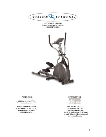 INSTRUKCJA OBSŁUGI ROWERU ELIPTYCZNEGO X6200HRT,X6200 PRODUCENT: STYLE FITNESS GMBH JOHNSON HEALTH TECH. ELISABETHSTRABE 2 50226 FRECHEN DYSTRYBUTOR: DEL SPORT SP. Z O. O. ul. SYROKOMLI 16 03-335 WARSZAWA tel. 22/ 8110102, 8110739, 6744142 e-mail: [email protected] www.visionfitness.pl 1 Instrukcja bezpieczeństwa UWAGA! Przeczytaj uważnie instrukcję obsługi. Zawiera ważne wskazówki dotyczące bezpieczeństwa, użytkowania oraz konserwacji urządzenia. UWAGA! By zmniejszyć ryzyko poparzenia, ognia, porażenia prądem lub innych obrażeń: • Korzystaj z urządzenia zgodnie z jego przeznaczeniem. • Nie wkładaj żadnych przedmiotów w otwory znajdujące się w urządzeniu. • Nie zdejmuj osłon silnika i bloków. Napraw powinien dokonywać jedynie autoryzowany serwis Vision Fitness. • Nie korzystaj z urządzenia jeśli ma uszkodzony przewód lub wtyczkę, urządzenie nie działa poprawnie. Zgłoś się do autoryzowanego przedstawiciela Vision Fitness. • Przewód elektryczny trzymaj z dala od gorących powierzchni. • Nie korzystaj z urządzenia na zewnątrz, poza budynkiem. • Zanim odłączysz urządzenie od gniazdka elektrycznego wyłącz je głównym przełącznikiem i dopiero wtedy wyciągnij wtyczkę z kontaktu. • Ustawiając urządzenie zwróć uwagę by nie przygnieść przewodu elektrycznego. • Odłącz urządzenie od gniazdka elektrycznego zanim je zaczniesz przestawiać. • Dzieciom nie wolno korzystać z urządzenia. • Uważaj na zwierzęta, nie powinny zbliżać się do urządzenia. • • Jeśli poczujesz nagły ból w klatce piersiowej, nudności, zawroty głowy, nie możesz złapać tchu przerwij natychmiast ćwiczenie i skonsultuj się z lekarzem. Do ćwiczenia zakładaj ubrania sportowe oraz takie, które nie mogą zaczepić się o urządzenie. Pij dużo podczas treningu. • Czyszczenie: urządzenie powinno być przecierane wilgotną szmatką. Nie stosuj rozpuszczalników! • 2 Przemieszczanie Maszyna eliptyczna Vision Fitness została wyposażona w kółka transportowe wbudowane w podstawę. By przesunąć urządzenie upewnij się czy jest prawidłowo złożone i zablokowane. Następnie złap za poręcze, przechyl urządzenie (przytrzymując od spodu stopą), tak jak zostało to pokazane na rysunku i przestaw urządzenie. UWAGA! Urządzenie jest ciężkie! Poproś o pomoc. Poziomowanie Jeśli urządzenie nie stoi stabilnie na podłożu to należy je wypoziomować nóżkami regulującymi, które znajdują się od spodu podstaw/prowadnic. Po ustawieniu właściwej pozycji zablokuj nóżki regulujące nakrętkami. Zasilanie Trenażer podłączany jest do zasilania zewnętrznego. Z przodu urządzenia znajduje się wtyczka. Składanie/Rozkładanie Przy składaniu urządzenia ważna jest kolejność wykonywania poszczególnych czynności! 1) Ustaw urządzenie tak, by strzałka znajdująca się na osłonie bocznej trenażera wskazywała godzinę 4. Następnie przekręć dysk, tak by strzałka ustawiona była w kierunku miejsca, w którym łączy się ramię pedału z dyskiem. 3 2) Równocześnie unieś ramię pedału wraz z podstawą (A). Następnie pchnij podstawę tak by zaczepiła się o ramię pedału (B). Upewnij się czy oba elementy się połączyły. Powtórz czynność z drugiej strony urządzenia. 3) By rozłożyć urządzenie naciśnij przycisk znajdujący się od spodu podstawy (C). Następnie opuść jednocześnie ramię pedała wraz z podstawą. Powtórz czynność z drugiej strony urządzenia. Zabezpieczenia Urządzenie zostało wyposażone w dodatkowe zabezpieczenie na podstawy/prowadnice, chroniące dzieci przed zranieniem. Uwaga! Urządzenia nie można złożyć jeśli zostaną założone zabezpieczenia. 4 Pomiar pulsu Czujniki pomiaru pulsu znajdują się na uchwytach. By zmierzyć puls ułóż dłonie na czujnikach w trakcie treningu. Na wyświetlaczu pojawi się wynik pomiaru (choć sygnał pojawi się od razu, to jednak kilka sekund potrwa zanim wyświetlacz zsynchronizuje się z twoim aktualnym rytmem pracy serca). X6200 HRT Wyświetlacz A. START/RESET Po naciśnięciu przycisku START urządzenie zacznie działać w trybie MANUAL bez wprowadzania osobistych ustawień. Po rozpoczęciu programu istnieje możliwość regulacji oporu pedałowania przyciskami oznaczonymi ▲▼. Wyświetlane informacje kalkulowane będą na podstawie standardowych ustawień. PAUZA: By na chwilę zatrzymać program w trakcie realizacji naciśnij przycisk START. Program zostanie wstrzymany na 2 minuty. Po ponownym naciśnięciu przycisku START będzie można kontynuować program. 5 RESET: Jeśli chcesz wykasować informacje znajdujące się na wyświetlaczu podczas treningu naciśnij przycisk START i przytrzymaj, aż do chwili, gdy na wyświetlaczu znikną dane. B. ENTER/ SCAN Przycisk zatwierdzający wybór określonej funkcji: wiek, waga, poziom itd. SCAN: W trakcie realizacji programu naciśnięcie przycisku ENTER pozwoli Ci na przejrzenie informacji na wyświetlaczu. Jeśli przytrzymasz przycisk ENTER przez 3 sekundy podczas treningu funkcja SCAN automatycznie zmieni wyświetlane informacje. C. ▲▼ Przyciski służące do zmiany wartości funkcji przed rozpoczęciem treningu. W trakcie treningu służą do regulacji poziomu funkcji, profili. W programach HRT służą do zmiany tzw.target heart rate. D. PROGRAMY Przyciski szybkiego wyboru ulubionego programu. Program można zmienić w dowolnym momencie realizacji innego programu, wystarczy nacisnąć przycisk nowo obranego programu. E. PROFILE PROGRAMÓW W okienku pojawia się profil programu. Segment profilu, który w danym momencie realizujemy, zrealizowaliśmy oraz poziom oporu w danym segmencie. F. WYŚWIETLANE INFORMACJE W okienku wyświetlają się krok po kroku wszystkie informacje dotyczące treningu: instrukcje, hasła motywacyjne, gratulacje. Czas (TIME): Czas, który pozostał do końca treningu lub czas, który upłynął od rozpoczęcia treningu. Prędkość (SPEED: Prędkość peda