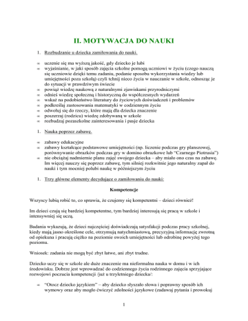 II. MOTYWACJA DO NAUKI 1. Rozbudzanie u dziecka zamiłowania do nauki. • • • • • • • • • uczenie się ma wyższą jakość, gdy dziecko je lubi wyjaśnianie, w jaki sposób zajęcia szkolne pomogą uczniowi w życiu (czego nauczą się uczniowie dzięki temu zadaniu, podanie sposobu wykorzystania wiedzy lub umiejętności poza szkołą) czyli tchnij nieco życia w nauczanie w szkole, odnosząc je do sytuacji w prawdziwym świecie powiąż wiedzę naukową z naturalnymi zjawiskami przyrodniczymi odnieś wiedzę społeczną i historyczną do współczesnych wydarzeń wskaż na podobieństwo literatury do życiowych doświadczeń i problemów podkreślaj zastosowania matematyki w codziennym życiu odwołuj się do rzeczy, które mają dla dziecka znaczenie poszerzaj (rodzicu) wiedzę zdobywaną w szkole rozbudzaj pozaszkolne zainteresowania i pasje dziecka 1. Nauka poprzez zabawę. • • • zabawy edukacyjne zabawy kształcące podstawowe umiejętności (np. liczenie podczas gry planszowej, porównywanie obrazków podczas gry w domino obrazkowe lub “Czarnego Piotrusia”) nie obciążaj nadmiernie planu zajęć swojego dziecka – aby miało ono czas na zabawę. Im więcej nauczy się poprzez zabawę, tym silniej rozkwitnie jego naturalny zapał do nauki i tym mocniej polubi naukę w późniejszym życiu 1. Trzy główne elementy decydujące o zamiłowaniu do nauki: Kompetencje Wszyscy lubią robić to, co sprawia, że czujemy się kompetentni – dzieci również! Im dzieci czują się bardziej kompetentne, tym bardziej interesują się pracą w szkole i intensywniej się uczą. Badania wykazują, że dzieci najczęściej doświadczają satysfakcji podczas pracy szkolnej, kiedy mają jasno określone cele, otrzymują natychmiastową, precyzyjną informację zwrotną od opiekuna i pracują ciężko na poziomie swoich umiejętności lub odrobinę powyżej tego poziomu. Wniosek: zadania nie mogą być zbyt łatwe, ani zbyt trudne. Dziecko uczy się w szkole ale duże znaczenie ma nieformalna nauka w domu i w ich środowisku. Dobrze jest wprowadzać do codziennego życia rodzinnego zajęcia sprzyjające rozwojowi poczucia kompetencji /już u trzyletniego dziecka/: • “Otocz dziecko językiem” – aby dziecko słyszało słowa i poprawny sposób ich wymowy oraz aby mogło ćwiczyć zdolności językowe (zadawaj pytania i prowokuj 1 odpowiedzi dziecka, w naturalny sposób poszerzając ich słownictwo, czytaj książki, opowiadaj historyjki, ucz piosenek, wierszyków, rymowanek). • • Wspomagaj rozwój umiejętności czytania – czytaj mu książki, przerywaj lekturę w środku opowieści i poproś dziecko, żeby przewidziało , co się wydarzy dalej, odwiedzaj z nim księgarnie, biblioteki, pomóż mu znaleźć książki na interesujące go tematy. Zwiększaj kompetencje dziecka w dziedzinie matematyki – angażuj je w codzienne czynności, które wymagają matematycznego rozumowania (rozpoznawanie kształtów, sortowanie, mierzenie, obliczanie, porównywanie, używanie kalendarza, odczytywanie godzin na zegarze) Aby być pilnymi uczniami, dzieci nie tylko muszą wiedzieć, że są kompetentne, ale i wierzyć, że staną się bardziej kompetentne, gdy spróbują czegoś nowego. Jak pomóc dziecku uwierzyć, że może odnieść sukces w szkole: • • • • • • zapewnij mu pozytywne informacje zwrotne – czyli pochwal je za osiągnięcia wyraźnie komunikuj dziecku, że w nie wierzysz (“wiem, że to potrafisz”) przyznaj, że praca jest trudna (unikaj stwierdzeń typu: “nie umiesz tego zrobić? Przecież to takie proste!”) pokazuj pozytywne przykłady (“ja też miałam trudności z matematyki, ale moja wytrwałość i upór w nauce się opłacił – zrozumiałam działania na ułamkach) łącz krytykę z pochwałami (“nie masz problemów z ortografią, ale czasem źle stawiasz przecinki”) wystrzegaj się podawania za przykład rodzeństwa lub kolegów – dopasowuj swoje oczekiwania do każdego dziecka z osobna Samodzielność – swoboda wyboru i odpowiedzialność Samodzielność pozwala dziecku odczuć dumę z własnych osiągnięć. Jeśli kontrolujesz swoje dziecko lub za bardzo mu pomagasz, może być ci wdzięczne lub czuć ulgę, że nie poniosło porażki, ale też nie może przypisać sukcesu wyłącznie sobie. Przekazanie kontroli dziecku pobudza motywację do nauki. Samodzielność dziecka nie oznacza jednak zgadzania się na wszystkie jego zachcianki. Dzieci powinny znać jasne, dobrze zdefiniowane zasady i wiedzieć, jakie są konsekwencje ich łamania (tzw. “wybór w pewnych granicach”) Kiedy wprowadzamy nowe ograniczenia, wyjaśniamy, dlaczego to robimy. Zasady należy przedyskutować z dzieckiem. Można je spisać w formie umowy, którą oboje podpiszecie. W umowie zawrzyj także własne obowiązki. Konsekwencje powinny wypływać ze złamanej zasady. Jeśli twoje dziecko nie nadąża z odrabianiem lekcji, zażądaj od niego, by następnego dnia zasiadł do nich wcześniej, ale nie zabieraj mu deseru ani nie każ mu siedzieć dłużej wieczorem. Pozwól dziecku wybrać styl pracy – np. czytanie na podłodze. 2 Gdy dziecko pracuje już na własną rękę, zachowaj pewien dystans. Nie wywieraj presji, zerkając mu przez ramię, gdy pracuje lub stale pytając, jak mu idzie. Nie wykorzystuj poczucia winy lub obowiązku – “co miesiąc odkładamy pieniądze na twoje korepetycje, a ty nie wkładasz najmniejszego wysiłku w naukę”. Więź opiekuńcza Rodzicielskie wsparcie przyczynia się do wewnętrznego poczucia bezpieczeństwa dziecka” co z kolei korzystnie odbija się na zdolnościach dziecka i jego chęci bycia ciekawskim badaczem otaczającego świata. Jeśli wasze relacje opierają się na wzajemnym szacunku, dziecko będzie przyswajało twoje wartości, włącznie z przekonaniem, że ciężka praca i dobre wyniki są bardzo ważne. Będzie chciało spełnić twoje oczekiwania – nie dlatego, że obawia się ka