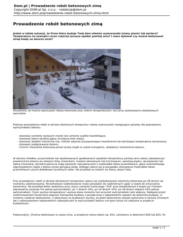 Dom.pl | Prowadzenie robót betonowych zimą Copyright DOM.pl Sp. z o.o. - [email protected] http://www.dom.pl/prowadzenie-robot-betonowych-zima.html Prowadzenie robót betonowych zimą Jesteś w takiej sytuacji, że firma która buduje Twój dom właśnie wymurowała ściany piwnic lub parteru? Temperatura na zewnątrz coraz częściej zaczyna spadać poniżej zera? I masz dylemat czy można betonować strop kiedy na dworze mróz? Oczywiście, że można wykonywać roboty betonowe przy niskich temperaturach, lecz przy zastosowaniu dodatkowych warunków. Podczas prowadzenia robót w okresie obniżonych temperatur należy wykorzystać następujące sposoby dla poprawienia wytrzymałości betonu: - stosować cementy wyższych marek lub cementy szybko twardniejące, - stosować beton bardziej gęsty (mniejsza ilość wody), - stosować dodatki chemiczne (np. chlorek wapnia) przyspieszające twardnienie lub obniżające temperaturę zamarzania, - stosować podgrzewanie betonu, - chronić mieszankę betonową przed utratą ciepła w czasie transportu, układania i twardnienia betonu. W okresie chłodów, przymrozków lub spodziewanych gwałtownych spadków temperatury poniżej zera należy zabezpieczyć powierzchnie betonu po ułożeniu folią, brezentem, matami słomianymi lub trzcinowymi, warstwą piasku, styropianem lub wełną mineralną. Szczelne pokrycia mają wyższość nad pokryciami z materiałów łatwo przenikliwych, gdyż uniemożliwiają odprowadzenie ciepła z betonu przez parującą wodę. Dlatego zaleca się w przypadku stosowania materiałów łatwo przenikliwych użycie dodatkowo szczelnych osłon. Na przykład na matach ze słomy ułożyć folię. Przy prowadzeniu robót w okresie obniżonych temperatur zaleca się rozdeskowywać elementy betonowe po 28 dniach od momentu zabetonowania. Wcześniejsze rozdeskowanie może prowadzić do nadmiernych ugięć a nawet do zniszczenia konstrukcji. Na przykład beton wykonany przy użyciu cementu hutniczego "250" przy temperaturze 0 stopni po 3 dniach dojrzewania uzyskuje 5% pełnej wytrzymałości, po 7 dniach 14%, po 14 dniach 33%, po 28 dniach dopiero 55% pełnej wytrzymałości. Czym wyższa temperatura i wyższa klasa cementu tym przyrost wytrzymałości jest większy. Najlepiej przed rozformowaniem konstrukcji poprosić kierownika budowy o poradę wraz z odpowiednim wpisem do dziennika budowy, iż możemy rozebrać deskowanie. Z obserwacji na budowach wynika, że jeżeli betonownie zostało wykonane w okresie zimowym ale z zastosowaniem odpowiednich zabezpieczeń to wytrzymałość betonu nie była niższa niż założona w projekcie budowlanym. Podsumujmy. Chcemy betonować w czasie zimy, w projekcie mamy beton np. B15, zamówmy w betoniarni B20 lub B25. Po page 1 / 2 Dom.pl | Prowadzenie robót betonowych zimą Copyright DOM.pl Sp. z o.o. - [email protected] http://www.dom.pl/prowadzenie-robot-betonowych-zima.html zabetonowaniu i zagęszczeniu betonu ( dobrze jest wypożyczyć wibrator) przykrywamy cały strop styropianem lub wełną mineralną a na górę kładziemy folię, którą przyciskamy cegłami lub pustakami chroniąc ją przed wiatrem. Jeżeli mróz utrzymuje się przez parę dni podgrzewamy pomieszczenie znajdujące się pod stropem. Najlepiej wstawić tam przenośny piecyk na koks z podłączeniem do komina, zabezpieczyć wszystkie otwory okienne i drzwiowe przed napływem zimna i ogrzewać strop przez kilka dni po zabetonowaniu. Można również wykonać próbki betonu w specjalnych formach i po dojrzewaniu w tych samych warunkach co strop sprawdzić wytrzymałość próbek w laboratorium. page 2 / 2