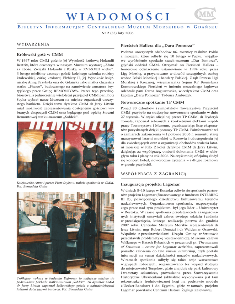 WIADOMOŚCI B I U L E T Y N I N F O R M AC Y J N Y C E N T R A L N E G O M U Z E U M M O R S K I E G O W GDAŃSKU Nr 2 (35) luty 2006 WYDA RZENIA Królewski gość w CMM W 1997 roku CMM gościło Jej Wysokość królową Holandii Beatrix, która otworzyła w naszym Muzeum wystawę „Złoto za zboże. Związki Holandii z Polską w XVI-XVIII wieku”. 3 lutego mieliśmy zaszczyt gościć kolejnego członka rodziny królewskiej, córkę królowej Elżbiety II, Jej Wysokość księżniczkę Annę. Przybyła ona do Gdańska jako matka chrzestna statku „Pharos”, budowanego na zamówienie armatora brytyjskiego przez Grupę REMONTOWA. Prezes tego przedsiębiorstwa, a jednocześnie wieloletni przyjaciel CMM pan Piotr Soyka wybrał nasze Muzeum na miejsce organizacji uroczystego bankietu. Dzięki temu dyrektor CMM dr Jerzy Litwin miał możliwość zaprezentowania dostojnemu gościowi wybranych ekspozycji CMM oraz będącego pod opieką Stoczni Remontowej statku-muzeum „Sołdek”. Pierścień Hallera dla „Daru Pomorza” Podczas uroczystych obchodów 86. rocznicy zaślubin Polski z morzem, które odbyły się 10 lutego w Pucku, wyjątkowe wyróżnienie spotkało statek-muzeum „Dar Pomorza”, gdyński oddział CMM. Otrzymał on Pierścień Hallera – honorowe odznaczenie ustanowione w 1994 roku przez Ligę Morską, a przyznawane w dowód szczególnych zasług wobec Polski Morskiej i Bandery Polskiej. Z rąk Prezesa Ligi Morskiej i Rzecznej, wicemarszałka Sejmu RP Bronisława Komorowskiego Pierścień w imieniu muzealnego żaglowca odebrali: pani Teresa Boguszewska, wicedyrektor CMM oraz kapitan „Daru Pomorza” Tadeusz Ambrożek. Noworoczne spotkanie TP CMM Ponad 80 członków i sympatyków Towarzystwa Przyjaciół CMM przybyło na tradycyjne noworoczne spotkanie w dniu 27 stycznia. W części oficjalnej prezes TP CMM, dr Fryderyk Tomala, zapoznał zebranych z konkretnymi efektami współpracy Towarzystwa i Muzeum, przedstawiając listę eksponatów pozyskanych dzięki pomocy TP CMM. Poinformował też o zamiarach zakończenia w I połowie 2006 r. remontu starej maszynowni latarni morskiej w Rozewiu i udostępnieniu jej dla zwiedzających oraz o organizacji obchodów stulecia latarni morskiej w Stilo. Z kolei dyrektor CMM dr Jerzy Litwin, dziękując za współpracę, omówił dokonania CMM w ubiegłym roku i plany na rok 2006. Na część mniej oficjalną złożył się koncert kolęd, noworoczne życzenia – i długie rozmowy w gronie przyjaciół. W S P Ó Ł P RACA Z Z AGRA NI CĄ Księżniczka Anna i prezes Piotr Soyka w trakcie spotkania w CMM. Fot. Bernadeta Galus Trójkątny wykusz w budynku Dąbrowy to najlepsze miejsce do podziwiania pokładu statku-muzeum ‚Sołdek”. Tu dyrektor CMM dr Jerzy Litwin zapoznał królewskiego gościa z najważniejszymi faktami dotyczącymi parowca. Fot. Bernadeta Galus Inauguracja projektu Lagomar W dniach 8–10 lutego w Rostoku odbyło się spotkanie partnerów projektu Lagomar (finansowanego z funduszu INTERREG III B), poświęconego dziedzictwu kulturowemu terenów nadzalewowych. Organizatorem spotkania, rozpoczynającego prace nad tym projektem, był jego lider – Uniwersytet w Rostoku. W czasie spotkania przedstawiciele zaangażowanych instytucji omawiali zakres swojego udziału i zadania w przedsięwzięciu, którego realizacja potrwa do grudnia 2007 roku. Centralne Muzeum Morskie reprezentowali dr Jerzy Litwin, mgr Robert Domżał i dr Waldemar Ossowski. Wspólnie z przedstawicielami Urzędu Gminy w Sztutowie przedstawili problematykę wystawienniczą Muzeum Zalewu Wiślanego w Kątach Rybackich w prezentacji pt. The museum of Sztutowo – centre for Lagomar activities, zaprezentowali ponadto założenia do tzw. virtual curatorship, czyli portalu informacji na temat działalności muzeów nadzalewowych. W ramach spotkania odbyły się także sesje warsztatowe w grupach roboczych, zorganizowano też wyjazd studyjny do miejscowości Torgelow, gdzie znajduje się park kulturowy i warsztaty szkutnicze, prowadzone przez Stowarzyszenie Historyczne Ukranenland (aktualnie wykonywana jest tam rekonstrukcja średniowiecznej kogi na podstawie modelu z Uecker-Randow) i do Eggesin, gdzie w ramach projektu Lagomar powstanie Centrum Historii Żeglugi Zalewowej. Grupa Monitorująca w CMM Na zaproszenie dyrektora CMM dra J. Litwina w naszym Muzeum odbyło się spotkanie tzw. Grupy Monitorującej, nadzorującej realizację programu Wspólne Dziedzictwo Kulturowe Bałtyku, zainicjowanego przez ministrów kultury krajów nadbałtyckich w 1997 r. W spotkaniu wzięło udział 16 osób, a jego głównymi punktami były: narada nad organizacją i programem III Forum Dziedzictwa Bałtyku w 2007 roku w Wilnie (m.in. zdecydowano o organizacji spotkania w tematycznych grupach roboczych w Kłajpedzie dzień przed rozpoczęciem Forum), a także prezentacja nowej strony internetowej, która będzie dostępna pod adresem www.balticheritage.net. Dyskutowano też nad koncepcją utworzenia grupy tematycznej zajmującej się nadmorskimi fortyfikacjami: pan Zbigniew Balewski z Muzeum Historycznego Miasta Gdańska przedstawił na przykładzie Twierdzy Wisłoujście specyfikę ochrony i konserwacji tego rodzaju zabytków. P OD SUMOWAN I A Jaki był rok 2005? W poprzednim numerze Biuletynu Informacyjnego podaliśmy kilka danych statystycznych dotyczących zeszłorocznej frekwencji w CMM i latarniach morskich. Lektura sprawozdania CMM za ubiegły rok zachęca do przeprowadzenia podobnych podsumowań także w innych dziedzinach działalności Muzeum. Sporo się w 2005 roku zdarzyło w zakresie prac projektowo-budowlanych: powstała koncepcja architektoniczna Ośrodka Kultury Morskiej przy gdańskim Długim Pobrzeżu, zaprojektowany został tzw. domek przycmentarny dla Muzeum Rybołówstwa w Helu, rozpoczęto prace remontowo-adaptacyjne w Muzeum Wisły w Tczewie, wymieniono windę w głównej siedzibie CMM. Przeprowadzono także prace konserwatorskie i malarsko-renowacyj