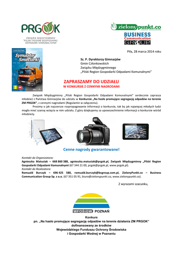 Piła, 28 marca 2014 roku Sz. P. Dyrektorzy Gimnazjów Gmin Członkowskich Związku Międzygminnego „Pilski Region Gospodarki Odpadami Komunalnymi” ZAPRASZAMY DO UDZIAŁU W KONKURSIE Z CENNYMI NAGRODAMI Związek Międzygminny „Pilski Region Gospodarki Odpadami Komunalnymi” serdecznie zaprasza młodzież z Państwa Gimnazjów do udziału w Konkursie „Na hasło promujące segregację odpadów na terenie ZM PRGOK”, z cennymi nagrodami (Regulamin w załączeniu). Prosimy o jak najszersze rozpropagowanie informacji o konkursie, tak by jak najwięcej młodych ludzi mogło mieć szansę wzięcia w nim udziału. Z góry dziękujemy za upowszechnienie informacji o konkursie wśród młodzieży. Cenne nagrody gwarantowane! Kontakt do Organizatora: Agnieszka Matusiak – 668 860 388, [email protected], Związek Międzygminny „Pilski Region Gospodarki Odpadami Komunalnymi (67 344 21 00, [email protected], www.prgok.pl). Kontakt do Realizatora: Romuald Burczyk – 696 425 580, [email protected], ZielonyPunkt.co – Business Communication Group Sp. z o.o. (67 351 05 91, [email protected], www.zielonypunkt.co). Z wyrazami szacunku, Konkurs pn. „Na hasło promujące segregację odpadów na terenie działania ZM PRGOK” dofinansowany ze środków Wojewódzkiego Funduszu Ochrony Środowiska i Gospodarki Wodnej w Poznaniu REGULAMIN KONKURSU „Na hasło promujące segregację odpadów na terenie działania ZM PRGOK” EKOLOGICZNY KONKURS DLA GIMNAZJALISTÓW 1. POSTANOWIENIA OGÓLNE 1. 2. 3. Regulamin jest wydany przez organizatora konkursu Związek Międzygminny „Pilski Region Gospodarki Odpadami Komunalnymi”. Konkurs trwać będzie od dnia ogłoszenia do dnia 30 maja 2014 roku. Celem Regulaminu jest przeprowadzenie Konkursu i uregulowanie wszystkich aspektów jego organizacji. 2. ZASADY UCZESTNICTWA 1. 2. 3. 4. 5. 6. 7. 8. Uczestnikiem Konkursu może być każdy uczeń publicznego bądź niepublicznego gimnazjum w dowolnej gminie na terenie ZM PRGOK. Zadaniem Uczestników jest ułożenie hasła promującego segregacją odpadów na terenie działania ZM PRGOK. Każdy uczestnik może zgłosić maksymalnie dwa hasła. Hasło nie powinno zawierać więcej niż 50 znaków łącznie ze spacjami. Każde hasło musi być zgłoszone na osobnej kartce o formacie A4. Hasło konkursowe na odwrocie kartki należy oznaczyć imieniem i nazwiskiem autora, nazwą placówki oświatowej, do której uczęszcza oraz jej adresem. Hasła konkursowe należy dostarczyć na adres Związku Międzygminnego „Pilski Region Gospodarki Odpadami Komunalnymi” – ul. Dąbrowskiego 8, 64-920 Piła. Do pracy konkursowej Uczestnik załącza zgodę na umieszczenie pracy na stronie internetowej PRGOK i do wykorzystywania pracy w jakikolwiek sposób przez Organizatora. 3. ROZSTRZYGNIĘCIE KONKURSU 1. 2. 3. Jury złożone z pracowników Organizatora, w terminie do 10 czerwca 2014 roku, dokona weryfikacji nadesłanych prac konkursowych i wyłoni laureatów konkursu. Wszystkie prace zostaną opublikowane na stronie internetowej ZM PRGOK, w terminie 20 czerwca 2014 roku, ze wskazaniem wyróżnionych prac konkursowych. Jury konkursu przyzna następujące nagrody: I miejsce – aparat fotograficzny, II miejsce – tablet, III – miejsce – tablet oraz 10 wyróżnień w postaci gry komputerowej „Symulator śmieciarki” 4. POSTANOWIENIA KOŃCOWE 1. 2. 3. 4. Prace konkursowe będą wykorzystywane w ramach kampanii edukacyjnych i informacyjnych ZM PRGOK. Organizator zastrzega sobie prawo do zmian w Regulaminie. Niniejszy regulamin jest dostępny w siedzibie Organizatora: Związek Międzygminny „Pilski Region Gospodarki Odpadami Komunalnymi”, ul. Dąbrowskiego 8, 64-920 Piła. Ostateczna interpretacja niniejszego Regulaminu należy wyłącznie do Organizatora. Konkurs pn. „Na hasło promujące segregację odpadów na terenie działania ZM PRGOK” dofinansowany ze środków Wojewódzkiego Funduszu Ochrony Środowiska i Gospodarki Wodnej w Poznaniu