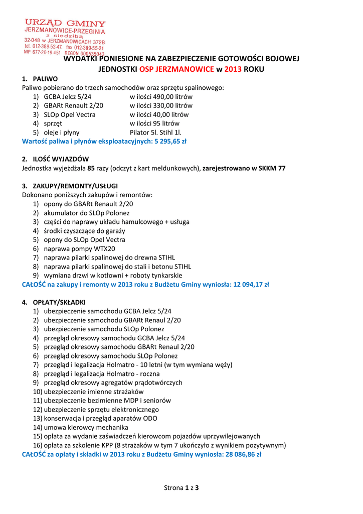 WYDATKI PONIESIONE NA ZABEZPIECZENIE GOTOWOŚCI BOJOWEJ JEDNOSTKI OSP JERZMANOWICE w 2013 ROKU 1. PALIWO Paliwo pobierano do trzech samochodów oraz sprzętu spalinowego: 1) GCBA Jelcz 5/24 w ilości 490,00 litrów 2) GBARt Renault 2/20 w ilości 330,00 litrów 3) SLOp Opel Vectra w ilości 40,00 litrów 4) sprzęt w ilości 95 litrów 5) oleje i płyny Pilator 5l. Stihl 1l. Wartość paliwa i płynów eksploatacyjnych: 5 295,65 zł 2. ILOŚĆ WYJAZDÓW Jednostka wyjeżdżała 85 razy (odczyt z kart meldunkowych), zarejestrowano w SKKM 77 3. ZAKUPY/REMONTY/USŁUGI Dokonano poniższych zakupów i remontów: 1) opony do GBARt Renault 2/20 2) akumulator do SLOp Polonez 3) części do naprawy układu hamulcowego + usługa 4) środki czyszczące do garaży 5) opony do SLOp Opel Vectra 6) naprawa pompy WTX20 7) naprawa pilarki spalinowej do drewna STIHL 8) naprawa pilarki spalinowej do stali i betonu STIHL 9) wymiana drzwi w kotłowni + roboty tynkarskie CAŁOŚĆ na zakupy i remonty w 2013 roku z Budżetu Gminy wyniosła: 12 094,17 zł 4. OPŁATY/SKŁADKI 1) ubezpieczenie samochodu GCBA Jelcz 5/24 2) ubezpieczenie samochodu GBARt Renaul 2/20 3) ubezpieczenie samochodu SLOp Polonez 4) przegląd okresowy samochodu GCBA Jelcz 5/24 5) przegląd okresowy samochodu GBARt Renaul 2/20 6) przegląd okresowy samochodu SLOp Polonez 7) przegląd i legalizacja Holmatro - 10 letni (w tym wymiana węży) 8) przegląd i legalizacja Holmatro - roczna 9) przegląd okresowy agregatów prądotwórczych 10) ubezpieczenie imienne strażaków 11) ubezpieczenie bezimienne MDP i seniorów 12) ubezpieczenie sprzętu elektronicznego 13) konserwacja i przegląd aparatów ODO 14) umowa kierowcy mechanika 15) opłata za wydanie zaświadczeń kierowcom pojazdów uprzywilejowanych 16) opłata za szkolenie KPP (8 strażaków w tym 7 ukończyło z wynikiem pozytywnym) CAŁOŚĆ za opłaty i składki w 2013 roku z Budżetu Gminy wyniosła: 28 086,86 zł Strona 1 z 3 5. MEDIA Zrealizowano/zwrócono koszty: 1) energia elektryczna 2 152,86 zł 2) gaz 8 795,54 zł 3) telefon 516,60 zł 4) Internet 1 166,04 zł CAŁOŚĆ za media w 2013 roku z Budżetu Gminy wyniosła: 12 631,04 zł 6. BADANIA LEKARSKIE 1) badania podstawowe 2) badania psychotechniczne CAŁOŚĆ za badania w 2013 roku z Budżetu Gminy wyniosła: 350,00 zł 7. EKWIWALENT 1) wypłacono ekwiwalent za wyjazdy w 2012 roku 2) wypłacono ekwiwalent za szkolenia w 2013 roku CAŁOŚĆ za ekwiwalent w 2013 roku z Budżetu Gminy wyniosła: 9 555,89 zł 8. WYDATKI PONIESIONE Z REF. INWESTYCJI Opłaty i składki + zadania inwestycyjne poniesione na budynek remizy: 1) przegląd okresowy kominiarski 2) przegląd okresowy instalacji gazowej 3) ubezpieczenie budynku CAŁOŚĆ poniesionych wydatków z Budżetu Gminy wyniosła: 401,99 zł Całkowita wartość poniesiona na OSP Jerzmanowice w 2013 roku na zabezpieczenie gotowości bojowej (działalność bieżąca OSP + inwestycje na budynku remizy) z Budżetu Gminy to: 68 415,60 zł 9. INFORMACJE DODATKOWE WYPOSAŻENIE W SPRZĘT PRZECIWPOŻAROWY W LATACH 1997 - 2013 Sprzęt zakupiony do tej pory przez Gminę o wartości 62 442,11 zł Sprzęt zakupiony w latach 2007 - 2013 ma wartość 40 847,16 zł ZADANIA INWESTYCYJNE W OSTATNICH LATACH Modernizacja remizy w latach 2009 - 2011 wypis z rejestru gruntów, wykonanie kosztorysu inwestorskiego z przedmiarem, wykonanie projektu technicznego instalacji CO i gazowej, wykonanie projektu przebudowy budynku OSP, modernizacja instalacji CO i gazowej, nadzór inwestorski nad modernizacją, decyzja na przebudowę budynku OSP, wykonanie kosztorysu inwestorskiego z przedmiarem na przebudowę budynku OSP, Strona 2 z 3 usunięcie odpadów zawierających azbest, wymiana pokrycia dachowego, tablica informacyjna. Prace remontowe w roku 2012 prace remontowe - klatka schodowa przeróbka instalacji wodnej wymiana włączników, gniazdek i puszek elektrycznych przerobienie wodomierza remont instalacji elektrycznej remont instalacji co montaż boazerii drewnianej (sufit) zakup materiałów remontowo - budowlanych CAŁOŚĆ poniesionych wydatków z Budżetu Gminy wyniosła: 240 130,88 zł Sporządził Zatwierdził Strona 3 z 3