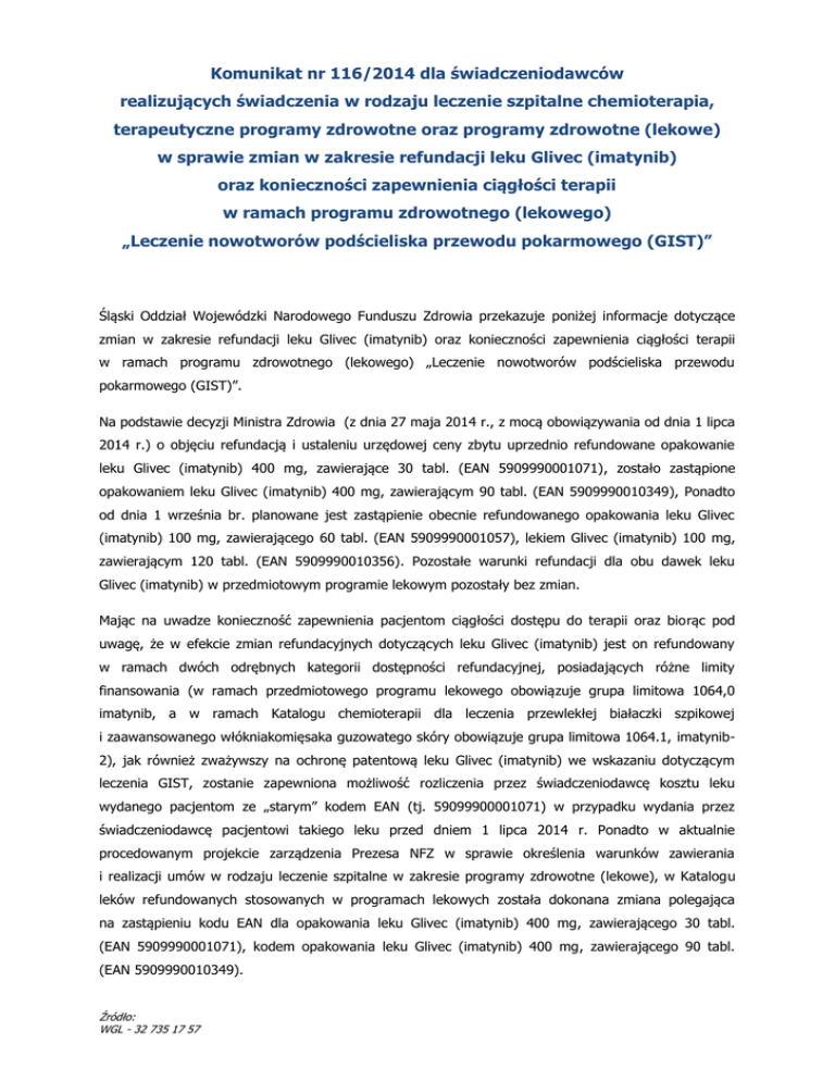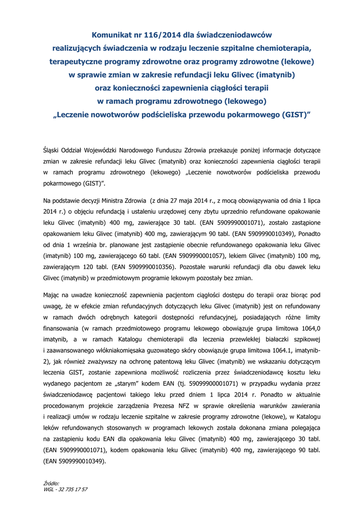 Komunikat nr 116/2014 dla świadczeniodawców realizujących świadczenia w rodzaju leczenie szpitalne chemioterapia, terapeutyczne programy zdrowotne oraz programy zdrowotne (lekowe) w sprawie zmian w zakresie refundacji leku Glivec (imatynib) oraz konieczności zapewnienia ciągłości terapii w ramach programu zdrowotnego (lekowego) „Leczenie nowotworów podścieliska przewodu pokarmowego (GIST)” Śląski Oddział Wojewódzki Narodowego Funduszu Zdrowia przekazuje poniżej informacje dotyczące zmian w zakresie refundacji leku Glivec (imatynib) oraz konieczności zapewnienia ciągłości terapii w ramach programu zdrowotnego (lekowego) „Leczenie nowotworów podścieliska przewodu pokarmowego (GIST)”. Na podstawie decyzji Ministra Zdrowia (z dnia 27 maja 2014 r., z mocą obowiązywania od dnia 1 lipca 2014 r.) o objęciu refundacją i ustaleniu urzędowej ceny zbytu uprzednio refundowane opakowanie leku Glivec (imatynib) 400 mg, zawierające 30 tabl. (EAN 5909990001071), zostało zastąpione opakowaniem leku Glivec (imatynib) 400 mg, zawierającym 90 tabl. (EAN 5909990010349), Ponadto od dnia 1 września br. planowane jest zastąpienie obecnie refundowanego opakowania leku Glivec (imatynib) 100 mg, zawierającego 60 tabl. (EAN 5909990001057), lekiem Glivec (imatynib) 100 mg, zawierającym 120 tabl. (EAN 5909990010356). Pozostałe warunki refundacji dla obu dawek leku Glivec (imatynib) w przedmiotowym programie lekowym pozostały bez zmian. Mając na uwadze konieczność zapewnienia pacjentom ciągłości dostępu do terapii oraz biorąc pod uwagę, że w efekcie zmian refundacyjnych dotyczących leku Glivec (imatynib) jest on refundowany w ramach dwóch odrębnych kategorii dostępności refundacyjnej, posiadających różne limity finansowania (w ramach przedmiotowego programu lekowego obowiązuje grupa limitowa 1064,0 imatynib, a w ramach Katalogu chemioterapii dla leczenia przewlekłej białaczki szpikowej i zaawansowanego włókniakomięsaka guzowatego skóry obowiązuje grupa limitowa 1064.1, imatynib2), jak również zważywszy na ochronę patentową leku Glivec (imatynib) we wskazaniu dotyczącym leczenia GIST, zostanie zapewniona możliwość rozliczenia przez świadczeniodawcę kosztu leku wydanego pacjentom ze „starym” kodem EAN (tj. 59099900001071) w przypadku wydania przez świadczeniodawcę pacjentowi takiego leku przed dniem 1 lipca 2014 r. Ponadto w aktualnie procedowanym projekcie zarządzenia Prezesa NFZ w sprawie określenia warunków zawierania i realizacji umów w rodzaju leczenie szpitalne w zakresie programy zdrowotne (lekowe), w Katalogu leków refundowanych stosowanych w programach lekowych została dokonana zmiana polegająca na zastąpieniu kodu EAN dla opakowania leku Glivec (imatynib) 400 mg, zawierającego 30 tabl. (EAN 5909990001071), kodem opakowania leku Glivec (imatynib) 400 mg, zawierającego 90 tabl. (EAN 5909990010349). Źródło: WGL - 32 735 17 57