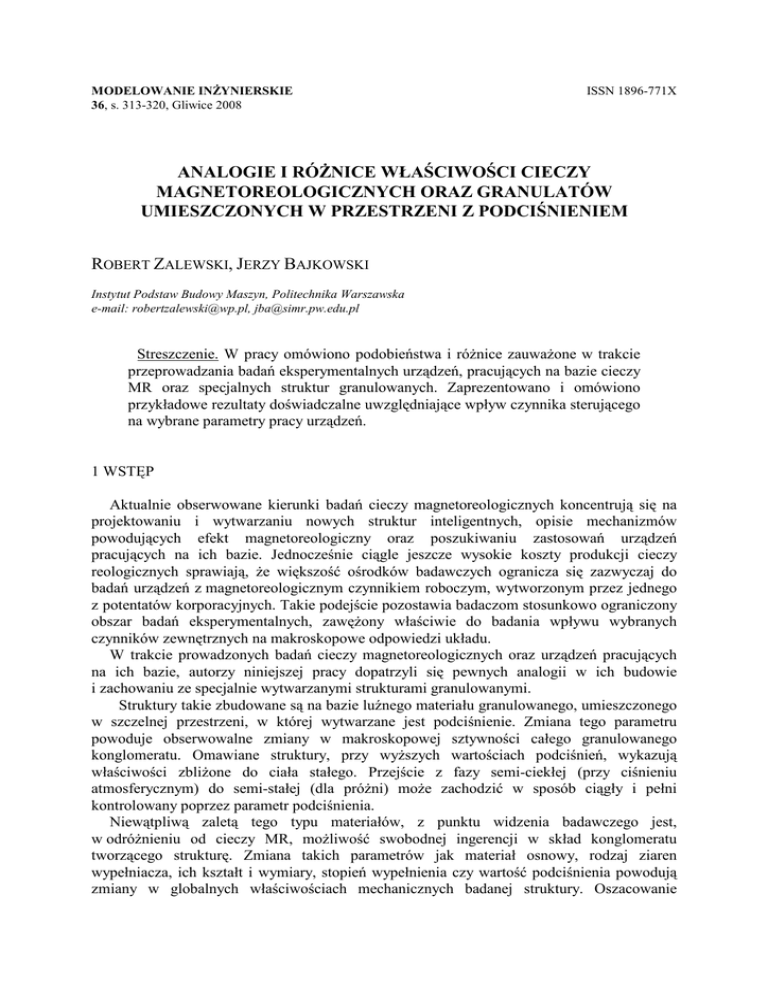 MODELOWANIE INśYNIERSKIE 36, s. 313-320, Gliwice 2008 ISSN 1896-771X ANALOGIE I RÓśNICE WŁAŚCIWOŚCI CIECZY MAGNETOREOLOGICZNYCH ORAZ GRANULATÓW UMIESZCZONYCH W PRZESTRZENI Z PODCIŚNIENIEM ROBERT ZALEWSKI, JERZY BAJKOWSKI Instytut Podstaw Budowy Maszyn, Politechnika Warszawska e-mail: [email protected], [email protected] Streszczenie. W pracy omówiono podobieństwa i róŜnice zauwaŜone w trakcie przeprowadzania badań eksperymentalnych urządzeń, pracujących na bazie cieczy MR oraz specjalnych struktur granulowanych. Zaprezentowano i omówiono przykładowe rezultaty doświadczalne uwzględniające wpływ czynnika sterującego na wybrane parametry pracy urządzeń. 1 WSTĘP Aktualnie obserwowane kierunki badań cieczy magnetoreologicznych koncentrują się na projektowaniu i wytwarzaniu nowych struktur inteligentnych, opisie mechanizmów powodujących efekt magnetoreologiczny oraz poszukiwaniu zastosowań urządzeń pracujących na ich bazie. Jednocześnie ciągle jeszcze wysokie koszty produkcji cieczy reologicznych sprawiają, Ŝe większość ośrodków badawczych ogranicza się zazwyczaj do badań urządzeń z magnetoreologicznym czynnikiem roboczym, wytworzonym przez jednego z potentatów korporacyjnych. Takie podejście pozostawia badaczom stosunkowo ograniczony obszar badań eksperymentalnych, zawęŜony właściwie do badania wpływu wybranych czynników zewnętrznych na makroskopowe odpowiedzi układu. W trakcie prowadzonych badań cieczy magnetoreologicznych oraz urządzeń pracujących na ich bazie, autorzy niniejszej pracy dopatrzyli się pewnych analogii w ich budowie i zachowaniu ze specjalnie wytwarzanymi strukturami granulowanymi. Struktury takie zbudowane są na bazie luźnego materiału granulowanego, umieszczonego w szczelnej przestrzeni, w której wytwarzane jest podciśnienie. Zmiana tego parametru powoduje obserwowalne zmiany w makroskopowej sztywności całego granulowanego konglomeratu. Omawiane struktury, przy wyŜszych wartościach podciśnień, wykazują właściwości zbliŜone do ciała stałego. Przejście z fazy semi-ciekłej (przy ciśnieniu atmosferycznym) do semi-stałej (dla próŜni) moŜe zachodzić w sposób ciągły i pełni kontrolowany poprzez parametr podciśnienia. Niewątpliwą zaletą tego typu materiałów, z punktu widzenia badawczego jest, w odróŜnieniu od cieczy MR, moŜliwość swobodnej ingerencji w skład konglomeratu tworzącego strukturę. Zmiana takich parametrów jak materiał osnowy, rodzaj ziaren wypełniacza, ich kształt i wymiary, stopień wypełnienia czy wartość podciśnienia powodują zmiany w globalnych właściwościach mechanicznych badanej struktury. Oszacowanie 314 R.ZALEWSKI, J. BAJKOWSKI wpływu wybranej grupy parametrów, w tym przede wszystkim wartości generowanego podciśnienia wewnątrz struktury na jej cechy fizyczne, pozwala na znalezienie ciekawych i w pełni konkurencyjnych z klasycznymi materiałami konstrukcyjnymi aplikacji inŜynierskich dla tego typu materiałów. 2 CEL I ZAKRES PRACY Zasadniczym celem pracy jest ujawnienie analogii i róŜnic w charakterze odpowiedzi badanych struktur granulowanych i urządzeń magnetoreologicznych na wstępnie zadane wymuszenia kinematyczne. Opracowanie obejmuje omówienie i analizę rezultatów badań eksperymentalnych: • tłumika magnetoreologicznego firmy LORD RD-1005-3 oraz • specjalnie przygotowanej próbki struktury, której podstawowym elementem składowym jest luźny materiał granulowany. Przedmiotem badań, w przypadku tłumika magnetoreologicznego, jest określenie zmian energetycznych będących funkcją wartości natęŜenia pola elektrycznego przepływającego przez solenoid oraz częstości wymuszenia kinematycznego. W drugim przypadku, specjalnej struktury granulowanej, przedmiotem zainteresowania są równieŜ zmiany właściwości dyssypacyjnych, obserwowane przy zmianie wartości sztucznie wytwarzanego podciśnienia i będące funkcją częstości wymuszenia kinematycznego W podsumowaniu zwrócono uwagę na złoŜoność analizowanych zjawisk, proponując przyszłościowe kierunki badań, zmierzające do pełniejszego poznania i opisu cech fizycznych omawianych struktur. 3 BADANIA EKSPERYMENTALNE Rozdział dotyczący badań eksperymentalnych podzielono na dwie części. Pierwszą z nich poświęcono badaniom komercyjnego amortyzatora pracującego na bazie cieczy MR, oznaczonego jako RD-1005-3. Część druga dotyczy badań struktur granulowanych umieszczonych w specjalnych warunkach. Brak literatury poruszającej tę tematykę zmusił autorów do przeprowadzenia szeregu eksperymentów podstawowych, mających na celu ujawnienie podstawowych właściwości mechanicznych tego typu struktur. Napotkane przy ich realizacji problemy i spostrzeŜenia niejednokrotnie wybiegają tematycznie poza zakres niniejszej pracy i w związku z tym zostaną w niej pominięte. Wcześniejsze prace autorów dotyczące tej tematyki ([5-8]) mają cechy nowatorskie i mogą być traktowane jako swoistego rodzaju elementarz metod eksperymentalnych mechaniki specjalnych struktur granulowanych. 3.1 Badania amortyzatora magnetoreologicznego Badania przeprowadzono wykorzystując powszechnie znany produkt korporacji LORD oznaczony symbolem RD-1005-3. Schemat strukturalny obiektu badawczego zilustrowano na rys. 1. ANALOGIE I RÓśNICE WŁAŚCIWOŚCI CIECZY MAGNETOREOLOGICZNYCH... 315 Rys.1. Schemat strukturalny amortyzatora RD-1005-3 (1-tłok, 2-tłoczysko, 3-cewka, 4szczelina, 5-ciecz magnetoreologiczna, 6- przewody doprowadzające, 7- obudowa, 8 – akumulator powietrzny) Dane techniczno-eksploatacyjne obiektu badawczego zestawiono w tabeli 1. Tabela 1. Dane techniczne badanego amortyzatora magnetoreologicznego [3] Maksymalny skok tłoka ± 25 [mm] Maksymalna długość amortyzatora 210 [mm] Minimalna długość amortyzatora 155 [mm] Masa urządzenia 0,8 [kg] NatęŜenie prądu płynącego w cewce 0-2 [A] Napięcie zasilające 12 [V] Czas odpowiedzi na zmianę pola