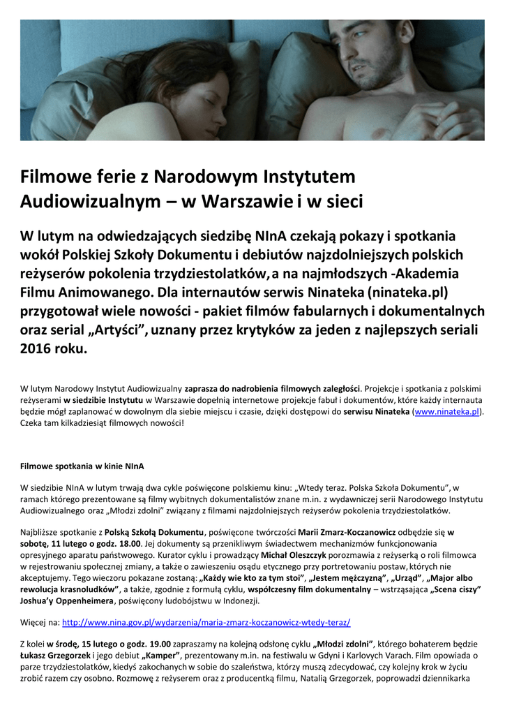 Filmowe ferie z Narodowym Instytutem Audiowizualnym – w Warszawie i w sieci W lutym na odwiedzających siedzibę NInA czekają pokazy i spotkania wokół Polskiej Szkoły Dokumentu i debiutów najzdolniejszych polskich reżyserów pokolenia trzydziestolatków,a na najmłodszych -Akademia Filmu Animowanego. Dla internautów serwis Ninateka (ninateka.pl) przygotował wiele nowości - pakiet filmów fabularnych i dokumentalnych oraz serial „Artyści”, uznany przez krytyków za jeden z najlepszych seriali 2016 roku. W lutym Narodowy Instytut Audiowizualny zaprasza do nadrobienia filmowych zaległości. Projekcje i spotkania z polskimi reżyserami w siedzibie Instytutu w Warszawie dopełnią internetowe projekcje fabuł i dokumentów, które każdy internauta będzie mógł zaplanować w dowolnym dla siebie miejscu i czasie, dzięki dostępowi do serwisu Ninateka (www.ninateka.pl). Czeka tam kilkadziesiąt filmowych nowości! Filmowe spotkania w kinie NInA W siedzibie NInA w lutym trwają dwa cykle poświęcone polskiemu kinu: „Wtedy teraz. Polska Szkoła Dokumentu”, w ramach którego prezentowane są filmy wybitnych dokumentalistów znane m.in. z wydawniczej serii Narodowego Instytutu Audiowizualnego oraz „Młodzi zdolni” związany z filmami najzdolniejszych reżyserów pokolenia trzydziestolatków. Najbliższe spotkanie z Polską Szkołą Dokumentu, poświęcone twórczości Marii Zmarz-Koczanowicz odbędzie się w sobotę, 11 lutego o godz. 18.00. Jej dokumenty są przenikliwym świadectwem mechanizmów funkcjonowania opresyjnego aparatu państwowego. Kurator cyklu i prowadzący Michał Oleszczyk porozmawia z reżyserką o roli filmowca w rejestrowaniu społecznej zmiany, a także o zawieszeniu osądu etycznego przy portretowaniu postaw, których nie akceptujemy. Tego wieczoru pokazane zostaną: „Każdy wie kto za tym stoi”, „Jestem mężczyzną”, „Urząd”, „Major albo rewolucja krasnoludków”, a także, zgodnie z formułą cyklu, współczesny film dokumentalny – wstrząsająca „Scena ciszy” Joshua’y Oppenheimera, poświęcony ludobójstwu w Indonezji. Więcej na: http://www.nina.gov.pl/wydarzenia/maria-zmarz-koczanowicz-wtedy-teraz/ Z kolei w środę, 15 lutego o godz. 19.00 zapraszamy na kolejną odsłonę cyklu „Młodzi zdolni”, którego bohaterem będzie Łukasz Grzegorzek i jego debiut „Kamper”, prezentowany m.in. na festiwalu w Gdyni i Karlovych Varach. Film opowiada o parze trzydziestolatków, kiedyś zakochanych w sobie do szaleństwa, którzy muszą zdecydować, czy kolejny krok w życiu zrobić razem czy osobno. Rozmowę z reżyserem oraz z producentką filmu, Natalią Grzegorzek, poprowadzi dziennikarka popkulturowa, Kaja Klimek. Więcej na: http://www.nina.gov.pl/wydarzenia/%C5%82ukasz-grzegorzek-m%C5%82odzi-zdolni/ Patronat medialny nad cyklami objęło: Wstęp Ze względu na duże zainteresowanie wydarzeniem, do wstępu upoważniają bezpłatne wejściówki, które będziemy wydawać godzinę przed jego rozpoczęciem wydarzenia. Jedna osoba może odebrać maksymalnie 2 wejściówki. Osoby spóźnione nie będą wpuszczane na salę po rozpoczęciu pokazu. Liczba wejściówek jest ograniczona. Wejściówki dotyczą całego wydarzenia. Osoby, które zdecydują się na udział jedynie w spotkaniach po filmie lub w seansie jednego filmu, będziemy wpuszczać w trakcie przerwy między kolejnym częściami programu miarę wolnych miejsc. Nowe fabuły i dokumenty w serwisie Ninateka Do 6400 rozmaitych materiałów audiowizualnych poświęconych polskiej kulturze: rejestracji koncertów i spektakli teatralnych i operowych, reportaży, filmów i audycji, dołączył bogaty zestaw fabuł ze studiów filmowych Zebra i Tor oraz dokumentów ze studiów Kalejdoskop i Indeks. Wszystkie można oglądać nieodpłatnie! Wśród fabuł znalazła się m.in. odnowiona cyfrowo futurystyczna tetralogia Piotra Szulkina: „Golem”, „Wojna światów – następne stulecie”, „O-bi, o-ba. Koniec cywilizacji” i „Ga, ga. Chwała bohaterom”, czyli apokaliptyczne opowieści o świecie rządzonym przez chaos, absurd i przemoc. Do Ninateki trafiły także filmy: Janusza Morgensterna m.in. „Potem nastąpi cisza” - dramat wojenny ukazujący konflikty polityczne i moralne „pokolenia Kolumbów” z udziałem Marka Perepeczki i Daniela Olbrychskiego; Janusza Majewskiego - „Sprawa Gorgonowej”, „Sublokator” i „Zbrodniarz, który ukradł zbrodnię”; Feliksa Falka - „Bohater Roku” i „Szansa”; Magdaleny Łazarkiewicz - „Białe małżeństwo”; Jerzego Stuhra - „Historie miłosne”; Tadeusza Konwickiego „Lawa”, „Jak daleko stąd jak blisko” oraz „Dolina Issy”; jak również „Magnat” Filipa Bajona czy „Julia wraca do domu” Agnieszki Holland. Do grona dokumentów, tak licznie obecnych w Ninatece, dołączyły portrety m.in. Jana Himilsbacha, Krzysztofa Komedy i Andrzeja Dudzińskiego, a także ciekawe: „Hotel Polski” – odsłaniający kulisy tajemniczej i niemal nieznanej historii z okresu Holokaustu, która rozegrała się w Warszawie latem 1943 roku oraz „Bóg jest z nami mężczyznami” w reżyserii Jana Sosińskiego – prezentujący losy Berdie, która zgodnie ze zwyczajowym prawem albańskim mogła zostać mężczyzną, przejmując jego prawa i obowiązki i decydując się na to, by do końca życia pozostać dziewicą. Ponadto, w Ninatece można znaleźć etiudy czołowych polskich reżyserów ze Studia Indeks: Małgorzaty Szumowskiej, Romana Polańskiego czy Radosława Piwowarskiego. Znakomitą okazją do nadrobienia serialowych zaległości będzie udostepnienie w Ninatece serialu „Artyści”, wspólnej produkcji NInA i Telewizji Polskiej autorstwa duetu Monika Strzępka/Paweł Demirski. Serial o fikcyjnej, publicznej scenie teatralnej w Warszawie rozpoczyna scena znalezienia zwłok dyrektora… Występują m.in. Ewa Dałkowska, Agnieszka Glińska, Dorota Segda, Edward Lubaszenko, Jerzy Trela