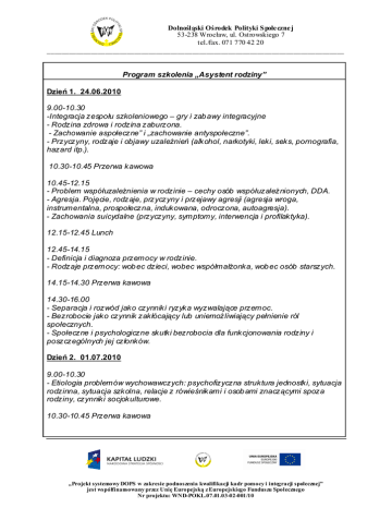 Dolnośląski Ośrodek Polityki Społe czne j 53-238 Wrocław, ul. Ostrowskiego 7 tel./fax. 071 770 42 20 __________________________________________________________________________________ Program szkolenia „Asystent rodziny” Dzień 1. 24.06.2010 9.00-10.30 -Integracja zespołu szkoleniowego – gry i zab awy integracyjne - Rodzina zdrowa i rodzina zaburzona. - Zachowanie aspołeczne” i „zachowanie antyspołeczne”. - Przyczyny, rodzaje i objawy uzależnień (alkohol, narkotyki, leki, seks, pornografia, hazard itp.). 10.30-10.45 Przerwa kawowa 10.45-12.15 - Problem współuzależnienia w rodzinie – cechy osób współuzależnionych, DDA. - Agresja. Pojęcie, rodzaje, przyczyny i przejawy agresji (agresja wroga, instrumentalna, prospołeczna, indukowana, odroczona, autoagresja). - Zachowania suicydalne (przyczyny, symptomy, interwencja i profilaktyka). 12.15-12.45 Lunch 12.45-14.15 - Definicja i diagnoza przemocy w rodzinie. - Rodzaje przemocy: wob ec dzieci, wobec współmałżonka, wob ec osób starszych. 14.15-14.30 Przerwa kawowa 14.30-16.00 - Separacja i rozwód jako czynniki ryzyka wyzwalające przemoc. - Bezrobocie jako czynnik zakłócający lub uniemożliwiający pełnienie ról społecznych. - Społeczne i psychologiczne skutki bezrobocia dla funkcjonowania rodziny i poszczególnych jej członków. Dzień 2. 01.07.2010 9.00-10.30 - Etiologia problemów wychowawczych: psychofizyczna struktura jednostki, sytuacja rodzinna, sytuacja szkolna, relacje z rówieśnikami i osob ami znaczącymi spoza rodziny, czynniki socjokulturowe. 10.30-10.45 Przerwa kawowa „Projekt systemowy DOPS w zakresie podnoszenia kwalifikacji kadr pomocy i integracji społecznej” jest współfinansowany przez Unię Europejską z Europejskiego Funduszu Społecznego Nr projektu: WND-POKL.07.01.03-02-001/10 Dolnośląski Ośrodek Polityki Społe czne j 53-238 Wrocław, ul. Ostrowskiego 7 tel./fax. 071 770 42 20 __________________________________________________________________________________ 10.45-12.15 - Problem patologii zachowań dziecka (dziecko agresywne, nieśmiałe, lęki dziecięce, kłamstwo w życiu dziecka, choroba sieroca, dysleksja rozwojowa, b ulimia i anoreksja, dziecko z ADHD, dziecko niepełnosprawne). 12.15-12.45 Lunch 12.45-14.15 - Błędy wychowawcze- ich uwarunkowania i konsekwencje. - Nieprawidłowe postawy rodzicielskie. - Patologizacja zachowania pod wpływem niepowodzeń szkolnych. 14.15-14.30 Przerwa kawowa 14.30-16.00 - Problem patologii zachowań człowieka dorosłego (zachowania agresywne, lękowe, depresyjne, nerwicowe i przemocowe). Dzień 3. 08.07.2010 9.00-10.30 - Etyka zawodu asystenta rodziny. - Zasady pracy asystenta rodziny. 10.30-10.45 Przerwa kawowa 10.45-12.15 - Rola i zadania asystenta rodziny (diagnozowanie sytuacji rodziny, motywowanie, pomoc i wsparcie sporządzenie planu pomocy rodzinie, współpraca z jednostkami administracji rządowej i samorządu terytorialnego, właściwymi instytucjami, organizacjami pozarządowymi oraz innymi podmiotami i specjalistami działającymi na rzecz dziecka i rodziny, monitorowanie funkcjonowania rodziny po zakończeniu bezpośredniej pomocy). - Kompetencje asystenta rodziny (osobowościowe, społeczne, zawodowe). 12.15-12.45 Lunch 12.45-14.15 - Problemy socjalne rodziny(racjonalne gospodarowanie. rodzinnym b udżetem, zasiłki i zapomogi socjalne). - Problemy psychologiczne w rodzinie(rozwiązywanie sytuacji kryzysowych i konfliktów). - Problemy wychowawcze (rozpoznawanie i rozwiązywanie we współpracy z rodziną i instytucjami wspomagającymi proces wychowania). „Projekt systemowy DOPS w zakresie podnoszenia kwalifikacji kadr pomocy i integracji społecznej” jest współfinansowany przez Unię Europejską z Europejskiego Funduszu Społecznego Nr projektu: WND-POKL.07.01.03-02-001/10 Dolnośląski Ośrodek Polityki Społe czne j 53-238 Wrocław, ul. Ostrowskiego 7 tel./fax. 071 770 42 20 __________________________________________________________________________________ 14.15-14.30 Przerwa kawowa 14.30-16.00 - Aktywność społeczna rodziny (wzmacnianie, zachęcanie do działania). - Aktywność zawodowa rodziny (motywowanie do podejmowania pracy i podnoszenia kwalifikacji zawodowych, planowanie ścieżki kariery zawodowej, łagodzenie psychologicznych skutków b ezrob ocia). - Indywidualny rozwój członków rodziny (pomaganie w wytyczaniu i realizacji życiowych celów). Dzień 4. 15.07.2010 9.00-10.30 - Nawiązanie kontaktu pomocnego. - Poznanie potrzeb i prob lemów (indywidualnych, społecznych i ekonomicznych)rodziny i jej członków. 10.30-10.45 Przerwa kawowa 10.45-12.15 - Zasady sporządzania kontraktu - Określenie bieżących potrzeb socjalnych. - Pomoc w uzyskaniu środków z tytułu świadczeń społecznych. 12.15-12.45 Lunch 12.45-14.15 - Rozwiązywanie problemów rodziny (techniki rozwiązywania konfliktu). 14.15-14.30 Przerwa kawowa 14.30-16.00 - Tworzenie indywidualnych planów z uwzględnieniem predyspozycji, potrzeb , możliwości i ograniczeń. - Analiza i ocena realizacji wyznaczonych w kontrakcie celów i działań. Dzień 5. 22.07.2010 9.00-10.30 - Metody pracy (wywiad, technika analityczna SWOT, genogram, Konferencja Grupy Rodzinnej (KGR),Deb ata za i przeciw, studium przypadku). 10.30-10.45 Przerwa kawowa 10.45-12.15 - Strategie pracy (systemowe podejście do rozwiązywania problemów dzieci, „Projekt systemowy DOPS w zakresie podnoszenia kwalifikacji kadr pomocy i integracji społecznej” jest współfinansowany przez Unię Europejską z Europejskiego Funduszu Społecznego Nr projektu: WND-POKL.07.01.03-02-001/10 Dolnośląski Ośrodek Polityki Społe czne j 53-238 Wrocław, ul. Ostrowskiego 7 tel./fax. 071 770 42 20 __________________________________________________________________________________ małżeństwa/partnerów i rodziny). 12.15-12.45 Lunch 12.45-14.15 - Warunki dob rego kontaktu interpersonalnego. - Bariery i zakłócenia w komunikacji interpersonalnej. - Zasady skuteczneg