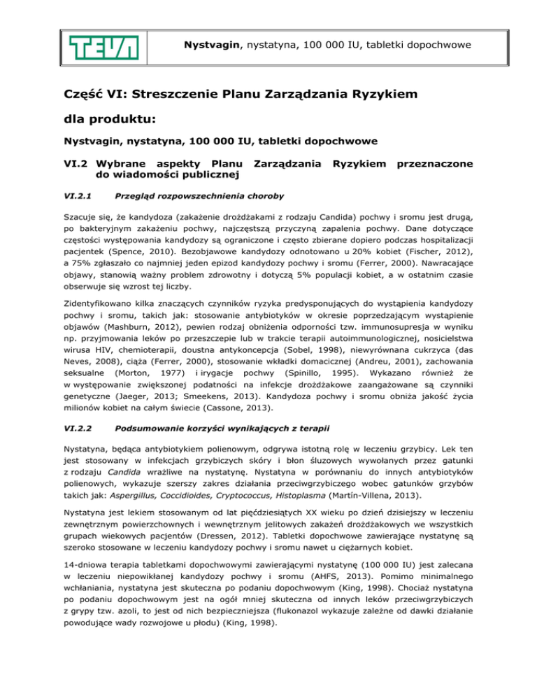 Nystvagin, nystatyna, 100 000 IU, tabletki dopochwowe Część VI: Streszczenie Planu Zarządzania Ryzykiem dla produktu: Nystvagin, nystatyna, 100 000 IU, tabletki dopochwowe VI.2 Wybrane aspekty Planu do wiadomości publicznej VI.2.1 Zarządzania Ryzykiem przeznaczone Przegląd rozpowszechnienia choroby Szacuje się, że kandydoza (zakażenie drożdżakami z rodzaju Candida) pochwy i sromu jest drugą, po bakteryjnym zakażeniu pochwy, najczęstszą przyczyną zapalenia pochwy. Dane dotyczące częstości występowania kandydozy są ograniczone i często zbierane dopiero podczas hospitalizacji pacjentek (Spence, 2010). Bezobjawowe kandydozy odnotowano u 20% kobiet (Fischer, 2012), a 75% zgłaszało co najmniej jeden epizod kandydozy pochwy i sromu (Ferrer, 2000). Nawracające objawy, stanowią ważny problem zdrowotny i dotyczą 5% populacji kobiet, a w ostatnim czasie obserwuje się wzrost tej liczby. Zidentyfikowano kilka znaczących czynników ryzyka predysponujących do wystąpienia kandydozy pochwy i sromu, takich jak: stosowanie antybiotyków w okresie poprzedzającym wystąpienie objawów (Mashburn, 2012), pewien rodzaj obniżenia odporności tzw. immunosupresja w wyniku np. przyjmowania leków po przeszczepie lub w trakcie terapii autoimmunologicznej, nosicielstwa wirusa HIV, chemioterapii, doustna antykoncepcja (Sobel, 1998), niewyrównana cukrzyca (das Neves, 2008), ciąża (Ferrer, 2000), stosowanie wkładki domacicznej (Andreu, 2001), zachowania seksualne (Morton, 1977) i irygacje pochwy (Spinillo, 1995). Wykazano również że w występowanie zwiększonej podatności na infekcje drożdżakowe zaangażowane są czynniki genetyczne (Jaeger, 2013; Smeekens, 2013). Kandydoza pochwy i sromu obniża jakość życia milionów kobiet na całym świecie (Cassone, 2013). VI.2.2 Podsumowanie korzyści wynikających z terapii Nystatyna, będąca antybiotykiem polienowym, odgrywa istotną rolę w leczeniu grzybicy. Lek ten jest stosowany w infekcjach grzybiczych skóry i błon śluzowych wywołanych przez gatunki z rodzaju Candida wrażliwe na nystatynę. Nystatyna w porównaniu do innych antybiotyków polienowych, wykazuje szerszy zakres działania przeciwgrzybiczego wobec gatunków grzybów takich jak: Aspergillus, Coccidioides, Cryptococcus, Histoplasma (Martín-Villena, 2013). Nystatyna jest lekiem stosowanym od lat pięćdziesiątych XX wieku po dzień dzisiejszy w leczeniu zewnętrznym powierzchownych i wewnętrznym jelitowych zakażeń drożdżakowych we wszystkich grupach wiekowych pacjentów (Dressen, 2012). Tabletki dopochwowe zawierające nystatynę są szeroko stosowane w leczeniu kandydozy pochwy i sromu nawet u ciężarnych kobiet. 14-dniowa terapia tabletkami dopochwowymi zawierającymi nystatynę (100 000 IU) jest zalecana w leczeniu niepowikłanej kandydozy pochwy i sromu (AHFS, 2013). Pomimo minimalnego wchłaniania, nystatyna jest skuteczna po podaniu dopochwowym (King, 1998). Chociaż nystatyna po podaniu dopochwowym jest na ogół mniej skuteczna od innych leków przeciwgrzybiczych z grypy tzw. azoli, to jest od nich bezpieczniejsza (flukonazol wykazuje zależne od dawki działanie powodujące wady rozwojowe u płodu) (King, 1998). Nystvagin, nystatyna, 100 000 IU, tabletki dopochwowe Badania nieinterwencyjne przeprowadzone na grupie 973 pacjentek (z których 200 było w ciąży) wymagane przez federalny organ regulacyjny w Niemczech (BfArM) do celów ponownej rejestracji wykazały skuteczność, bezpieczeństwo oraz niski koszt dopochwowego i okołopochwowego leczenia nystatyną kandydozy pochwy i sromu. U 966 pacjentek stwierdzono wyraźne zmniejszenie wszystkich objawów związanych z kandydozą. Nystatyna, co więcej nie straciła swojej skuteczności na przestrzeni lat (Dressen, 2012). VI.2.3 Niewiadome związane z korzyściami leczenia Korzyści wynikające z przeciwgrzybiczego leczenia dopochwowymi tabletkami z nystatyną zależą w dużej mierze od: właściwie postawionej diagnozy (wykluczenie infekcji pochwy o podłożu niegrzybiczym) oraz wrażliwości na nystatynę szczepów będących przyczyną infekcji. Oporność grzybów z rodzaju Candida na nystatynę jest dyskusyjna w ocenie naukowej. Nie ma jednomyślnego stanowiska potwierdzającego lub zaprzeczającego istnieniu oporności na nystatynę. VI.2.4 Streszczenie kwestii związanych z bezpieczeństwem Istotne zidentyfikowane zagrożenia Nie zidentyfikowano dla produktu Nystvagin. Istotne potencjalne zagrożenia Co wiadomo (z uwzględnieniem powodów, dla których Zagrożenia zagrożenie jest uznawane za potencjalne) Niewłaściwa droga podania Istnieje ryzyko niewłaściwego podania tabletek dopochwowych inną drogą niż dopochwowa. Produkt leczniczy ma postać tabletki, zatem istnieje ryzyko jego połknięcia. Lek jest przeznaczony tylko do podania dopochwowego. Miejscowe podrażnienia skóry Podczas prawidłowego dopochwowego stosowania tabletek i błon śluzowych z nystatyną zgłaszano miejscowe podrażnienia skóry i błon śluzowych. Rozwój oporności Niektóre szczepy Candida mogą wykazywać oporność na nystatynę, prowadzącą do braku oczekiwanej skuteczności zastosowanego leczenia. Istotne brakujące informacje Nie zidentyfikowano dla produktu Nystvagin. VI.2.5 Podsumowanie środków zmniejszających ryzyko Wszystkie produkty lecznicze posiadają Charakterystykę Produktu Leczniczego, która dostarcza lekarzom, farmaceutom oraz innym przedstawicielom zawodów medycznych informacji o tym jak stosować produkt leczniczy, jakie są ryzyka związane z jego stosowaniem oraz zalecenia dotyczące zmniejszania tych ryzyk. Nystvagin, nystatyna, 100 000 IU, tabletki dopochwowe Produkt leczniczy Nystvagin, nystatyna, 100 000 IU, tabletki dopochwowe nie posiada dodatkowych środków zmniejszania ryzyka wynikającego z stosowania produktu, jako, że środki rutynowe są wystarczające. VI.2.6 Zakładany plan nadzoru nad bezpieczeństwem produktu leczniczego po wprowadzeniu do obrotu Nie dotyczy, 
