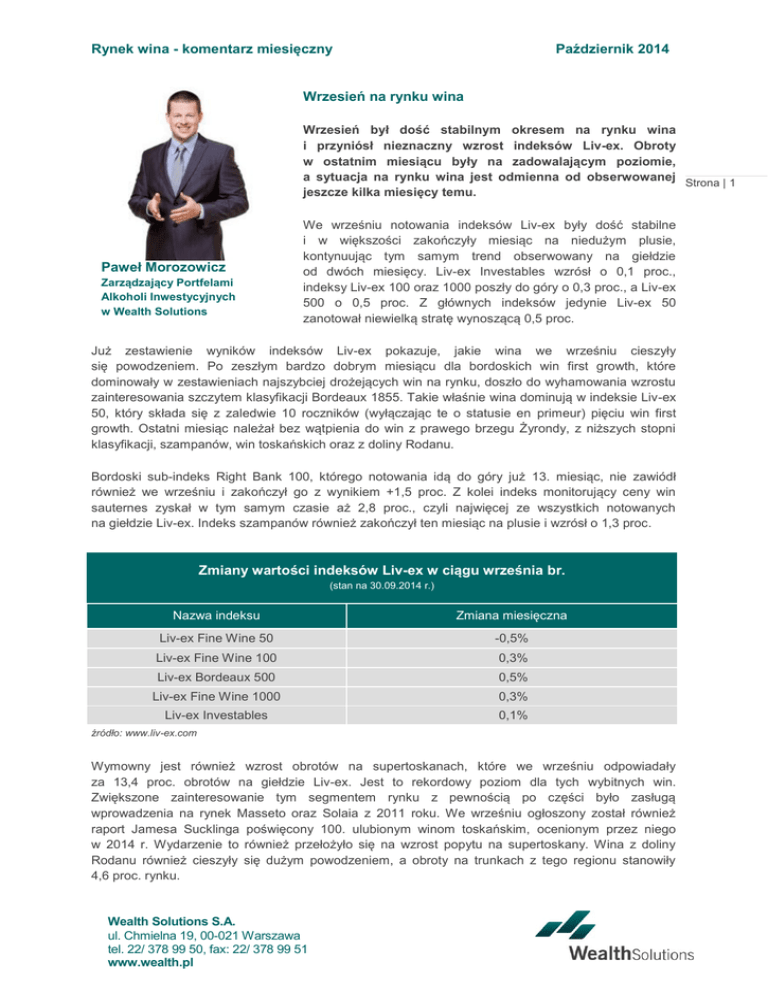 Rynek wina - komentarz miesięczny Październik 2014 Wrzesień na rynku wina Wrzesień był dość stabilnym okresem na rynku wina i przyniósł nieznaczny wzrost indeksów Liv-ex. Obroty w ostatnim miesiącu były na zadowalającym poziomie, a sytuacja na rynku wina jest odmienna od obserwowanej Strona | 1 jeszcze kilka miesięcy temu. Paweł Morozowicz Zarządzający Portfelami Alkoholi Inwestycyjnych w Wealth Solutions We wrześniu notowania indeksów Liv-ex były dość stabilne i w większości zakończyły miesiąc na niedużym plusie, kontynuując tym samym trend obserwowany na giełdzie od dwóch miesięcy. Liv-ex Investables wzrósł o 0,1 proc., indeksy Liv-ex 100 oraz 1000 poszły do góry o 0,3 proc., a Liv-ex 500 o 0,5 proc. Z głównych indeksów jedynie Liv-ex 50 zanotował niewielką stratę wynoszącą 0,5 proc. Już zestawienie wyników indeksów Liv-ex pokazuje, jakie wina we wrześniu cieszyły się powodzeniem. Po zeszłym bardzo dobrym miesiącu dla bordoskich win first growth, które dominowały w zestawieniach najszybciej drożejących win na rynku, doszło do wyhamowania wzrostu zainteresowania szczytem klasyfikacji Bordeaux 1855. Takie właśnie wina dominują w indeksie Liv-ex 50, który składa się z zaledwie 10 roczników (wyłączając te o statusie en primeur) pięciu win first growth. Ostatni miesiąc należał bez wątpienia do win z prawego brzegu Żyrondy, z niższych stopni klasyfikacji, szampanów, win toskańskich oraz z doliny Rodanu. Bordoski sub-indeks Right Bank 100, którego notowania idą do góry już 13. miesiąc, nie zawiódł również we wrześniu i zakończył go z wynikiem +1,5 proc. Z kolei indeks monitorujący ceny win sauternes zyskał w tym samym czasie aż 2,8 proc., czyli najwięcej ze wszystkich notowanych na giełdzie Liv-ex. Indeks szampanów również zakończył ten miesiąc na plusie i wzrósł o 1,3 proc. Zmiany wartości indeksów Liv-ex w ciągu września br. (stan na 30.09.2014 r.) Nazwa indeksu Zmiana miesięczna Liv-ex Fine Wine 50 -0,5% Liv-ex Fine Wine 100 0,3% Liv-ex Bordeaux 500 0,5% Liv-ex Fine Wine 1000 0,3% Liv-ex Investables 0,1% źródło: www.liv-ex.com Wymowny jest również wzrost obrotów na supertoskanach, które we wrześniu odpowiadały za 13,4 proc. obrotów na giełdzie Liv-ex. Jest to rekordowy poziom dla tych wybitnych win. Zwiększone zainteresowanie tym segmentem rynku z pewnością po części było zasługą wprowadzenia na rynek Masseto oraz Solaia z 2011 roku. We wrześniu ogłoszony został również raport Jamesa Sucklinga poświęcony 100. ulubionym winom toskańskim, ocenionym przez niego w 2014 r. Wydarzenie to również przełożyło się na wzrost popytu na supertoskany. Wina z doliny Rodanu również cieszyły się dużym powodzeniem, a obroty na trunkach z tego regionu stanowiły 4,6 proc. rynku. Wealth Solutions S.A. ul. Chmielna 19, 00-021 Warszawa tel. 22/ 378 99 50, fax: 22/ 378 99 51 www.wealth.pl Rynek wina - komentarz miesięczny Październik 2014 W tym samym czasie zmalał udział Bordeaux. Jest to w przeważającej mierze efekt nie tak dużego w porównaniu z poprzednim miesiącem zainteresowania winami first growth. Wina znad Żyrondy odpowiadały we wrześniu za 71,7 proc. rynku, co jest najniższym poziomem do 9 miesięcy. Wymowny jest również fakt, że wina first growth, które jeszcze rok temu odpowiadały za 35 proc. rynku (a w szczycie aż za 70 proc.), podczas ostatniego miesiąca zgromadziły pod swoimi skrzydłami tylko 27 proc. rynku. Na rynku wina we wrześniu wciąż panował wzmożony ruch i obecnie panujące nastroje są zupełnie odmienne od tych obserwowanych w tym miejscu przed kilka miesiącami. Wprawdzie wartość transakcji jest niższa niż przed rokiem o 5,6 proc., jednak ich ilość jest już o 39,5 proc. wyższa. Różnorodność na szczycie tabeli Oczywiście obserwowane powyżej zjawiska odbiły się również na zestawieniu najszybciej drożejących win. Panowała tu dużo większa różnorodność niż w sierpniu, kiedy to ranking został całkowicie zdominowany przez wina bordoskie, pochodzące z górnej części klasyfikacji. Pięć najszybciej drożejących win na giełdzie Liv-ex we wrześniu 2014 r. Wino Rocznik Średnia cena we wrześniu 2014 r. (GBP)* Wzrost ceny Montrose 2010 1 553 19,0% DRC, Tache 2010 21 500 12,9% Opus One 2001 2 073 12,4% Sassicaia 2001 1 730 11,9% Pichon Lalande 2010 1 021 10,0% źródło: www.liv-ex.com *za 12-butelkową skrzynkę Pięć najszybciej drożejących roczników Montrose we wrześniu 2014 r. Wino Rocznik Średnia cena we wrześniu 2014 r. (GBP)* Wzrost ceny Montrose 2010 1 553 19,0% Montrose 2005 862 8,8% Montrose 1989 2 540 5,7% Montrose 2000 1 065 4,9% Montrose 2009 1 900 3,4% źródło: www.liv-ex.com Wealth Solutions S.A. ul. Chmielna 19, 00-021 Warszawa tel. 22/ 378 99 50, fax: 22/ 378 99 51 www.wealth.pl *za 12-butelkową skrzynkę Strona | 2 Rynek wina - komentarz miesięczny Październik 2014 Tym razem znalazły się w tym zestawieniu dwa wina z drugiego stopnia klasyfikacji Bordeaux 1855 (Montrose, Pichon Lalande), jedno burgundzkie (DRC Tache), jedno kalifornijskie (Opus One) oraz jedno pochodzące z Toskanii (Sassicaia). Na dalszy wzrost cen Montrose wpływ miały oczywiście noty Roberta Parkera, o których szerzej pisaliśmy ostatnio. W tym miesiącu najwięcej zdrożał znakomity rocznik 2010 z Montrose, którego ocena została zmieniona z 99 na maksymalne 100 punktów. We wrześniu zyskał na wartości 19,0 proc., a w sierpniu 6,5 proc. Globalna kampania promocyjna CIVB Conseil Interprofessionnel du Vin de Bordeaux (CIVB) stowarzyszenie producentów i kupców bordoskich zapowiedziało na dzień 27 października start szerokiej kampanii reklamowej mającej na celu promowanie win Bordeaux. Kampania skierowana jest na główne rynki zbytu dla win z tego regionu czyli: Francję, Wielką Brytanię, Niemcy, Belgię, Stany Zjednoczone, Chiny i Japonię. Stowarzyszenie przewiduje wydanie 40% swoje