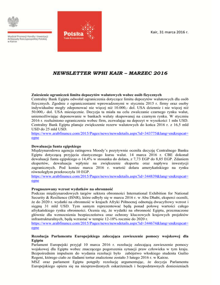 Kair, 31 marca 2016 r. NEWSLETTER WPHI KAIR – MARZEC 2016 Zniesienie ograniczeń limitu depozytów walutowych wobec osób fizycznych Centralny Bank Egiptu odwołał ograniczenia dotyczące limitu depozytów walutowych dla osób fizycznych. Zgodnie z ograniczeniami wprowadzonymi w styczniu 2015 r. firmy oraz osoby indywidualne mogły zdeponować nie więcej niż 10.000,- dol. USA dziennie i nie więcej niż 50.000,- dol. USA miesięcznie. Decyzja ta miała na celu zwalczanie czarnego rynku walut, uniemożliwiając deponowanie w bankach waluty skupowanej na czarnym rynku. W styczniu 2016 r. rozluźniono ograniczenia wobec firm, zezwalając na depozyt w wysokości 1 mln USD. Centralny Bank Egiptu planuje zwiększenie rezerw walutowych do końca 2016 r. z 16,5 mld USD do 25 mld USD. https://www.arabfinance.com/2015/Pages/news/newsdetails.aspx?id=343775&lang=en&repcat= egne Dewaluacja funta egipskiego Międzynarodowa agencja ratingowa Moody’s pozytywnie oceniła decyzję Centralnego Banku Egiptu dotyczącą przyjęcia elastycznego kursu walut. 14 marca 2016 r. CBE dokonał dewaluacji funta egipskiego o 14,4% w stosunku do dolara, z 7,73 EGP do 8,85 EGP. Zdaniem ekspertów, dewaluacja wpłynie na zwiększenie eksportu oraz napływu inwestycji zagranicznych. Pod koniec marca 2016 r. wartość dolara amerykańskiego na rynku równoległym przekroczyła 10 EGP. https://www.arabfinance.com/2015/Pages/news/newsdetails.aspx?id=344839&lang=en&repcat= egne Prognozowany wzrost wydatków na obronność Podczas międzynarodowych targów sektora obronności International Exhibition for National Security & Resilience (ISNR), które odbyły się w marcu 2016 r. w Abu Dhabi, eksperci ocenili, że do 2020 r. wydatki na obronność w krajach Afryki Północnej odnotują dwucyfrowy wzrost i sięgną 31 mld USD. Tym samym reprezentować będą ponad połowę wartości całego afrykańskiego rynku obronności. Ocenia się, że wydatki na obronność Egiptu, przeznaczone głównie dla wzmocnienia bezpieczeństwa oraz ochrony kluczowych krajowych projektów infrastrukturalnych, będą wzrastać w tempie 12-18% rocznie do 2020 r. https://www.arabfinance.com/2015/Pages/news/newsdetails.aspx?id=344674&lang=en&repcat= egne Rezolucja Parlamentu Europejskiego zalecająca zawieszenie pomocy wojskowej dla Egiptu Parlament Europejski przyjął 10 marca 2016 r. rezolucję zalecającą zawieszenie pomocy wojskowej dla Egiptu wobec znaczącego pogorszenia sytuacji praw człowieka w tym kraju. Bezpośrednim impulsem do wydania rezolucji było zabójstwo włoskiego studenta Guilio Regeni, którego ciało ze śladami tortur znalezione zostało 3 lutego 2016 r. w Kairze. MSZ oraz parlament Egiptu potępiły rezolucję argumentując, że decyzja Parlamentu Europejskiego opiera się na niesprawdzonych oskarżeniach i bezpodstawnych doniesieniach mediów, a przypadek Regeni nie ma związku z sytuacją praw człowieka w Egipcie. Strona egipska podkreśliła, że w sprawie śmierci włoskiego studenta wciąż jeszcze prowadzone jest dochodzenie. Rezolucja przyjęta przez Parlament Europejski nie jest wiążąca. http://www.dailynewsegypt.com/2016/03/12/parliament-foreign-ministry-condemn-euparliament-resolution/ Problemy z repatriacją zysków zagranicznych linii lotniczych Minister lotnictwa cywilnego zawarł porozumienie z Centralnym Bankiem Egiptu na rzecz stopniowego przewalutowania zysków uzyskanych przez zagraniczne linie lotnicze, które w ostatnim okresie protestowały ze względu na brak możliwości repatriacji zysków z powodu wprowadzonych ograniczeń walutowych. Porozumienie dotyczy linii: British Airways, Air France, KLM /120 mln EGP/, Saudi Arabian Airlines /ok. 100 mln EGP/, Emirates Airlines /100 mln EGP/. Aktualnie prowadzone są negocjacje z poszczególnymi przewoźnikami w kwestii wysokości transferów, które dokonywane będą według oficjalnego kursu dolara. https://www.arabfinance.com/2015/Pages/news/newsdetails.aspx?id=343260&lang=en&repcat= egne Planowany zakup 4 – 4,5 mln ton pszenicy krajowej Wiceprzewodniczący GASC, agencji rządowej zajmującej się importem surowców konsumpcyjnych oświadczył, że w bieżącym roku planowany jest zakup 4 – 4,5 mln ton pszenicy krajowej. Egipt corocznie ustala cenę skupu pszenicy egipskiej wyższą od cen światowych, starając się zachęcić rolników do jej uprawy. Cena pszenicy krajowej ustalona w 2015 r. była o ok. 150,- USD wyższa od cen na rynku światowym, dzięki czemu udało się skupić 5,3 mln ton egipskiej pszenicy, w porównaniu do 3,7 mln ton zakupionych na rynku lokalnym rok wcześniej. Eksperci oceniają, że ok. 2 mln ton pszenicy sprzedanej w 2015 r. jako lokalnej produkcji pochodziło z zagranicy. https://www.arabfinance.com/2015/Pages/news/newsdetails.aspx?id=344384&lang=en&repcat= egne Rozwój produkcji drobiu w Egipcie W opinii egipskiego ministra rolnictwa, Essama Fayeda, produkcja drobiu w Egipcie rozwija się bardzo dynamicznie. W branży drobiarskiej pracuje ok. 2,5 mln Egipcjan, a wartość inwestycji kształtuje się na poziomie 30 mld EGP. Roczna produkcja to 1,25 mld piskląt, ok. 1 mld kurczaków i ok. 8 mld jaj. W Egipcie działa 22 tys. licencjonowanych hodowli drobiu. https://www.arabfinance.com/2015/Pages/news/newsdetails.aspx?id=343450&lang=en&repcat= egne Częściowa zmiana składu rządu Arabskiej Republiki Egiptu Prezydent Egiptu, Abdel Fattah Al Sisi mianował 23 marca 2016 r. dziesięciu nowych ministrów. Zmiany objęły ministerstwa: sprawiedliwości, finansów, inwestycji, starożytności, turystyki, transportu, lotnictwa cywilnego, nawadniania oraz pracy. Utworzone zostało również nowe ministerstwo spraw publicznych. Premier rządu Egiptu przedstawił 27 marca 2016 r. rządowy program, który poddany zostanie pod debatę parlamentarną. Zgodnie z konstytucją rząd ma 30 dni na uzyskanie wotum zaufania. http://egyptianstreets.com/2016/03/23/egypts-sisi-swears-in-10-new-ministers-in-cabinetreshuffle/