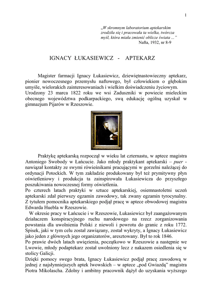 1 „W skromnym laboratorium aptekarskim zrodziła się i pracowała ta wielka, twórcza myśl, która miała zmienić oblicze świata ...” Nafta, 1932, nr 8-9 IGNACY ŁUKASIEWICZ - APTEKARZ Magister farmacji Ignacy Łukasiewicz, dziewiętnastowieczny aptekarz, pionier nowoczesnego przemysłu naftowego, był człowiekiem o głębokim umyśle, wielorakich zainteresowaniach i wielkim doświadczeniu Ŝyciowym. Urodzony 23 marca 1822 roku we wsi Zaduszniki w powiecie mieleckim obecnego województwa podkarpackiego, swą edukację ogólną uzyskał w gimnazjum Pijarów w Rzeszowie. Praktykę aptekarską rozpoczął w wieku lat czternastu, w aptece magistra Antoniego Swobody w Łańcucie. Jako młody praktykant aptekarski – puer nawiązał kontakty ze swymi rówieśnikami pracującymi w gorzelni naleŜącej do ordynacji Potockich. W tym zakładzie produkowany był teŜ prymitywny płyn oświetleniowy i produkcja ta zainspirowała Łukasiewicza do przyszłego poszukiwania nowoczesnej formy oświetlenia. Po czterech latach praktyki w sztuce aptekarskiej, osiemnastoletni uczeń aptekarski zdał pierwszy egzamin zawodowy, tak zwany egzamin tyrocynalny. Z tytułem pomocnika aptekarskiego podjął pracę w aptece obwodowej magistra Edwarda Huebla w Rzeszowie. W okresie pracy w Łańcucie i w Rzeszowie, Łukasiewicz był zaangaŜowanym działaczem konspiracyjnego ruchu narodowego na rzecz zorganizowania powstania dla uwolnienia Polski z niewoli i powrotu do granic z roku 1772. Spisek, jaki w tym celu został zawiązany, został wykryty, a Ignacy Łukasiewicz jako jeden z głównych jego organizatorów, aresztowany. Był to rok 1846. Po prawie dwóch latach uwięzienia, początkowo w Rzeszowie a następnie we Lwowie, młody podaptekarz został uwolniony lecz z nakazem osiedlenia się w stolicy Galicji. Dzięki pomocy swego brata, Ignacy Łukasiewicz podjął pracę zawodową w jednej z najsłynniejszych aptek lwowskich – w aptece „pod Gwiazdą” magistra Piotra Mikolascha. Zdolny i ambitny pracownik dąŜył do uzyskania wyŜszego 2 tytułu starając się o zezwolenie na opuszczenie Lwowa by móc podjąć studia w Krakowie. Po usilnych staraniach i pomocy przede wszystkim pracodawcy, Łukasiewicz uzyskał moŜliwość podjęcia studiów na Uniwersytecie Jagiellońskim w roku akademickim 1850/51. Niestety, ze względu na niedostatek środków finansowych, zmuszony był po ukończeniu pierwszego roku, przerwać naukę i podjąć pracę, wprawdzie nie w zawodzie aptekarza lecz ściśle związaną z preparatyką chemiczną . Został laborantem w fabryce ałunu pod Krakowem. Ostatni semestr studiów farmaceutycznych odbył Łukasiewicz w Wiedniu, uzyskując na Uniwersytecie Wiedeńskim, w dniu 30 lipca 1852 roku, upragniony tytuł magistra farmacji na podstawie pracy dyplomowej „Baryta et Anilinum”. JuŜ jako magister, Ignacy Łukasiewicz wrócił do pracy zawodowej w aptece „pod Gwiazdą” we Lwowie i tu, oprócz codziennych obowiązków aptekarza, prowadził równieŜ laboratorium chemiczno-farmaceutyczne zaopatrujące mniejsze apteki w róŜne wyroby. W owym czasie znany był produkt apteczny, sprowadzany z Włoch za duŜą cenę, pod nazwą Oleum Petrae album, który będąc oczyszczoną ropą naftową był uŜywany jako lek na róŜne dolegliwości. Na Podkarpaciu chłopi znali ropę, której uŜywali jako mazi do smarowania wozów, czasami teŜ jako leku w przypadkach odmroŜeń, przeciw świerzbowi, w reumatyzmie a takŜe wewnętrznie jako środek przeciwrobaczy. I chociaŜ surowiec ten juŜ wcześniej próbowano zastosować do celów oświetleniowych, to jednak ze względu na nieznajomość preparatyki chemicznej uŜywano lekkich frakcji benzynowych i zwykle w juŜ istniejących lampach, co przynosiło przede wszystkim niebezpieczeństwo wybuchu. Apteka dziewiętnastowieczna była jedynym niemal miejscem, gdzie wykształcony w dziedzinie chemii aptekarz mógł eksperymentować w odpowiednio wyposaŜonej pracowni. I to właśnie pozwoliło Łukasiewiczowi zrozumieć charakter owego „oleju skalnego” i odpowiednio go rozdzielić podczas procesu destylacyjnego, otrzymując naftę nadającą się do celów oświetleniowych. Korzystając z umiejętności zawodowych lwowskiego blacharza, Adama Bratkowskiego, zaprojektował Łukasiewicz specjalną lampę, która to zapłonęła po raz pierwszy w miejscu publicznym, w szpitalu lwowskim podczas nocnej operacji chirurgicznej w dniu 31 lipca 1853 roku. Od tego momentu rozpoczyna się działalność Ignacego Łukasiewicza bardziej na polu przemysłu naftowego, chociaŜ podstawowym jego miejscem pracy jeszcze przez okres kilku lat pozostawała apteka. Był aptekarzem w Gorlicach, Jaśle i Brzostku lecz równolegle z tą pracą rozwijał działalność w zakresie budowy kopalni ropy naftowej i rafinerii nafty. 3 Pierwszym szybem naftowym zbudowanym w Bóbrce koło Krosna, juŜ w roku 1854, był słynny „Franek”. W miejscu tym, gdzie w dzisiejszych czasach znajduje się Muzeum Przemysłu Naftowego i Gazowniczego, jest obelisk postawiony przez samego Łukasiewicza, z napisem „Dla utrwalenia pamięci załoŜoney kopalni oleyu skalnego w Bóbrce w r. 1854 – Ignacy Łukasiewicz”. A naleŜy w tym miejscu wspomnieć, Ŝe pierwszy szyb naftowy w Stanach Zjednoczonych Ameryki Północnej powstał w Pensylwanii o pełnych pięć lat później, w roku 1859. W pobliskiej Bóbrki Polance, powstała teŜ pierwsza „destylarnia” ropy naftowej. Po sprzedaŜy apteki w Brzostku w roku 1859, zajął się Łukasiewicz tylko rozwojem swych przedsięwzięć związanych z przemysłem naftowym. Oprócz kopalni w Bóbrce i rafinerii ropy naftowej w Ulaszowicach, Klęczanach i Polance, zbudował nową, „wielką” rafinerię w Chorkówce, gdzie osiadł z rodziną. Posiadał teŜ w Krakowie „sklep z naftą”przy ulicy Grodzkiej, a jego wyroby kupowali teŜ tak powaŜni odbiorcy jak kolej galicyjska, samorządy miejskie (między innymi w Rzeszowie) a tak