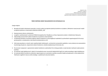 Załącznik nr 2 do Zarządzenie nr 48/R/10 Rektora Uniwersytetu Gdańskiego w sprawie zasad funkcjonowania Wewnętrznego Systemu Zapewniania Jakości Kształcenia na Uniwersytecie Gdańskim TREŚCI WSPÓLNE ANKIET REALIZOWANYCH NA WYDZIAŁACH UG: Uwagi wstępne: 1. Narzędzia do badań ankietowych powstały w ramach zadania zarządzanie jakością kształcenia w projekcie „Wdrożenie nowoczesnych modeli zarządzania jakością w Uniwersytecie Gdańskim (MODEL_UG)” 2. a. b. c. Zaproponowane obszary ankietowania: są zgodne z podstawowymi ustaleniami ENQA (Europejskiej Sieci Współpracy na Rzecz Zapewniania Jakości w Szkolnictwie Wyższym); odpowiadają wyznacznikom jakości kształcenia na poziomie uniwersyteckim; umożliwiają określenie na poziomie ogólnym jakości kształcenia na poszczególnych wydziałach (w jednostkach organizacyjnych) UG oraz jej porównywanie i wnioskowanie o kierunkach jej doskonalenia w UG. 3. Informacje pozyskane w ramach części wspólnej badań ankietowych, są elementem sprawozdań wydziałów z oceny własnej oraz sprawozdania Uczelnianego Zespołu ds. Zapewniania Jakości Kształcenia z działań projakościowych dla Senatu UG. 4. W procesach związanych z zapewnianiem jakości kształcenia w jednostkach UG, istnieją ponadto co najmniej dwie możliwości wykorzystania wyników: a. do ewaluacji zajęć dydaktycznych i jakości ich prowadzenia przez nauczycieli akademickich bądź inne osoby prowadzące zajęcia dydaktyczne; b. do ewaluacji jakości kształcenia w jednostce organizacyjnej, po zsumowaniu wyników wszystkich badań prowadzonych w roku akademickim. Możliwości uogólnień stwarza analiza każdego z wydzielonych obszarów badania. 1 Badanie opinii studentów 1.1 1.2 1.3 1.4 1.5 1.6 1.7 1. Ocena zajęć 5 4 3 2 1 Czy zajęcia w ramach przedmiotu zostały zrealizowane zgodnie z założeniami przedstawionymi przez prowadzącego w sylabusie lub podczas zajęć? tak raczej tak trudno ocenić raczej nie nie Czy zajęcia w ramach przedmiotu poszerzyły Pana/Pani wiedzę z danej dziedziny tak tak trudno ocenić trudno ocenić trudno ocenić trudno ocenić raczej nie raczej nie raczej nie raczej nie nie Czy zajęcia wzbudziły Pana/Pani refleksję naukową i przyczyniły się do rozwoju intelektualnego? Czy zajęcia pozwoliły Panu/Pani nabyć lub rozwinąć umiejętności związane z przekazaną wiedzą? Czy uczestnictwo w zajęciach pozwoliło Panu/Pani nabyć lub rozwinąć kompetencje społeczne (np. praca w grupie, zrozumienie potrzeby uczenia się przez całe życie, świadomość i umiejętność rozstrzygania dylematów zawodowych itp.)? Czy sposoby zaliczenia przedmiotu (m.in. kolokwia, prace zaliczeniowe) pozwalały przedstawić wiedzę, umiejętności i kompetencje nabyte podczas zajęć? Czy treści zrealizowane w czasie zajęć powtarzały treści zrealizowane na wcześniejszych zajęciach? raczej tak raczej tak raczej tak raczej tak raczej tak raczej nie trudno ocenić trudno ocenić raczej nie raczej tak nie raczej tak raczej tak trudno ocenić trudno ocenić raczej nie raczej nie nie raczej tak raczej tak raczej tak trudno ocenić trudno ocenić trudno ocenić raczej nie raczej nie raczej nie nie tak tak tak nie nie nie nie tak 2. Ocena działań prowadzącego zajęcia 2.1 2.2 2.3 2.4 2.5 Czy prowadzący przedstawił treści związane z przedmiotem w sposób zrozumiały? tak Czy prowadzący reagował na prośby studentów i dostosowywał sposób omawiania treści programowych do potrzeb studentów? [Proszę odpowiedzieć na to pytanie, jeśli takie prośby były zgłaszane] Czy prowadzący rozpoczynał i kończył zajęcia punktualnie? tak Czy prowadzący efektywnie wykorzystywał czas przeznaczony na zajęcia? tak Czy prowadzący był dostępny podczas wyznaczonych godzin konsultacji? tak 2 tak nie nie nie Czy prowadzący był dostępny poprzez inne ustalone wcześniej ze studentami drogi tak raczej tak trudno ocenić raczej nie nie tak raczej tak raczej tak trudno ocenić trudno ocenić raczej nie raczej nie nie raczej tak raczej tak trudno ocenić trudno ocenić raczej nie raczej nie nie tak raczej tak trudno ocenić raczej nie nie Proszę ocenić, w jakim stopniu zajęcia spełniły Pana/Pani oczekiwania? tak raczej tak trudno ocenić raczej nie nie W ilu zajęciach brał/brała Pan/Pani udział? 100% 2.6 komunikacji? [Proszę odpowiedzieć na to pytanie, jeśli prowadzący zapowiedział możliwość 2.7 2.8 3.1 3.2 3.3 kontaktowania się z nim poza konsultacjami] Czy prowadzący odnosił się życzliwie do studentów i prezentował wysoki poziom kultury osobistej? Czy prowadzący prezentował szeroką wiedzę (tematyka wykraczająca poza literaturę obowiązkową, odnoszenie omawianych zagadnień do innych obszarów wiedzy)? 3. Ocena organizacji zajęć Czy wszystkie zaplanowane zajęcia odbyły się według planu lub zostały odrobione w innym ustalonym terminie? Czy informacje o zmianach terminów zajęć były przekazywane odpowiednio wcześnie? [Proszę odpowiedzieć na to pytanie, jeśli któreś z zajęć nie odbyły się w zaplanowanym terminie] Czy literatura i/lub materiały niezbędne do zajęć były dostępne? tak tak tak nie nie 4. Ocena ogólna 4.1 4.2 4.3 Pytanie otwarte: Jeśli ma Pan/Pani dodatkowe spostrzeżenia, uwagi lub sugestie, prosimy je wpisać: [menu rozwijane, wybór pierwszej opcji otwiera okno do wpisania odpowiedzi] 3 99% 66% Mam uwagi 65% 33% 32% 0% 1% Nie mam uwag Badanie opinii doktorantów 1. Ocena zajęć Czy zajęcia były prowadzone na wysokim merytorycznie poziomie? 5 tak Czy zajęcia mogą przyczynić się do Pana/Pani rozwoju naukowego/zawodowego? tak Czy zajęcia przybliżyły Pana/Panią do sformułowania lub rozszerzenia tez pracy doktorskiej? [Proszę odpowiedzieć na to pytanie, jeśli zajęcia były ściśle związane z tematem Pana/Pani pracy] Czy zajęcia pozwoliły lepiej przygotować się do prowadzenia zajęć dydaktycznych ze studentami? [Proszę odpowiedzieć na to pyta
