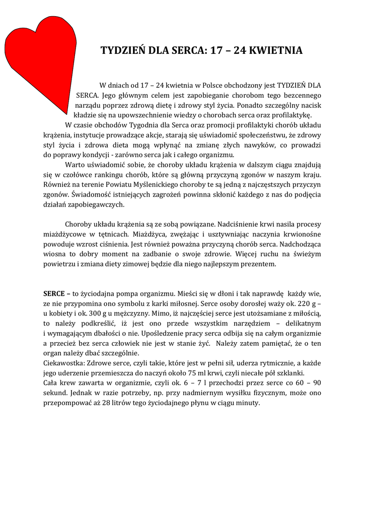 TYDZIEŃ DLA SERCA: 17 – 24 KWIETNIA W dniach od 17 – 24 kwietnia w Polsce obchodzony jest TYDZIEŃ DLA SERCA. Jego głównym celem jest zapobieganie chorobom tego bezcennego narządu poprzez zdrową dietę i zdrowy styl życia. Ponadto szczególny nacisk kładzie się na upowszechnienie wiedzy o chorobach serca oraz profilaktykę. W czasie obchodów Tygodnia dla Serca oraz promocji profilaktyki chorób układu krążenia, instytucje prowadzące akcje, starają się uświadomić społeczeństwu, że zdrowy styl życia i zdrowa dieta mogą wpłynąć na zmianę złych nawyków, co prowadzi do poprawy kondycji - zarówno serca jak i całego organizmu. Warto uświadomić sobie, że choroby układu krążenia w dalszym ciągu znajdują się w czołówce rankingu chorób, które są główną przyczyną zgonów w naszym kraju. Również na terenie Powiatu Myślenickiego choroby te są jedną z najczęstszych przyczyn zgonów. Świadomość istniejących zagrożeń powinna skłonić każdego z nas do podjęcia działań zapobiegawczych. Choroby układu krążenia są ze sobą powiązane. Nadciśnienie krwi nasila procesy miażdżycowe w tętnicach. Miażdżyca, zwężając i usztywniając naczynia krwionośne powoduje wzrost ciśnienia. Jest również poważna przyczyną chorób serca. Nadchodząca wiosna to dobry moment na zadbanie o swoje zdrowie. Więcej ruchu na świeżym powietrzu i zmiana diety zimowej będzie dla niego najlepszym prezentem. SERCE – to życiodajna pompa organizmu. Mieści się w dłoni i tak naprawdę każdy wie, ze nie przypomina ono symbolu z karki miłosnej. Serce osoby dorosłej waży ok. 220 g – u kobiety i ok. 300 g u mężczyzny. Mimo, iż najczęściej serce jest utożsamiane z miłością, to należy podkreślić, iż jest ono przede wszystkim narzędziem – delikatnym i wymagającym dbałości o nie. Upośledzenie pracy serca odbija się na całym organizmie a przecież bez serca człowiek nie jest w stanie żyć. Należy zatem pamiętać, że o ten organ należy dbać szczególnie. Ciekawostka: Zdrowe serce, czyli takie, które jest w pełni sił, uderza rytmicznie, a każde jego uderzenie przemieszcza do naczyń około 75 ml krwi, czyli niecałe pół szklanki. Cała krew zawarta w organizmie, czyli ok. 6 – 7 l przechodzi przez serce co 60 – 90 sekund. Jednak w razie potrzeby, np. przy nadmiernym wysiłku fizycznym, może ono przepompować aż 28 litrów tego życiodajnego płynu w ciągu minuty. Zadbaj o swoje serce! - Wraz z rozpoczynającą się wiosną koniecznie zrób „przegląd” swojego organizmu: pomiar ciśnienia dwa razy w miesiącu, lipidogram raz w roku (badanie krwi, które sprawdza poziom cholesterolu w organizmie), elektrokardiogram (EKG – badanie, które elektrycznie rejestruje pracę serca) – raz na dwa lata – ważne badanie, które pozwala wykryć m.in. zaburzenia rytmu serca i chorobę niedokrwienną, echokardiografia (= echo serca) – badanie, które zleca lekarz, gdy podejrzewa chorobę serca; dzięki niemu można wykryć wszystkie wady serca oraz chorobę wieńcową, holter – tj. całodobowe, nieinwazyjne monitorowanie ciśnienia i tętna; badanie to zleca lekarz gdy istnieje podejrzenie zaburzeń rytmu serca; koronografia – badanie wykonywane u osób zagrożonych zawałem; pozwala ono ocenić stan naczyń wieńcowych. „Sygnalizacja alarmowa” – Serce, gdy tylko zaczyna mieć problemy, wysyła sygnały, których nie należy lekceważyć ani ignorować: nagłe ataki duszności i ugniatający ból – to mogą być objawy niewydolności krążenia, ból w okolicy serca lub za mostkiem, pojawiający się zwykle po wysiłku fizycznym lub podczas stresu może sygnalizować chorobę wieńcową, nudności, wymioty, ból w nadbrzuszu, mdłości – to częste objawy zawału serca (zwłaszcza u kobiet), kłujący ból w klatce piersiowej – często towarzyszy zapaleniu osierdzia, uczucie „łomotania” – może sygnalizować arytmię. !!! WAŻNE W PROFILAKTYCE CHORÓB SERCA: Dieta i antyoksydanty Rzucenie palenia Ograniczenie alkoholu Ruch Kontrola ciśnienia krwi Kontrola poziomu cholesterolu Kontrola poziomu cukru Kwas acetylosalicylowy (hamuje agregację płytek krwi, zmniejszając w ten sposób skłonność do zakrzepów) Nauka radzenia sobie ze stresem – czyli „oswoić stres”