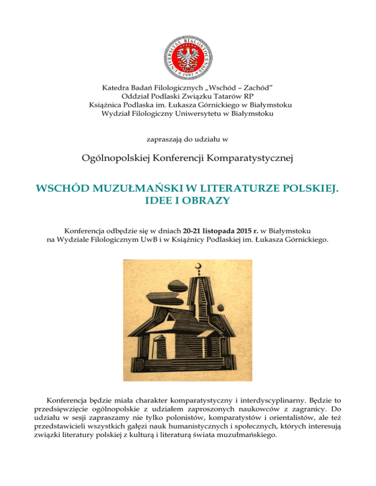 Katedra Badań Filologicznych „Wschód – Zachód” Oddział Podlaski Związku Tatarów RP Książnica Podlaska im. Łukasza Górnickiego w Białymstoku Wydział Filologiczny Uniwersytetu w Białymstoku zapraszają do udziału w Ogólnopolskiej Konferencji Komparatystycznej WSCHÓD MUZUŁMAŃSKI W LITERATURZE POLSKIEJ. IDEE I OBRAZY Konferencja odbędzie się w dniach 20-21 listopada 2015 r. w Białymstoku na Wydziale Filologicznym UwB i w Książnicy Podlaskiej im. Łukasza Górnickiego. Konferencja będzie miała charakter komparatystyczny i interdyscyplinarny. Będzie to przedsięwzięcie ogólnopolskie z udziałem zaproszonych naukowców z zagranicy. Do udziału w sesji zapraszamy nie tylko polonistów, komparatystów i orientalistów, ale też przedstawicieli wszystkich gałęzi nauk humanistycznych i społecznych, których interesują związki literatury polskiej z kulturą i literaturą świata muzułmańskiego. Podczas naszego spotkania chcielibyśmy zastanowić się nad następującymi zagadnieniami: • • • • • • • • • • Inspiracje orientalne w literaturze polskiej od średniowieczna do współczesności. Podróże polskich pisarzy do krajów muzułmańskich: ich świadectwa, diagnozy, fascynacje. Literackie obrazy Azji Centralnej, Krymu, Powołża – Idel-Uralu, Bliskiego Wschodu i Afryki Północnej (w literaturze polskiej). Orientalne gatunki literackie (rubai/rubai’jjat, kasyda, gazela, makama, etc.) i ich transformacja na gruncie polskim. Sarmatyzm, dialog oświecenia z Orientem, „islamskie aspekty” romantyzmu i Młodej Polski. Literatura polska wobec literatur narodów muzułmańskich (tatarskiej, krymskotatarskiej, arabskiej, tureckiej, perskiej, etc.) Klasycy literatur orientalnych w przekładach poetów polskich (Rumi – Miciński, Çoban-zade – Chazbijewicz i inni). Piśmiennictwo Tatarów Wielkiego Księstwa Litewskiego oraz współczesna literatura polskotatarska (ujęcia historyczno- i teoretycznoliterackie, tekstologiczne, kulturoznawcze, socjologiczne i inne). Folklor Tatarów polskich (niekanoniczne modlitwy, zamówienia, zaklęcia, baśnie i legendy). Publicystyka i ruch wydawniczy polskich Tatarów. Gorąco zapraszamy Państwa do wygłoszenia referatów i do dyskusji! * * * Organizatorzy zapewniają nocleg i wyżywienie w dniach 19/20, 20/21 i 21/22 listopada 2015 roku (koszt pokryty będzie z opłaty wpisowej). Uczestnicy powinni opłacić wpisowe w wysokości 450 zł (dla osób z Białegostoku – 350 zł). [o numerze konta poinformujemy w osobnym liście]. Wszyscy referenci otrzymają wydany w 2015 roku przez Katedrę Badań Filologicznych „Wschód – Zachód” i Związek Tatarów RP tom zawierający referaty z Międzynarodowej Konferencji Naukowej „Estetyczne aspekty literatury polskich, białoruskich i litewskich Tatarów (od XVI do XXI w.)” (Białystok-Sokółka, 2014). Materiały z tegorocznej sesji zostaną wydane w formie recenzowanej punktowanej monografii zbiorowej, która ukaże się w Naukowej Serii Wydawniczej „Colloquia Orientalia Bialostocensia” w 2016 roku. Na zgłoszenia czekamy do 10 czerwca 2015 roku. Prosimy je przesłać na adres elektroniczny: [email protected] Dr Grzegorz Czerwiński Przewodniczący Komitetu Organizacyjnego Dr Artur Konopacki Z-ca Przewodniczącego Komitetu Organizacyjnego Mgr Grzegorz Kowalski Sekretarz Komitetu Organizacyjnego Komitet Organizacyjny: - Dr Grzegorz Czerwiński (Katedra Badań Filologicznych „Wschód – Zachód” UwB) - Dr Artur Konopacki (Wydział Pedagogiki i Psychologii, Uniwersytet w Białymstoku) - Prof. Jarosław Ławski (Kierownik Katedry Badań Filologicznych „Wschód – Zachód” UwB) - Prof. Leonarda Dacewicz (Kierownik Katedry Językoznawstwa Wschodniosłowiańskiego UwB) - Prof. Dariusz Kulesza (Kierownik Zakładu Literatury Międzywojennej i Współczesnej UwB) - Prof. Anna Kieżuń (Zakład Literatury Międzywojennej i Współczesnej UwB) - Dr Łukasz Zabielski (Książnica Podlaska w Białymstoku) - Mgr Grzegorz Kowalski (Książnica Podlaska w Białymstoku) Komitet Naukowy: - Prof. Adam Bezwiński (Uniwersytet Kazimierza Wielkiego w Bydgoszczy) – Przewodniczący Komitetu Naukowego Siedziba Komitetu Organizacyjnego: Katedra Badań Filologicznych „Wschód – Zachód” Wydział Filologiczny Uniwersytetu w Białymstoku Plac Uniwersytecki 1, pokój 75 15-420 Białystok Tel. 725 778 089 E-mail: [email protected] Naukowa Seria Wydawnicza „COLLOQUIA ORIENTALIA BIALOSTOCENSIA” Wschód, Pogranicza, Kresy, obrzeża i krańce, peryferie i prowincja to miejsca o szczególnej mocy kulturotwórczej. Równocześnie jest to przestrzeń oddziaływania odmiennych centrów cywilizacyjnych, religijnych, językowych, symbolicznych i literackich. Białystok i Podlasie, dawne ziemie Wielkiego Księstwa Litewskiego i całej jagiellońskiej Rzeczypospolitej to miejsce i dynamiczna przestrzeń pograniczna w głębokim znaczeniu: stykają się tutaj przecinające Europę na pół płyty kontynentalne cywilizacji łacińskiego Zachodu i bizantyjskiego Wschodu. Ścierają się tu, ale nie niszcząc wzajemnie, Orient ze światem Zachodu, Bałtowie ze Słowianami, prawosławni z katolikami, Białorusini z Polakami, Ukraińcy i Rosjanie. To źródło niemal wygasłej, niegdyś żywej tradycji żydowskiej, wyniszczonej przez Szoah, powoli odbudowującej się w nowym otoczeniu kulturowym i etnicznym. Tu znajdują się wielkie centra religijne i kulturalne wschodniego i zachodniego chrystianizmu: Ostra Brama, Żyrowice, Święta Góra Grabarka, Poczajów, Troki, Ławra Supraska, Grodno, Żytomierz, Bar, nade wszystko Ławra Kijowsko-Peczerska; tu leżą ośrodki polskiego islamu: Kruszyniany i Bohoniki, centra religijne Karaimów, źródła chasydyzmu. Białostockie Kolokwia Wschodnie to idea służąca międzykulturowej i międzyreligijnej wymianie myśli, utrwalaniu źródeł pamięci i tożsamości kulturowo-historycznej, badaniu świadectw literackich, artyst