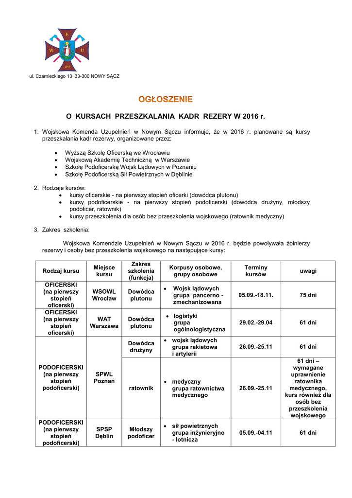 ul. Czarnieckiego 13 33-300 NOWY SĄCZ O KURSACH PRZESZKALANIA KADR REZERY W 2016 r. 1. Wojskowa Komenda Uzupełnień w Nowym Sączu informuje, że w 2016 r. planowane są kursy przeszkalania kadr rezerwy, organizowane przez: Wyższą Szkołę Oficerską we Wrocławiu Wojskową Akademię Techniczną w Warszawie Szkołę Podoficerską Wojsk Lądowych w Poznaniu Szkołę Podoficerską Sił Powietrznych w Dęblinie 2. Rodzaje kursów: kursy oficerskie - na pierwszy stopień oficerki (dowódca plutonu) kursy podoficerskie - na pierwszy stopień podoficerski (dowódca drużyny, młodszy podoficer, ratownik) kursy przeszkolenia dla osób bez przeszkolenia wojskowego (ratownik medyczny) 3. Zakres szkolenia: Wojskowa Komendzie Uzupełnień w Nowym Sączu w 2016 r. będzie powoływała żołnierzy rezerwy i osoby bez przeszkolenia wojskowego na następujące kursy: Rodzaj kursu OFICERSKI (na pierwszy stopień oficerski) OFICERSKI (na pierwszy stopień oficerski) Miejsce kursu Zakres szkolenia (funkcja) WSOWL Wrocław Dowódca plutonu WAT Warszawa Dowódca plutonu Dowódca drużyny PODOFICERSKI (na pierwszy stopień podoficerski) SPWL Poznań PODOFICERSKI (na pierwszy stopień podoficerski) SPSP Dęblin Korpusy osobowe, grupy osobowe Wojsk lądowych grupa pancerno zmechanizowana logistyki grupa ogólnologistyczna wojsk lądowych grupa rakietowa i artylerii Terminy kursów uwagi 05.09.-18.11. 75 dni 29.02.-29.04 61 dni 26.09.-25.11 61 dni ratownik medyczny grupa ratownictwa medycznego 26.09.-25.11 61 dni – wymagane uprawnienie ratownika medycznego, kurs również dla osób bez przeszkolenia wojskowego Młodszy podoficer sił powietrznych grupa inżynieryjno - lotnicza 05.09.-04.11 61 dni 4. Warunki dla kandydatów do skierowania na kursy: Na kursy mogą być skierowani osoby spełniający następujące warunki: Na kursy oficerskie: o o o o o odbyli dotychczas co najmniej jedną z form czynnej służby wojskowej (zawodową, kontraktową, zasadniczą, nadterminową, przygotowawczą służbę wojskową bądź przeszkolenie wojskowe studentów lub absolwentów szkół wyższych); posiadają wykształcenie wyższe istnieje zbieżność posiadanych kwalifikacji, wykształcenia, doświadczenia zawodowego lub odbytego dotychczas przeszkolenia wojskowego, z zakresem szkolenia na kursie oficerskim są niekarani są zdolni ze względu na stan zdrowia do czynnej służby wojskowej – kat.”A”. Na kursy podoficerskie: o o o o o odbyli dotychczas co najmniej jedną z form czynnej służby wojskowej (zawodową, kontraktową, zasadniczą, nadterminową, przygotowawczą służbę wojskową bądź przeszkolenie wojskowe studentów, ćwiczenia wojskowe) posiadają wykształcenie na poziomie szkoły ponadgimnazjalnej istnieje zbieżność posiadanych kwalifikacji, wykształcenia, doświadczenia zawodowego lub odbytego dotychczas przeszkolenia wojskowego, z zakresem szkolenia na kursie podoficerskim są nie karani są zdolni ze względu na stan zdrowia do czynnej służby wojskowej – kat.”A”. Zgłoszenia przyjmowane są w Wojskowej Komendzie Uzupełnień w Nowym Sączu ul. Czarnieckiego 13, p.203, w godzinach pracy Komendy tj. w poniedziałki w godz. 07.30.-17.00, od wtorku do piątku w godz. 7.30.-15.30; tel. 18-443-77-55 w.729 lub 261138729 Zgłoszenia można również dokonać w formie wniosku o powołanie do odbycia ćwiczeń wojskowych – który można pobrać ze strony internetowej www.nowysacz.wku.wp.mil.pl lub wypełnić w siedzibie WKU w Nowym Sączu. Wniosek można dostarczyć osobiście, przesłać pocztą na adres WKU lub drogą elektroniczną na skrzynkę pocztową: [email protected] bądź poprzez system e-PUAP Wniosek zachowuje ważność przez okres 6 miesięcy od dnia jego złożenia w WKU w Nowym Sączu.