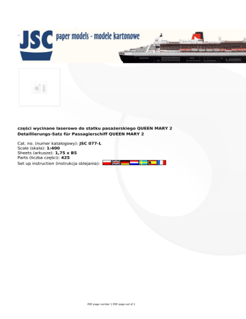 części wycinane laserowo do statku pasażerskiego QUEEN MARY 2 Detaillierungs-Satz für Passagierschiff QUEEN MARY 2 Cat. no. (numer katalogowy): JSC 077-L Scale (skala): 1:400 Sheets (arkusze): 1,75 x B5 Parts (liczba części): 425 Set up instruction (instrukcja sklejania): PDF page number 1 PDF page out of 1