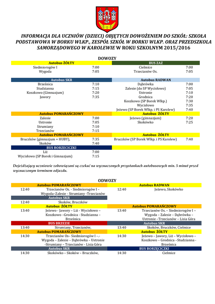 INFORMACJA DLA UCZNIÓW (DZIECI) OBJĘTYCH DOWOŻENIEM DO SZKÓŁ: SZKOŁA PODSTAWOWA W BORKU WLKP., ZESPÓŁ SZKÓŁ W BORKU WLKP. ORAZ PRZEDSZKOLA SAMORZĄDOWEGO W KAROLEWIE W ROKU SZKOLNYM 2015/2016 Autobus ŻÓŁTY Siedmiorogów I Wygoda Autobus SKR Brześnica Studzianna Koszkowo (Gimnazjum) Jawory Autobus POMARAŃCZOWY Zalesie Ustronie Strumiany Trzecianów Autobus POMARAŃCZOWY Bruczków (gimnazjum + HUBY), Skoków BUS BORZECICZKI Liż Wycisłowo (SP Borek i Gimnazjum) DOWOZY BUS ZAZ Cielmice Trzecianów Os. 7:00 7:05 Autobus RADWAN Dąbrówka Zalesie (do SP Wycisłowo) Ustronie Grodnica Koszkowo (SP Borek Wlkp.) Wycisłowo Jeżewo (SP Borek Wlkp. i PS Karolew) Autobus ŻÓŁTY Jeżewo (gimnazjum) Skokówko 7:10 7:15 7:20 7:35 7:00 7:05 7:10 7:15 7:35 7:40 Autobus ŻÓŁTY Bruczków (SP Borek Wlkp. i PS Karolew) 7:00 7:05 7:00 7:05 7:10 7:20 7:30 7:35 7:40 7:20 7:25 7:40 7:00 7:15 Dojeżdżający uczniowie zobowiązani są czekać na wyznaczonych przystankach autobusowych min. 5 minut przed wyznaczonym terminem odjazdu. ODWOZY 12:40 12:40 13:40 13:40 14:30 14:30 Autobus POMARAŃCZOWY Trzecianów Os. - Siedmiorogów I – Wygoda–Zalesie - Strumiany -Trzecianów Autobus SKR Skoków, Bruczków Autobus ŻÓŁTY Jeżewo - Jawory – Liż - Wycisłowo – Koszkowo –Grodnica - Studzianna – Brześnica BUS BRZEZIE Strumiany, Trzecianów, Autobus POMARAŃCZOWY Trzecianów Os– Siedmiorogów I –.Wygoda – Zalesie – Dąbrówka – Ustronie -Strumiany – Trzecianów - Lisia Góra Autobus SKR Skokówko – Skoków – Bruczków, 12:40 13:40 13:40 14:30 14:30 Autobus RADWAN Jeżewo, Skokówko Autobus POMARAŃCZOWY Trzecianów Os. – Siedmiorogów I – Wygoda – Zalesie – Dąbrówka – Ustronie –Trzecianów – Lisia Góra Autobus SKR Skoków, Bruczków, Cielmice Autobus ŻÓŁTY Jeżewo – Jawory, Liż – Wycisłowo – Koszkowo – Grodnica –Studzianna Brześnica BUS BORZĘCICZKI Cielmice INFORMACJA DLA UCZNIÓW ZESPOŁU SZKÓŁ W ZIMNOWODZIE OBJĘTYCH DOWOŻENIEM UCZNIÓW DO SZKÓŁ W ROKU SZKOLNYM 2015/16 DOWOZY Autobus pomarańczowy AUTOBUS żółty Siedmiorogów II 8:00 Cielmice 8:00 Celestynów 8:05 Góreczki 8:10 Wyrębin 8:15 Maksymilianów 8:20 Autobus RADWAN BUS BORZECICZKI Leonów 8:05 Bolesławów 8:15 Walerianów 8:05 Dojeżdżający uczniowie zobowiązani są czekać na wyznaczonych przystankach autobusowych min. 5 minut przed wyznaczonym terminem odjazdu. ODWOZY 13:15 Autobus RADWAN Góreczki, Wyrębin, Walerianów, 13:50 Maksymilianów, Autobus RADWAN Celestynów – Siedmiorogów II – Cielmice Autobus SKR 13:15 Bolesławów, Leonów, BUS BORZECICZKI 14:55 Maksymilianów Autobus RADWAN 14:55 Góreczki – Wyrębin –Walerianów – Leonów - Bolesławów Autobus SKR 14:55 Celestynów – Siedmiorogów II Cielmice INFORMACJA DLA UCZNIÓW SZKOŁY PODSTAWOWEJ W WYCISŁOWIE OBJĘTYCH DOWOŻENIEM DO SZKÓŁ W ROKU SZKOLNYM 2015/16 DOWOZY Autobus SKR Brześnica Studzianna BUS BORZECICZKI Liż Jawory 7:10 7:15 Autobus RADWAN Zalesie Grodnica Koszkowo 7:05 7:20 7:30 7:00 7:10 Dojeżdżający uczniowie zobowiązani są czekać na wyznaczonych przystankach autobusowych min. 5 minut przed wyznaczonym terminem odjazdu. ODWOZY 12:40 13:40 14:30 Autobus ŻÓŁTY Jawory, Liż Studzianna –Brześnica Koszkowo –Grodnica Autobus ŻÓŁTY Studzianna – Brześnica – Koszkowo – Grodnica – ew. Zalesie Autobus ŻÓŁTY Jeżewo – Jawory, Liż – Wycisłowo – Koszkowo – Grodnica –Studzianna – Brześnica ew. Zalesie INFORMACJA DLA UCZNIÓW SZKOŁY PODSTAWOWEJ W ZALESIU OBJĘTYCH DOWOŻENIEM DO SZKÓŁ W ROKU SZKOLNYM 2015/16 DOWOZY Autobus Pomarańczowy Dąbrówka Autobus RADWAN 7:00 Ustronie 7:10 Zalesie * 7:15 *dotyczy uczniów z m. Zalesie dojeżdżających do SP w Wycisłowie- miejsce wsiadania przy SP Zalesie Dojeżdżający uczniowie zobowiązani są czekać na wyznaczonych przystankach autobusowych min. 5 minut przed wyznaczonym terminem odjazdu. ODWOZY Autobus Pomarańczowy Ok. 14:05 Ustronie, Ok. 15:00 Dąbrówka