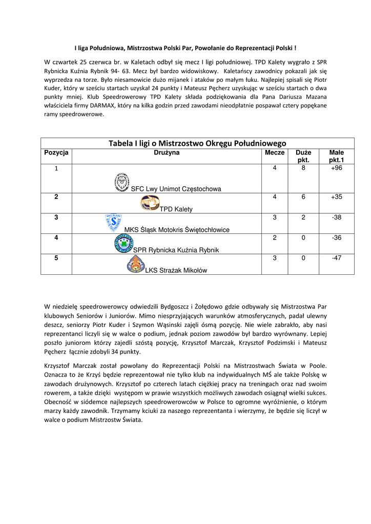 I liga Południowa, Mistrzostwa Polski Par, Par, Powołanie do Reprezentacji Polski ! W czwartek 25 czerwca br. w Kaletach odbył od się mecz I ligi południowej.. TPD Kalety wygrało z SPR Rybnicka Kuźnia Rybnik 94- 63. Mecz był bardzo widowiskowy. Kaletańscy zawodnicy pokazali jak się wyprzedza na torze. Było niesamowicie dużo mijanek i ataków po małym łuku. Najlepiej spisali się Piotr Kuder, który w sześciu startach uzyskał 24 punkty i Mateusz Pęcherz uzyskując w sześciu startach o dwa punkty mniej. Klub Speedrowerowy TPD Kalety składa podziękowania podziękowania dla Pana Dariusza Mazana właściciela firmy DARMAX, który na kilka godzin przed zawodami nieodpłatnie pospawał cztery popękane ramy speedrowerowe. Tabela I ligi o Mistrzostwo Okręgu Południowego Pozycja Drużyna Mecze 4 Duże pkt. 8 Małe pkt.1 +96 1 TABELA ROZGRYWEK OKRĘGOWYCH OKR 4 6 +35 3 2 -38 2 0 -36 3 0 -47 SFC Lwy Unimot Częstochowa Cz 2 TPD Kalety 3 MKS Śląsk Motokris Świętochłowice 4 SPR Rybnicka Kuźnia Ku Rybnik 5 LKS Strażak Mikołów W niedzielę speedrowerowcy odwiedzili Bydgoszcz i Żołędowo gdzie odbywały dbywały się Mistrzostwa Par klubowych Seniorów i Juniorów. Mimo niesprzyjających warunków atmosferycznych, atmosferycznych padał ulewny deszcz, seniorzy Piotr otr Kuder i Szymon Wąsinski zajęli ósmą pozycję. Nie ie wiele zabrakło, aby nasi reprezentanci liczyli się w walce o podium, jednak poziom zawodów był bardzo o wyrównany. wyrównany Lepiej poszło juniorom którzy zajedli szóstą pozycję, pozycję Krzysztof Marczak,, Krzysztof Podzimski i Mateusz Pęcherz łącznie zdobyli 34 punkty. kty. Krzysztof Marczak został powołany do Reprezentacji Polski na Mistrzostwach Świata w Poole. Oznacza to że Krzyś będzie reprezentował nie tylko klub na indywidualnych MŚ ale także Polskę w zawodach drużynowych. Krzysztof ztof po czterech latach ciężkiej pracy na treningach trening oraz nad swoim rowerem, a także dzięki występom om w prawie wszystkich możliwych zawodach osiągnął wielki sukces. Obecność w siódemce najlepszych speedrowerowców w Polsce to ogromne wyróżnienie, o którym marzy każdy zawodnik.. Trzymamy kciuki za naszego reprezentanta i wierzymy, że będzie się liczył w walce o podium Mistrzostw Świata.