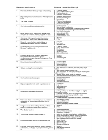 Literatura współczesna 1. 2. 3. 4. 5. 6. Pobrane z www.Bez-Nauki.pl [ [ [ [ Najbardziej mrocznym okresem w Polskiej kulturze [ [ był/a: [ [ 'Ten dzień' to utwór: [ [ [ Cechy twórczości socrealistycznej to: [ [ [ [ [ Okres odwilży, czyli złagodzenia polityki partii, [ związany ze śmiercią Stalina przypada na lata: [ [ Orientację Hybrydy cechowała biograficzna [ niezależność, wybór życia poety-outsidera. Przedstawicielami literatury wojny i okupacji są: 7. Kierunek psychologiczny, zakładający, że środowisko kształtuje psychikę ludzką to: 8. Spośród podanych wybierz przedstawicieli literatury współczesnej: 9. Epatowanie brzydotą, śmiercią, kalectwem, korzystanie z kolokwializmów, języka odrażającego, eksponującego fizjologiczną sferę natury ludzkiej to: 10. Kierunki współczesnej filozofii to: 11. Główne poglądy fenomentologii to: 12. Cechy sztyki współczesnej to: 13. Najważniejsze kierunki sztuki współczesnej to: 14. Uniwersalne przesłania 'Dżumy' to: 15. W świecie obozu koncentracyjnego na podstawie Opowiadania Tadeusza Borowskiego można zauważyć: 16. Tango ukazuje obraz rodziny Stomila, w której nastąpił całkowity upadek świata wartości. 17. 'Pan Cogito' to utwór: 18. Tezy Szkoły Iwowsko-warszawskiej to: 19. Przedstawicielami filozofii chrześcijańskiej był: 20. Kierunek w literaturze włoskiej, będący odmianą naturalizmu, cechujący się skrajnym mimetyzmem to: [ [ [ [ [ [ [ [ [ [ [ [ ] Czesław Miłosz ] Krzysztof Kamil Baczyński ] Wacław Bojarski ] Wisława Szymborska ] literatura emigracyjna ] literacki obraz łagrów ] socrealizm ] Wisławy Szymborskiej ] Tadeusza Różewicza ] Józefa Czapskiego ] tendencyjność ] używanie starego języka ] ukazywanie życzenieowej a nie realnej wizji świata ] podporządkowanie ideologii komunistycznej ] charakter refleksyjny ] czterydzieste XXw ] pięćdziesiate XXw ] sześćdziesiąte XXw ] Prawda ] Fałsz ] weryzm ] everyman ] behawioryzm ] Tadeusz Peiper ] Miron Białoszewski ] Jan Lechoń ] Ernest Bryll ] Bruno Jasieński ] Edward Stachura ] weryzm ] turpizm ] neoklasycyzm [ ] hermeneutyka [ ] neoromantyzm [ ] egzystencjalizm [ ] fenomentologia [ ] teza mówiąca, iż człowiek jest sam pod pustym niebem [ ] pojmowanie świata realistycznie [ ] teza, mówiąca, że należy być świętym bez Boga-to trudny heroizm [ ] dojście przez teorię sztuki do ontologii [ ] rozwinięcie filozofoicznej teorii sztuki i estetyki [ ] eksperymentowanie [ ] abstrakcyjność [ ] oryginalność [ ] jednokierunkowość [ ] surrealizm [ ] pop-art [ ] postmodernizm [ ] dekadentyzm [ ] sztuka ziemi [ ] należy walczyć ze złem bez względu na to jaką przyjmie ono postać [ ] człowiek powinien dążyć do samodoskonalenia [ ] nie wolno wyrażać zgody na żadne racje uzasadniające śmierć [ ] zawsze powinno się stawać po stronie silniejszego [ ] motyw kata i ofiary [ ] masowość śmierci [ ] odwrócone toposy [ ] granicę pomiędzy dobrem a złem [ ] Prawda [ ] Fałsz [ [ [ [ [ [ [ [ [ [ [ [ [ [ ] Stanisława Mrożka ] Mirona Białoszewskiego ] Zbigniewa Herberta ] walka ze złem jest obowiązkiem każdej istoty ] istoty świadome są zawsze istotami cielesnymi ] istnieją tylko hipotezy pojęć, abstrakcje ] teza mówiąca, że istnieją tylko rzeczy ] Karol Wojtyła ] Immanuel Kant ] Gabriel Marcel ] Emmanuel Mounier ] weryzm ] pokolenie Kolumbów ] socrealizm Poprawne odpowiedzi 1. 2. socrealizm 3. Krzysztof Kamil Baczyński, Wacław Bojarski Wisławy Szymborskiej 4. 5. 7. pięćdziesiate XXw behawioryzm 6. 8. 9. turpizm 10. 11. pojmowanie świata realistycznie, dojście przez teorię sztuki do ontologii, rozwinięcie filozofoicznej teorii sztuki i estetyki pop-art, postmodernizm, sztuka ziemi 12. motyw kata i ofiary, masowość śmierci, odwrócone toposy Zbigniewa Herberta 16. tendencyjność, ukazywanie życzenieowej a nie realnej wizji świata, podporządkowanie ideologii komunistycznej Prawda Miron Białoszewski, Ernest Bryll, Edward Stachura hermeneutyka, neoromantyzm, egzystencjalizm, fenomentologia eksperymentowanie, abstrakcyjność, oryginalność należy walczyć ze złem bez względu na to jaką przyjmie ono postać, człowiek powinien dążyć do samodoskonalenia, nie wolno wyrażać zgody na żadne racje uzasadniające śmierć Prawda Karol Wojtyła, Gabriel Marcel, Emmanuel Mounier 20. 13. 15. 17. 19. 14. 18. istoty świadome są zawsze istotami cielesnymi, istnieją tylko hipotezy pojęć, abstrakcje, teza mówiąca, że istnieją tylko rzeczy weryzm