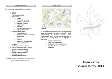 Ekwipunek na obóz Mapa terenu „Nie ma lepszego bagażu niż dużo rozsądku...” NA Plecak Śpiwór Prześcieradło (białe) Wyposażenie: • Agrafki • Przybornik do szycia • Zapasowe sznurówki • Śpiewnik + notatnik • Legitymacja • Długopis • Leki zażywane regularnie • Impregnat do obuwia Umundurowanie letnie: • Bluza mundurowa • Spodenki mundurowe/ Spódnica mundurowa • Pas • Pionierki • Rogatywka/ Beret z lilijką • Sztuce i wykładanki Latarka Sweter, polar i dres do spania Obuwie zamienne (klapki i adidasy) Przybory do mycia, ręcznik Bielizna osobista na zmianę Spodnie i krótkie spodenki Koszulki na zmianę Mały plecak na wycieczki OBÓZ JEDZIEMY W MUNDURACH, NIE ZABIERAMY GIER, KART, SPRZĘTÓW ELEKTRONICZNYCH. UWAGA! By zapewnić nam i Państwu jeszcze lepszy kontakt i dostęp do informacji na temat wydarzeń i akcji prowadzonych w naszym Szczepie, wraz z oddawaniem karty zdrowia dziecka prosimy o podanie (na osobnej karteczce) następujących informacji: Imię i Nazwisko rodzica Imię i Nazwisko dziecka Drużyna do której należy dziecko Aktualny adres e-mail rodzica (rodziców) INFORMATOR ZATOM NOWY 2013 Miejsce W tym roku podobnie jak w poprzednim udajemy się do miejscowości Zatom Nowy położonej w powiecie międzychodzkim, w gminie Międzychód. Będziemy mieszkać nad j. Barlińskim. Teren i okolice sprzyjają pieszym wycieczkom i licznym grom terenowym w lesie. Termin Wyjazd na obóz odbędzie się 04.08.2013 (niedziela) w godzinach wieczornych, zbiórka najprawdopodobniej na stacji PKP Kraków Płaszów. Powrót natomiast w godzinach rannych 31.08.2013. Dokładne godziny zostaną podane, kiedy będą znane dokładne godziny odjazdu pociągów. Zawiadomimy o nich na naszej stronie internetowej. Rodziców zapraszamy w odwiedziny w terminie: 17-18.08.2012. Kadra i organizatorzy Organizatorem obozu jest Szczep Wichry 5 KDH Kraków Związku Harcerstwa Rzeczypospolitej. Kadrę wychowawczą obozu stanowią: - phm. Piotr Hausner HR. – komendant, - ćw. Frankowski Mateusz – kwatermistrz. Opłaty Całkowity koszt obozu wynosi: 1190 zł* (1240zł) *koszt obozu w przypadku terminowej wpłaty i terminowego oddania kart zdrowia. Koszt połowy obozu to 590zł + 100zł (darowizna) = 690zł W przypadku terminowego oddania kart zdrowia oraz terminowego dokonania wpłaty zaliczki obniżymy odpłatność za obóz o 50 zł czyli do 1190 zł Terminarz WPŁATA GWARANCYJNA 350 zł: - do 16 maja 2013 (czwartek) Wpłaty gotówkowe będą przyjmowane w terminach wcześniej podanych na stronie internetowej. KARTY ZDROWIA: - należy oddać do 16 czerwca 2013 Karty będą przyjmowane przez drużynowych lub w terminach wcześniej podanych na stronie internetowej Proszę o wydrukowanie karty zdrowia na jednej kartce formatu A4! (obustronnie) – inne karty nie będą przyjmowane. Nowy wzór kart zdrowia jest dostępny na stronie wichry.pl Bardzo prosimy o odnotowanie na kartach zdrowia wszelkich informacji dotyczących zażywanych leków i ich dawkowania. WPŁATA POZOSTA ŁA 840 zł (890 zł): - do 10 lipca 2013 Wpłaty gotówkowe będą przyjmowane terminach wcześniej podanych na stronie internetowej. Wszelkich wpłat, można również dokonać na konto Szczepu: UWAGA! ZMIANA NUMERU KONTA BANKOWEGO! Alior Bank w Krakowie 32 2490 0005 0000 4600 2628 8984 z tytułem: ------------------------składka programowa AL 2013 imię i nazwisko dziecka. Kwota: 1090zł +darowizna 100zł -----------------------Wszelkie informacje dotyczące wpłat i terminów można znaleźć na naszej stronie www.wichry.pl Uczestnicy W obozie uczestniczyć będą harcerze i harcerki - 5 KDH PIORUN drużynowy ćw. Wojciech Zakrzewski, tel. 667 582 231 - 5 KDH BŁYSKAWICA drużynowa: pwd Karolina Wierzejska, tel. 509 842 251 - 5 KDH LAS Drużynowa pwd. Katarzyna Chmielewska-Synowska Tel. 601 239 049 Warunkiem uczestnictwa w zimowisku jest: Wiek 10 lat i więcej, wypełnienie i oddanie karty zdrowia do: 16.06.2013 r., opłata gwarancyjna 16.05.2013 r. Całkowita opłata za obóz do dnia: 10.07.2013 r. Personel Na zimowisku obecny będzie wykwalifikowany personel: - lekarz medycyny - ratownik WOPR Wszyscy instruktorzy oraz drużynowi są posiadaczami kursu wychowawców kolonijnych. Kontakt W razie jakichkolwiek wątpliwości i zapytań prosimy o kontakt z drużynowymi lub mailowo: [email protected]. Zapraszamy również do śledzenia naszej strony internetowej: www.wichry.pl Używanie telefonów komórkowych będzie możliwe na własną odpowiedzialność, jednak, aby nie zaburzały one zajęć programowych będzie można mieć je włączone w godzinach podanych przez drużynowych. Dostępny będzie również telefon Szczepowy. Jego numer zostanie podany przy wyjeździe.
