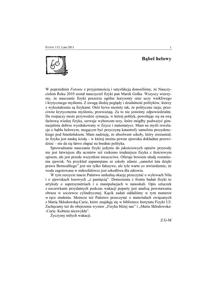 FOTON 113, Lato 2011 1 Bąbel helowy W poprzednim Fotonie z przyjemnością i satysfakcją donosiliśmy, że Nauczycielem Roku 2010 został nauczyciel fizyki pan Marek Golka. Wszyscy wierzymy, że nauczanie fizyki poszerza ogólne horyzonty oraz uczy wnikliwego i krytycznego myślenia. Z uwagą śledzę poglądy i działalność polityków, którzy z wykształcenia są fizykami. Otóż bywa niestety tak, że polityczne racje, przeciwne krytycznemu myśleniu, przeważają. Za to nie jesteśmy odpowiedzialni. Do rozpaczy może przywodzić sytuacja, w której polityk, powołując się na swą fachową wiedzę fizyka, serwuje wyborcom tezy, które mógłby podważyć gimnazjalista dobrze wyedukowany w fizyce i matematyce. Mam na myśli rewelacje o bąblu helowym, mogącym być przyczyną katastrofy samolotu prezydenckiego pod Smoleńskiem. Mam nadzieję, że absolwent szkoły, który zrozumiał, że fizyka jest nauką ścisłą – w której można pewne zjawiska dokładnie przewidzieć – nie da się łatwo złapać na brednie polityka. Sprowadzanie nauczania fizyki jedynie do jakościowych opisów przyrody nie jest łatwiejsze dla uczniów niż rzekomo trudniejsza fizyka z ilościowym opisem, ale jest przede wszystkim nieuczciwe. Oferuje bowiem ułudę rozumienia zjawisk. Na przykład zapamiętane ze szkoły zdanie „samolot lata dzięki prawu Bernoulliego” jest nie tylko fałszywe, ale tyle warte co stwierdzenie, że woda zagotowana w mikrofalówce jest szkodliwa dla zdrowia. W tym zeszycie macie Państwo unikalną okazję przeczytać o wylewach Nilu i o zjawiskach losowych „z pamięcią”. Doniesienia z frontu badań fizyki to artykuły o supersymetriach i o manipulacjach w nanoskali. Opis sztuczek z soczewkami przydatnych podczas wakacji poparty jest analizą powstawania obrazu w soczewce cylindrycznej. Kącik zadań oddaliśmy w tym numerze w ręce studenta. Możecie też Państwo przeczytać o materiałach związanych z Marią Skłodowską-Curie, które znajdują się w bibliotece Instytutu Fizyki UJ. Zachęcamy też do obejrzenia wystaw „Fizyka bliżej nas” i „Maria Skłodowska-Curie. Kobieta niezwykła”. Życzymy miłych wakacji. Z.G-M