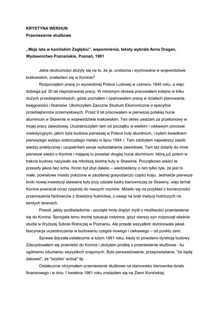 KRYSTYNA WERHUN Przeniesienie służbowe ,,Moje lata w konińskim Zagłębiu”, wspomnienia, teksty wybrała Anna Dragan, Wydawnictwo Poznańskie, Poznań, 1981 Jakie okoliczności złożyły się na to, że ja, urodzona i wychowana w województwie krakowskim, znalazłam się w Koninie? Rozpoczęłam pracę yv wyzwolonej Polsce Ludowej w czerwcu 1945 roku, a więc dobiega już 30 lat nieprzerwanej pracy. W minionym okresie pracowałam kolejno w kilku dużych przedsiębiorstwach, gdzie poznałam i opanowałam pracę w działach planowania, księgowości i finansów. Ukończyłam Zaoczne Studium Ekonomiczne o specyfice przedsiębiorstw przemysłowych. Przez 9 lat pracowałam w pierwszej polskiej hucie aluminium w Skawinie w województwie krakowskim. Ten okres uważam za przełomowy w mojej pracy zawodowej. Uczestniczyłam tam od początku w wielkim i ciekawym procesie inwestycyjnym, jakim była budowa pierwszej w Polsce huty aluminium, i byłam świadkiem pierwszego wytopu srebrzystego metalu w lipcu 1954 r. Tam zdobyłam najwiekszy zasób wiedzy praktycznej i uzupełniłam swoje wykształcenie zawodowe. Tam też dotarły do mnie pierwsze wieści o Koninie i mającej tu powstać drugiej hucie aluminium, którą już potem w trakcie budowy nazywało się młodszą siostrą huty w Skawinie. Początkowo wieści te przeszły jakoś bez echa. Konin był zbyt daleko – wiedzieliśmy o nim tylko tyle, że jest to małe, powiatowe miasto położone w zacofanej gospodarczo części kraju. Jednakże pierwsze kroki nowej inwestycji stawiane były przy udziale kadry kierowniczej ze Skawiny, więc temat Konina powracał coraz częściej do naszych rozmów. Mówiło się na przykład o konieczności przenoszenia fachowców z dziedziny hutnictwa, z uwagi na brak tradycji hutniczych na tamtych terenach. Powoli, jakby podświadomie - poczęła mnie drążyć myśl o możliwości przeniesienia się do Konina. Sprzyjała temu trochę sytuacja rodzinna, gdyż starszy syn rozpoczął właśnie studia w Wyższej Szkole Rolniczej w Poznaniu. Ale przede wszystkim dominowała jakaś fascynacja uczestniczenia w budowaniu czegoś nowego i ciekawego – od punktu zero. Sprawa dojrzała ostatecznie w lutym 1961 roku, kiedy to powołano dyrekcję budowy. Zdecydowałam się przenieść do Konina i złożyłam prośbę o przeniesienie służbowe - ku ogólnemu zdumieniu wszystkich znajomych. Było perswadowanie, przepowiadanie, "że będę żałować", że "szybko' wrócę" itp. Ostatecznie otrzymałam przeniesienie służbowe na stanowisko kierownika działu finansowego i w dniu 1 kwietnia 1961 roku znalazłam się na Ziemi Konińskiej. Muszę przyznać, że pierwsze wrażenia nie były korzystne. Już sam krajobraz, płaski, jednostajny, wydał mi się bardzo ubogi w porównaniu z malowniczymi okolicami Krakowa i Skawiny, gdzie w pogodne dni na horyzoncie widać było szczyty górskie. A tu rysowały się pogórki nasypów i zwałowisk ziemi na terenach odkrywkowych kopalni węgla brunatnego - beznadziejnie szare i smutne. Warunki pracy i życia jak zwykle w początkach były trudne. Mieszkanie na kwaterze prywatnej, na razie bez rodziny, obiady w górniczej stołówce, braki i mankamenty w zaopatrzeniu, brak rozrywek kulturalnych. Obraz Konina z tego czasu tak utrwalił się w mojej pamięci. Na ulicach i placach osiedla, nie uporządkowanych, nie zazielenionych, wiejący ciągIe wiatr wznieca tumany kurzu i piasku, który piecze pod powiekami i zgrzyta między zębami. Noszę stale ciemne okulary nie tyle dla ochrony przed słońcem, ile przed zaprószeniem oczu. Dokucza brak stałej komunikacji miejskiej między starym i nowym Koninern. Odległość trzech kilometrów pokonuje się z konieczności per pedes, bo i taksówka jest rzadkością. Denerwujące braki w zaopatrzeniu wynikające przeważnie z nieudolności aparatu handlu. Na przykład na osiedlu liczącym już kilka tysięcy mieszkańców nie było w tym czasie ani jednego sklepu z branży tekstylnej, odzieżowej, chemicznej, drogeryjnej, nie było nawet apteki. Wiele do życzenia pozostawiała jakość wędlin i pieczywa, a my z południa Polski byliśmy przyzwyczajeni do dobrych krakowskich wędlin. Zupełny brak rozrywek kulturalnych, brak porządnego kina. Na osiedlu egzystowało stare kino "Energetyk" w jakimś małym zastępczym lokalu. W następnym roku lokal przeznaczono do rozbiórki w związku z budową nowego osiedla mieszkaniowego Konin III, pozostało więc tylko kino "Górnik'" w starym Koninie. Gdy przyszedł czas remontu tego kina, przez dłuższy czas byliśmy zupełnie pozbawieni możliwości oglądania filmów .. Ograniczone godziny urzędowania poczty. W 1961 roku był na osiedlu tylko jeden Urząd Pocztowy Konin 2, pracujący tylko do godziny 18. Ograniczone godziny otwarcia sklepów spożywczych, przeważnie do godziny 17 lub 18. Brak lokali gastronomicznych. Była tylko jedna restauracja, ,,Kolorowa", ani jednego baru mlecznego, ale za to nie istniejący już dziś, osławiony bar ,,Czarna Mańka", obficie zaopatrzony w napoje alkoholowe i piwo. Walczyliśmy z tymi wszystkimi trudnościami, interweniowały rada zakładowa i dyrekcja huty w Komitecie Powiatowym PZPR, w Wydziale Handlu na szczeblu powiatu i województwa. I tak dzień po dniu, miesiąc po miesiącu budowało się nie tylko przemysł, ale i nowe oblicze miasta. Nawiązaliśmy kontakty z tutejszymi ludźmi, znawcami i miłośnikami tutejszego regionu, należał do nich nieodżałowanej pamięci mgr Zygmunt Pęcherski, który pierwszy odkrył i pokazał nam skarby Ziemi Konińskiej. Bo na pozór szara i smutna Ziemia Konińska posiada swoje ukryte skarby. Pierwszy, ważny dla rozwoju życia gospodarczego, to pokłady węgla brunatnego. To ich obecność jako źródła wytwarzania taniej energii elektrycznej zadecydowała o lokalizacji huty aluminium. Drugie bogactwo - to piękne jeziora położone w promieniu kilkunastu kilometrów od Konina i stanowiące bazę wypoczynkow